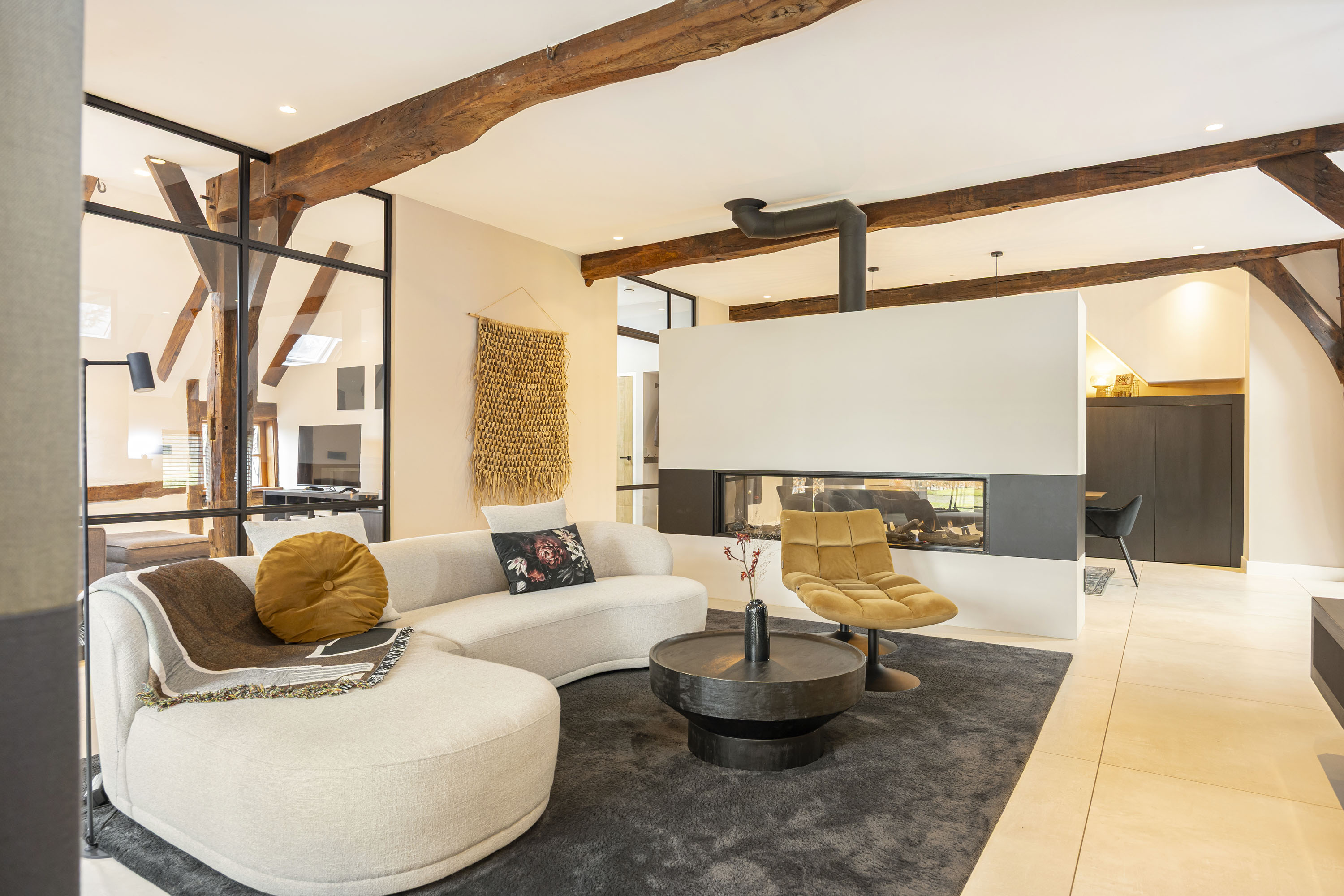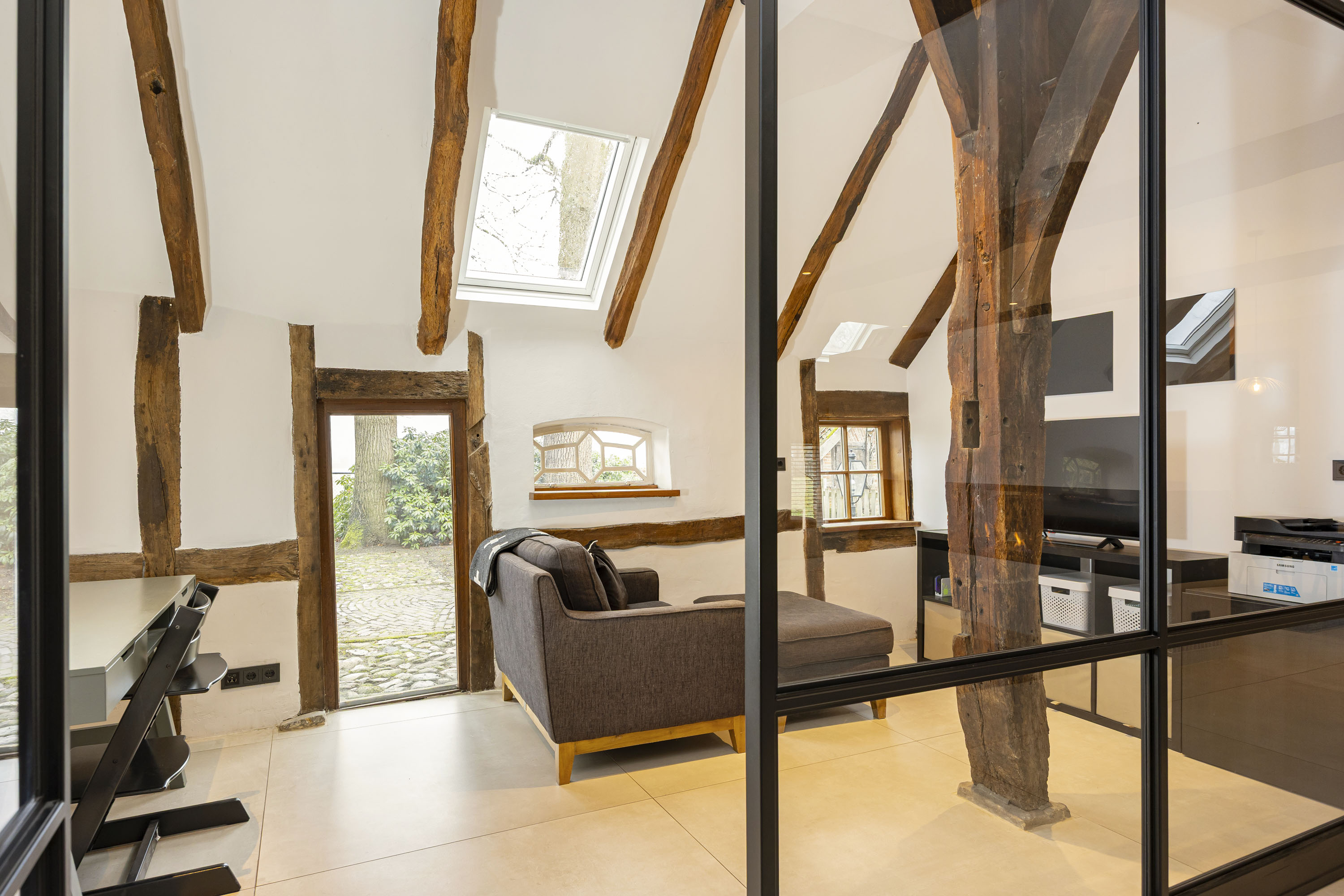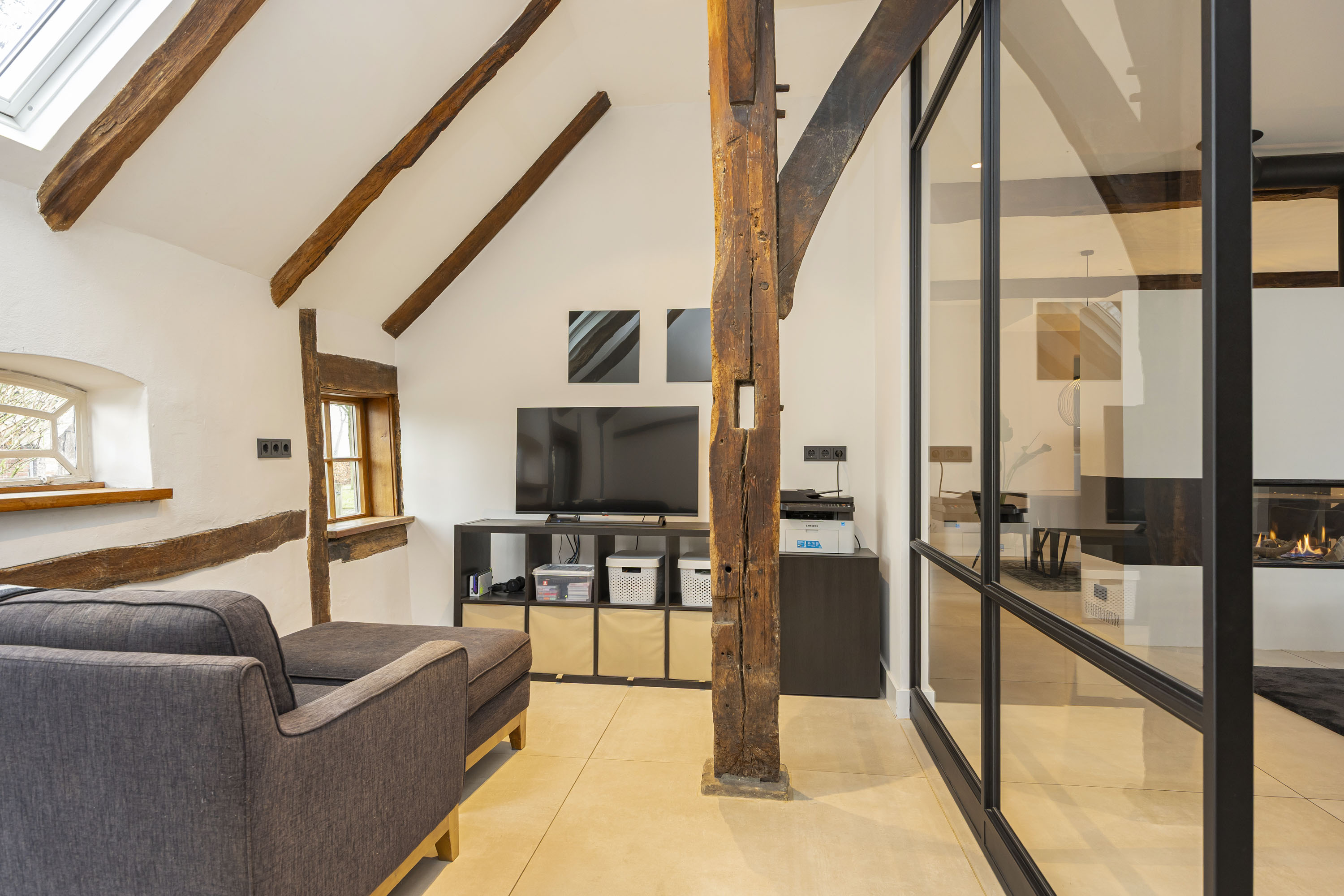 The ground floor includes a spacious modern kitchen, a living room divided into a dining and sitting area by a gas fireplace, a children’s play corner, a fitness room, a utility room, several storage rooms and—last but not least—a beautiful bedroom with a luxurious ensuite bathroom. At the front of the farmhouse, you will find the traditional “onderschoer”, a small covered and intimate terrace.