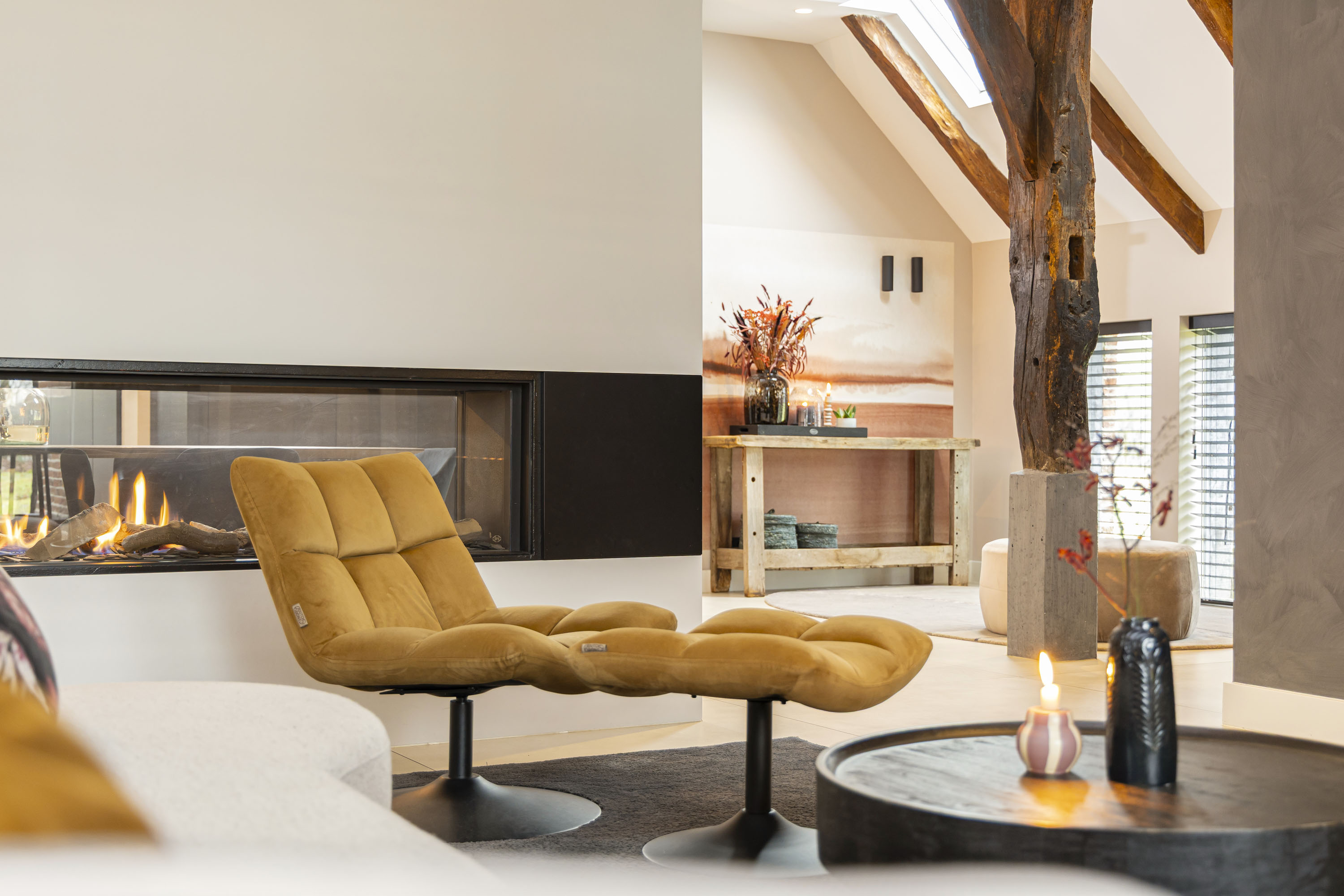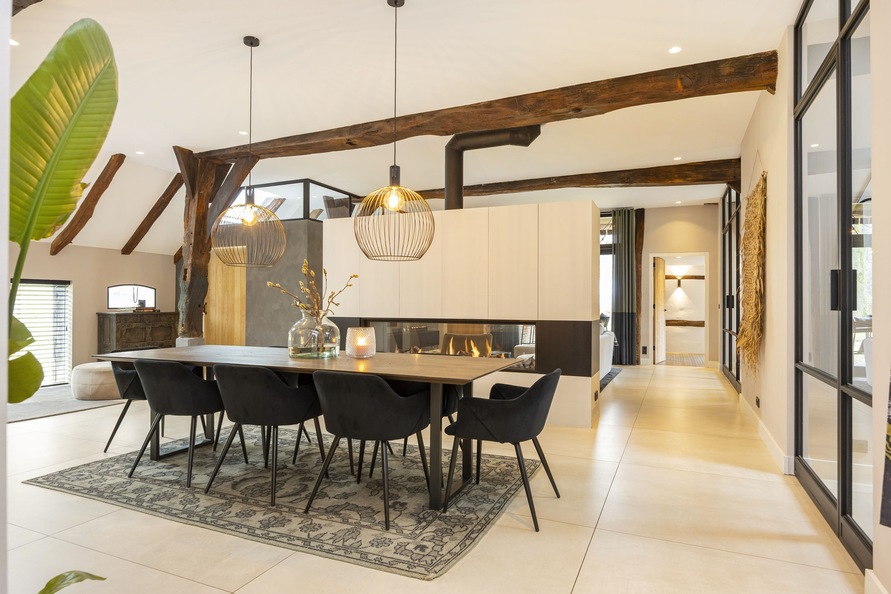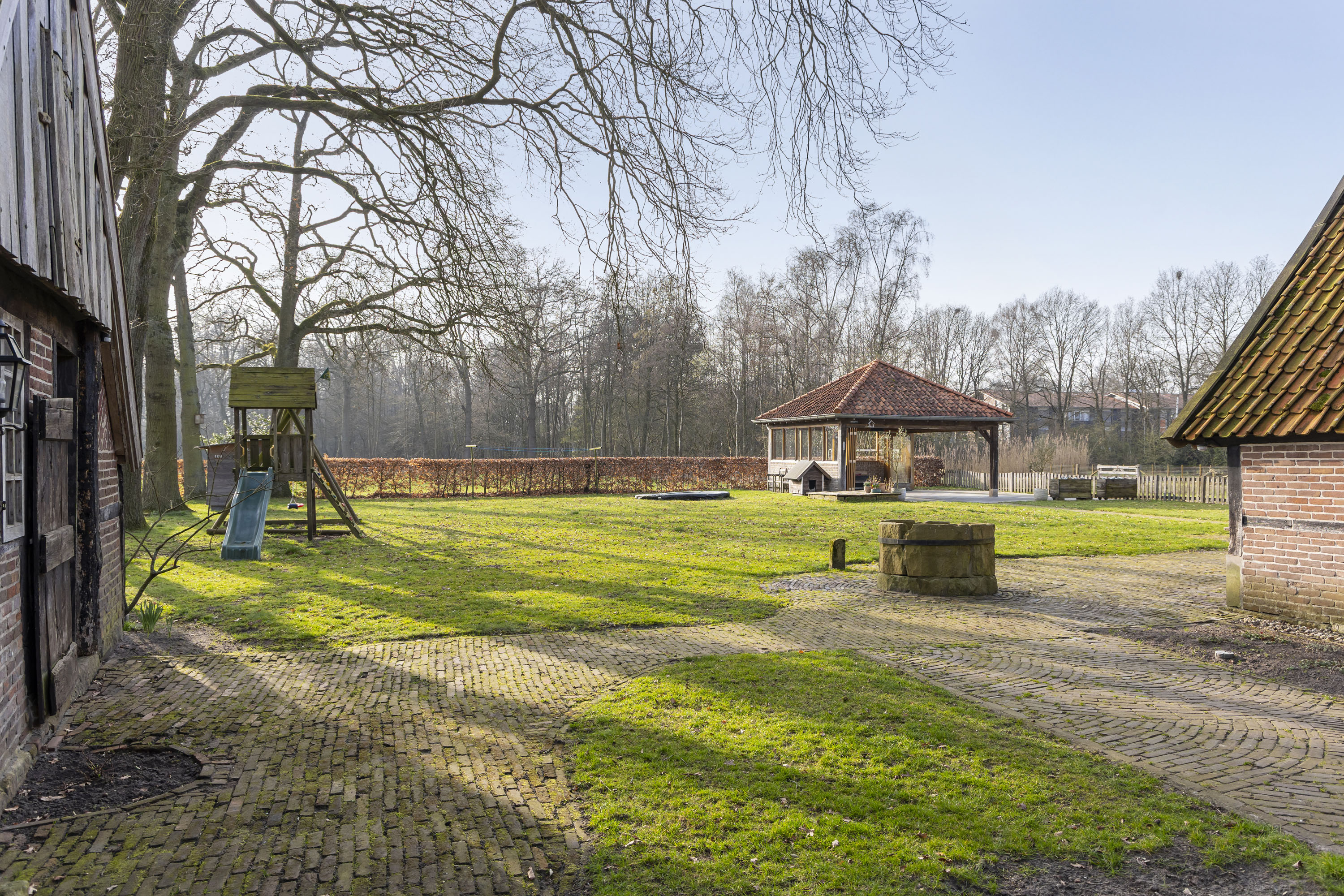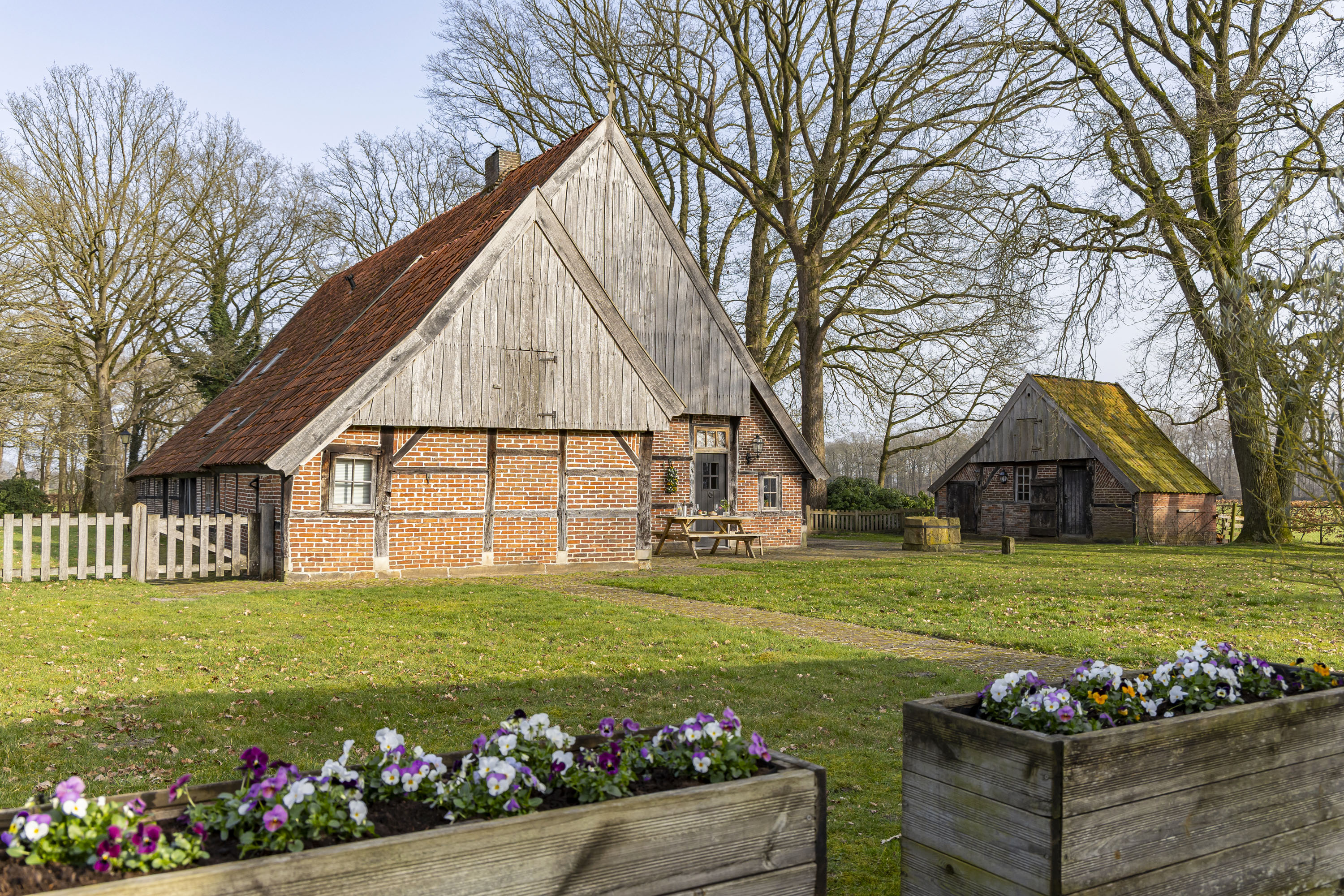 Rural living at its finest in the countryside of Denekamp. This characteristic, monumental and fully renovated farmhouse with several outbuildings is beautifully tucked away in the lush landscape of northeast Twente. The authentic appearance of the Saxon-style farmstead—with its robust half-timbered façades, refined window mullions, nostalgic outbuildings, majestic oak trees and driveways and terraces paved with traditional baked bricks—creates an exceptionally charming and rustic atmosphere.