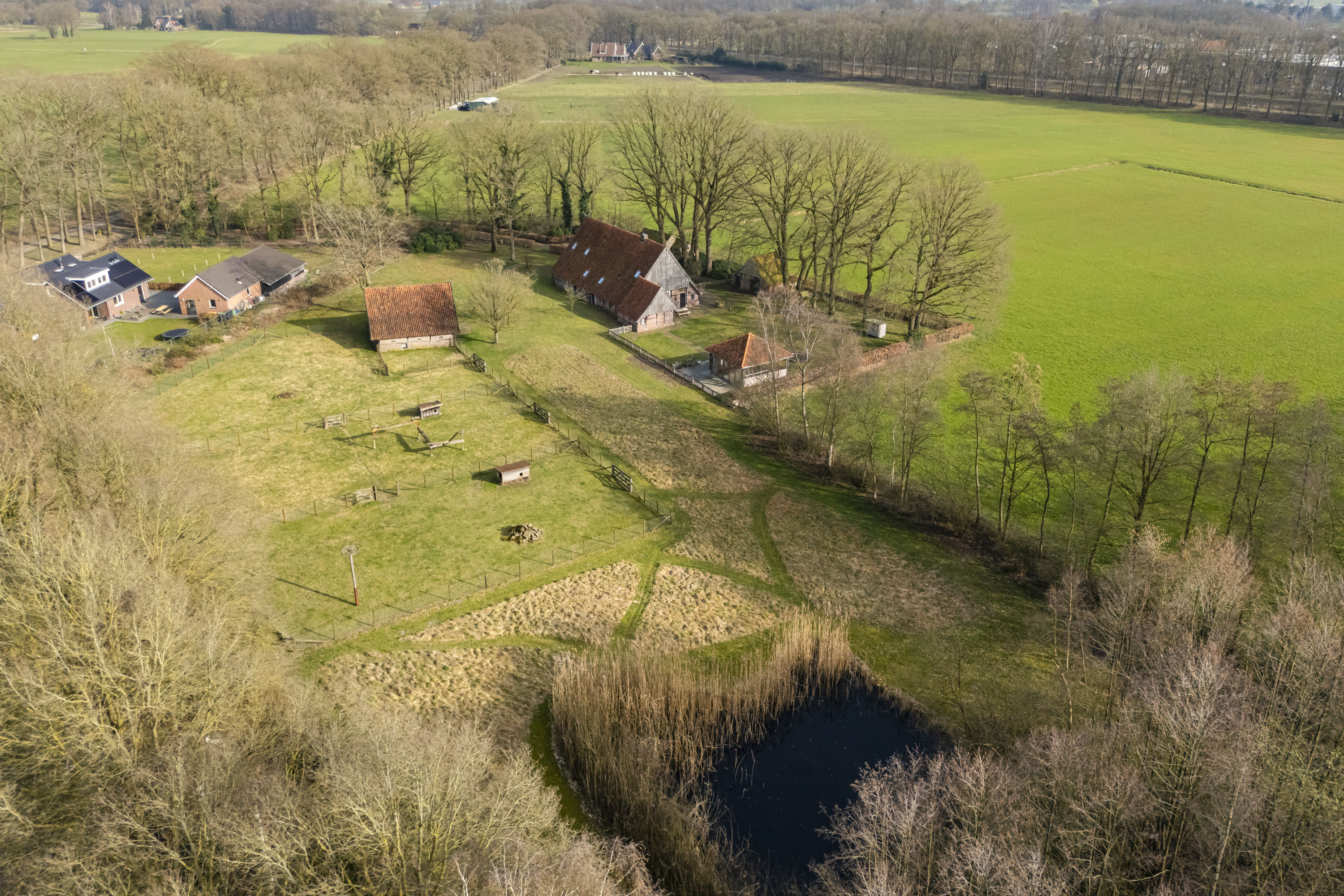 From the Lubberdinksweg, a long driveway lined with monumental oak trees and a beech hedge leads to the private parking area. The spacious country garden, surrounded by green meadows and mature trees, offers privacy and a naturally relaxed atmosphere. The stylish farmhouse with nostalgic outbuildings and traditional layout of the grounds give the property a charming rural character. With multiple terraces—including the inviting garden room—this is an ideal place to enjoy outdoor living in every season.