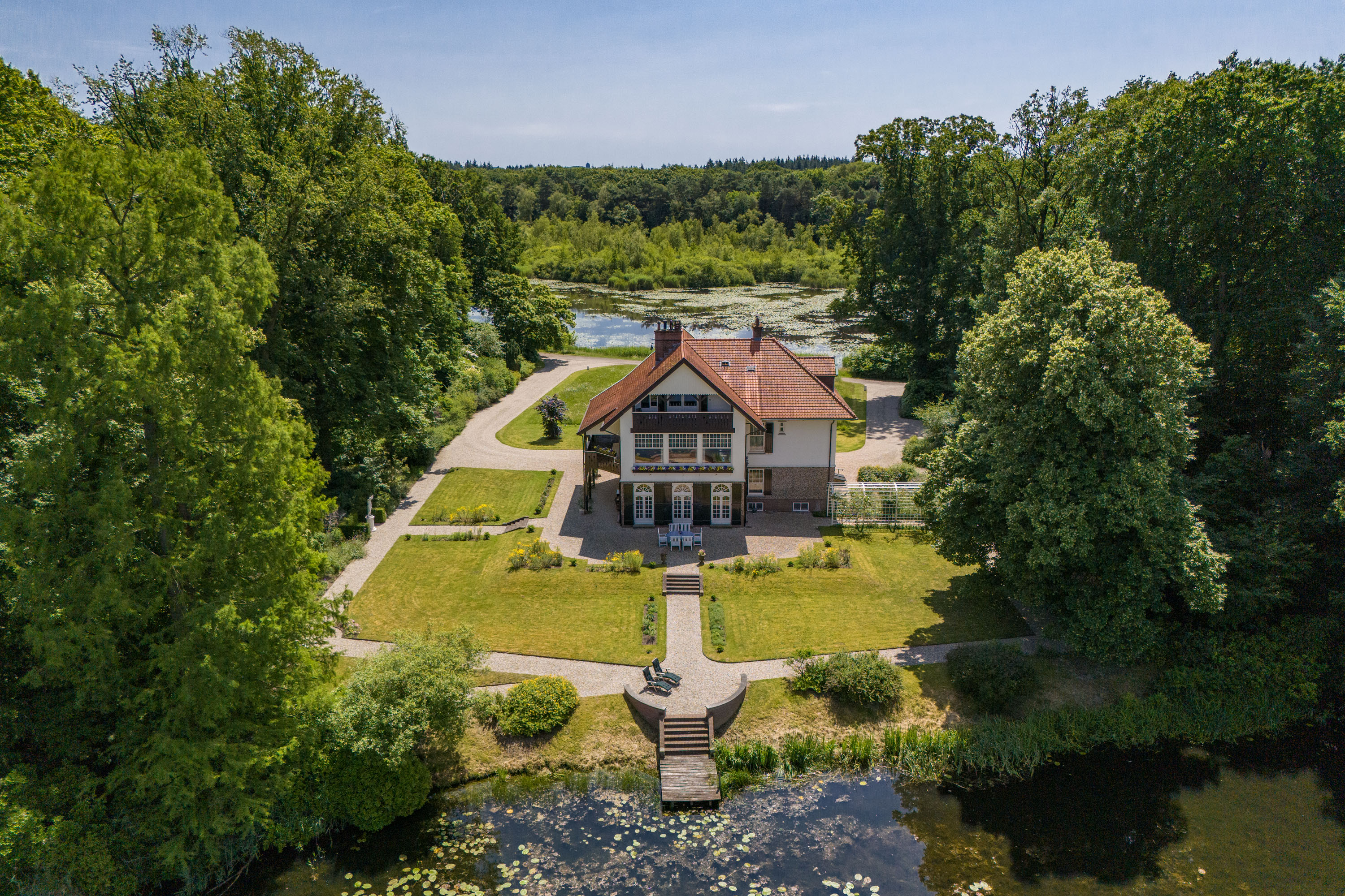 Over the past decade the current owners have made every effort to restore the estate to its former glory. Together with Landschap Overijssel and several renowned partners a restoration plan was carried out for both the garden and the park. Everything was done in line with the intentions of landscape architect L.A. Springer, who designed the estate in the early 1900’s. The two main sightlines from the house to the lakes have been restored as well as several sightlines on both sides of the house, including the so-called maid's lane leading to the nearby farmhouse. The restoration and (re)design of the rose garden, borders, lawns with garden ornaments, ornamental forest edges, decorative shrubbery, park layout with old trees, orchard, and wildflower meadow with historical ornamental plants were completed, complementing the garden and park. It is almost inconceivable how many plants and shrubs have been planted in recent years.