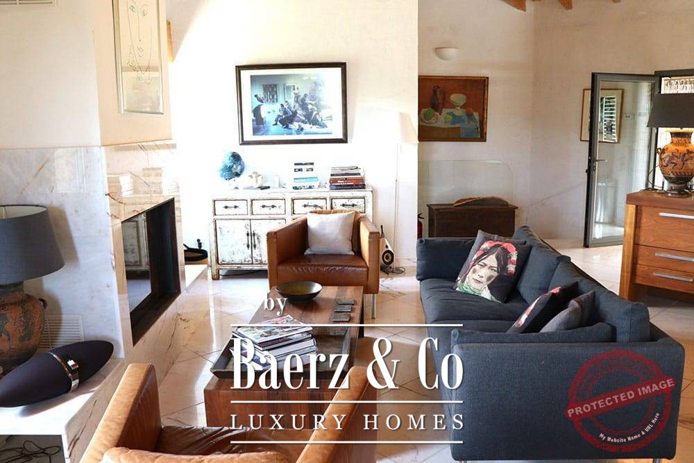 • On the upper floor, also the entrance to the villa, is a large cosy living room with fireplace and a beautiful beamed ceiling, an open-plan kitchen and an office or television room with French doors opening onto the terrace.