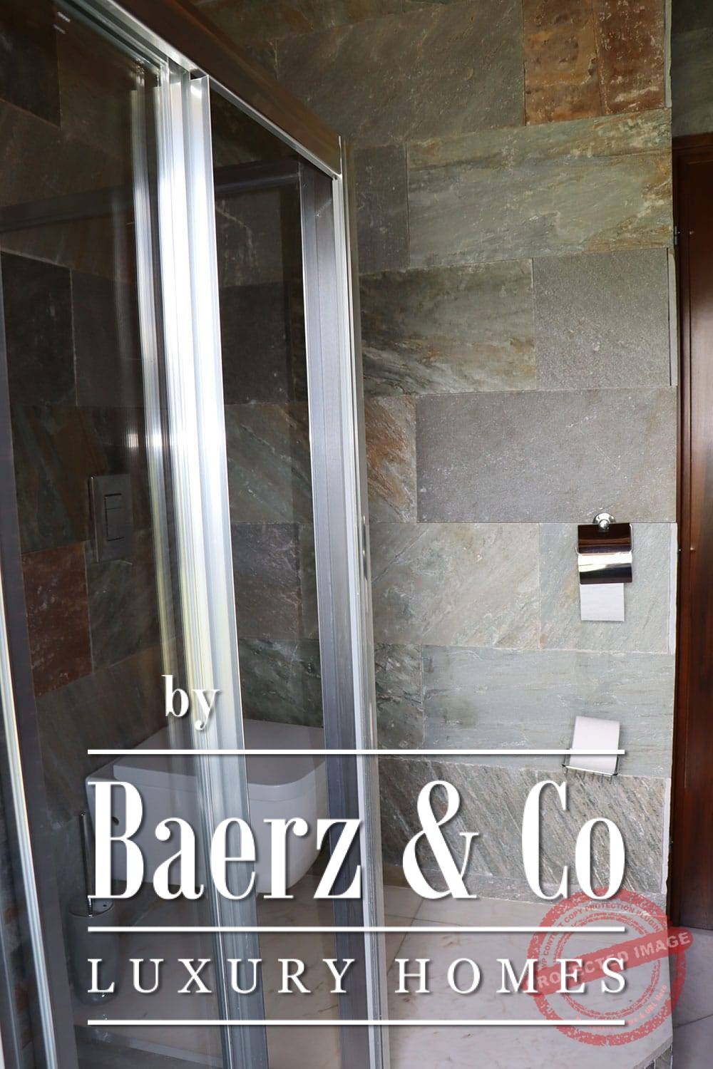 All bedrooms have French doors opening onto the lower terrace with stunning views of the vast mountain landscape. The master bedroom has a large bathroom with bath, a separate shower, two marble basins, toilet and bidet. The second bedroom has a bathroom with two designer sinks, wc, and shower. The third bedroom (the studio), with its own entrance via the lower terrace, has a bathroom with designer washbasin, shower and wc. All bedrooms have a fixed wardrobe. There is a large built-in linen cupboard in the downstairs corridor.