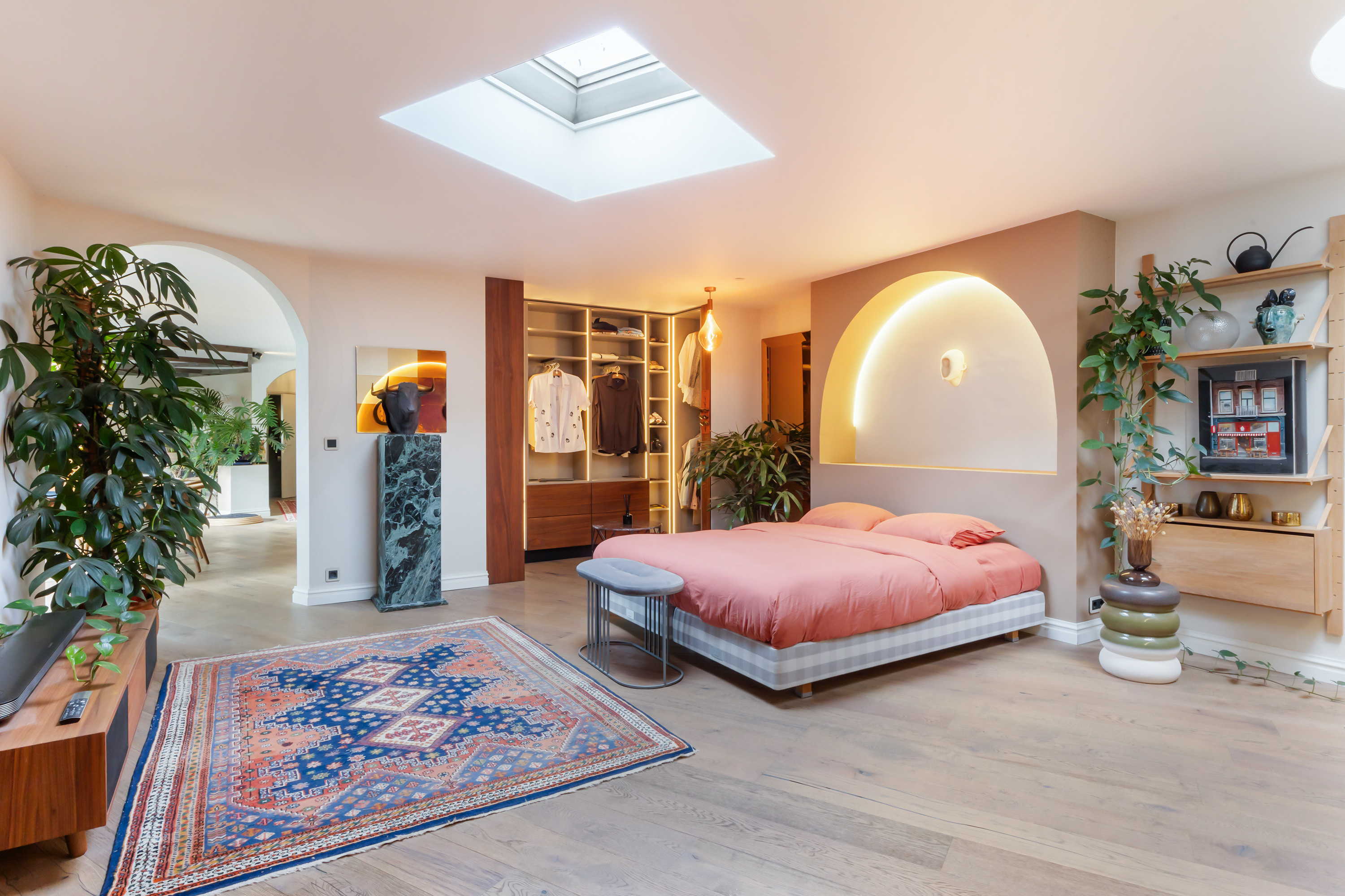 The living room, with oak flooring and open fireplace, is bright and spacious thanks to the glazed rear façade overlooking the terrace and garden. The bespoke kitchen, crafted in walnut with stainless steel worktops and Miele appliances, forms the heart of the home.