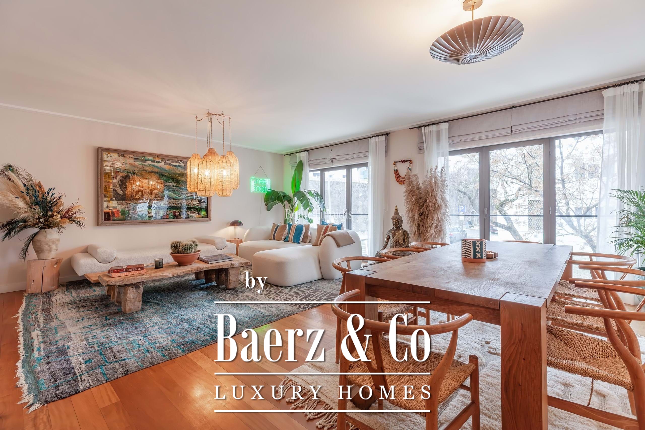 An open living and dining room, illuminated by floor-to-ceiling windows, draws in natural light while offering fluid movement to a private balcony overlooking landscaped gardens. Warm wooden floors lend a sense of quiet elegance, and the fully equipped kitchen features integrated appliances, ample storage, and a practical layout complemented by a dedicated laundry area. The primary suite is defined by a serene atmosphere, built-in wardrobes, and a well-appointed bathroom finished in natural stone. Each additional bedroom is adaptable, whether for family life, guests, or a home workspace.