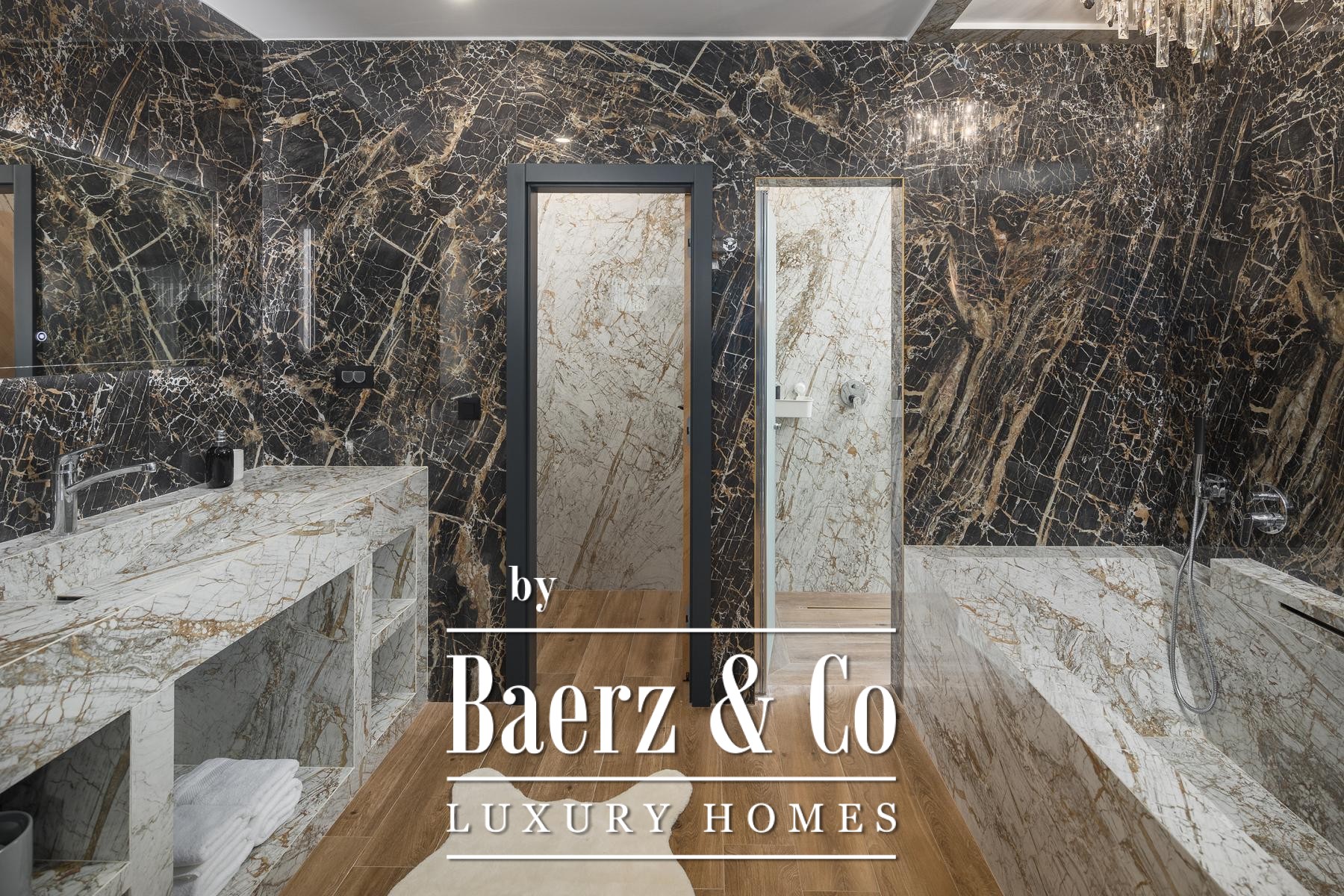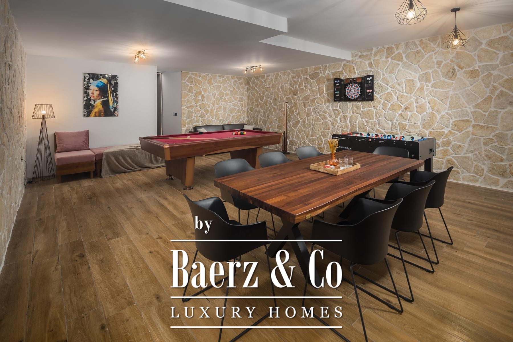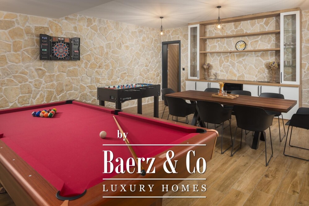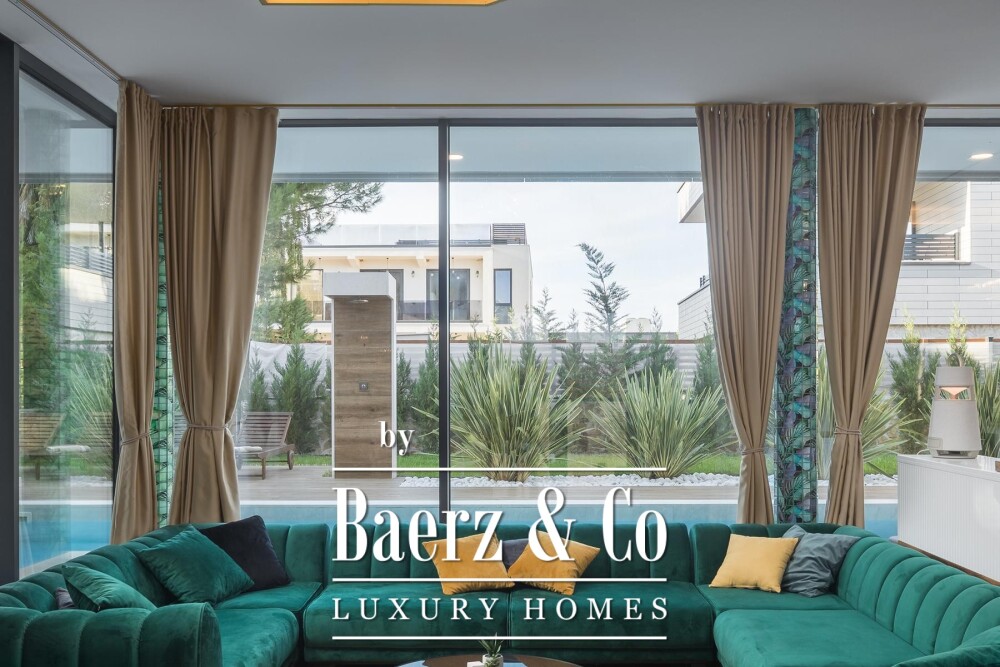The residence is finished with refined materials and equipped for both comfort and privacy. On the ground level, spa facilities include a sauna, a jacuzzi and outdoor showers, while an expansive outdoor kitchen with a wood and charcoal grill awaits in the garden. The lower floor is dedicated to leisure, featuring a cinema hall, bar and games area.
