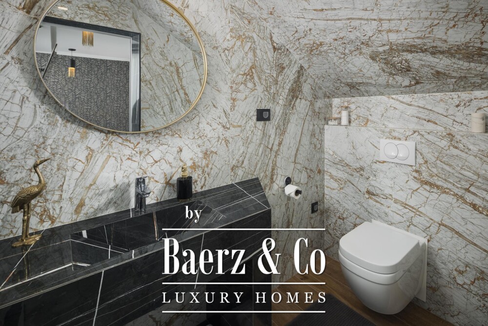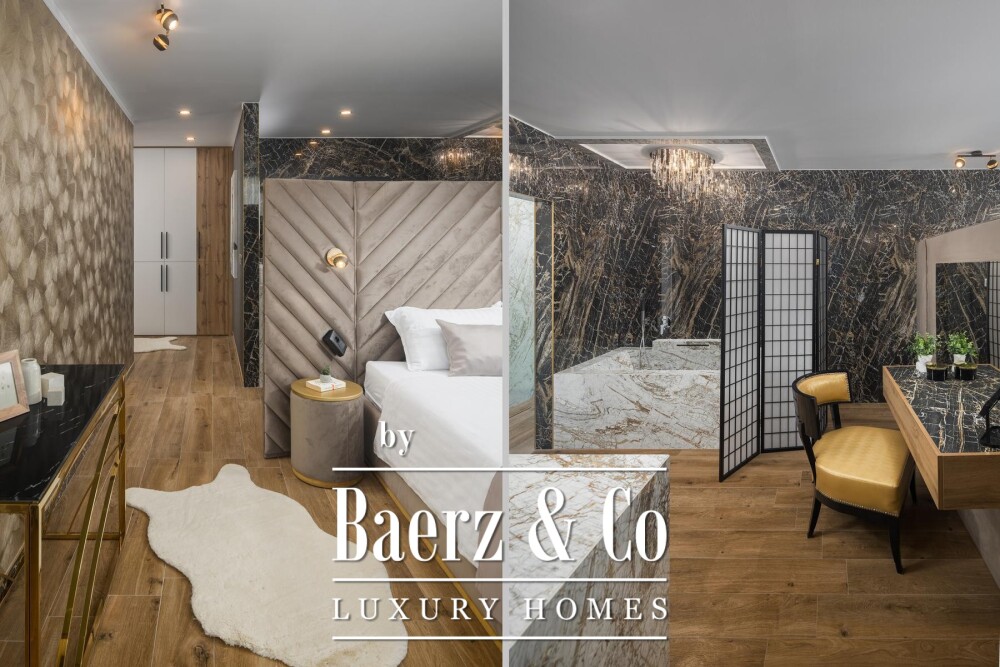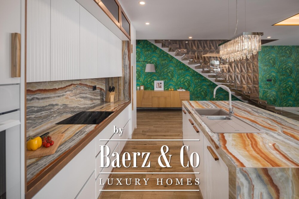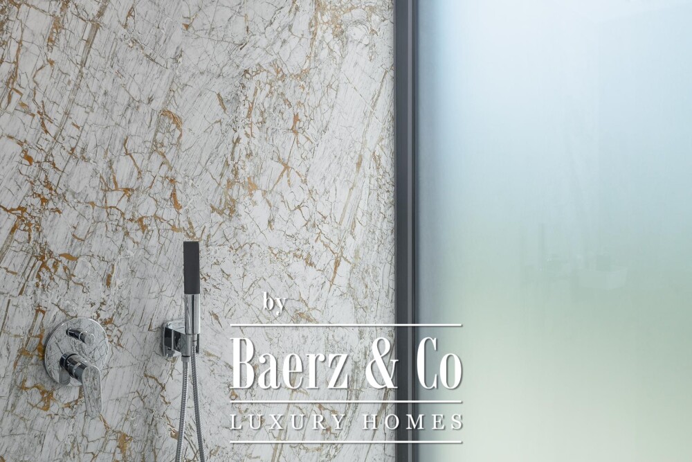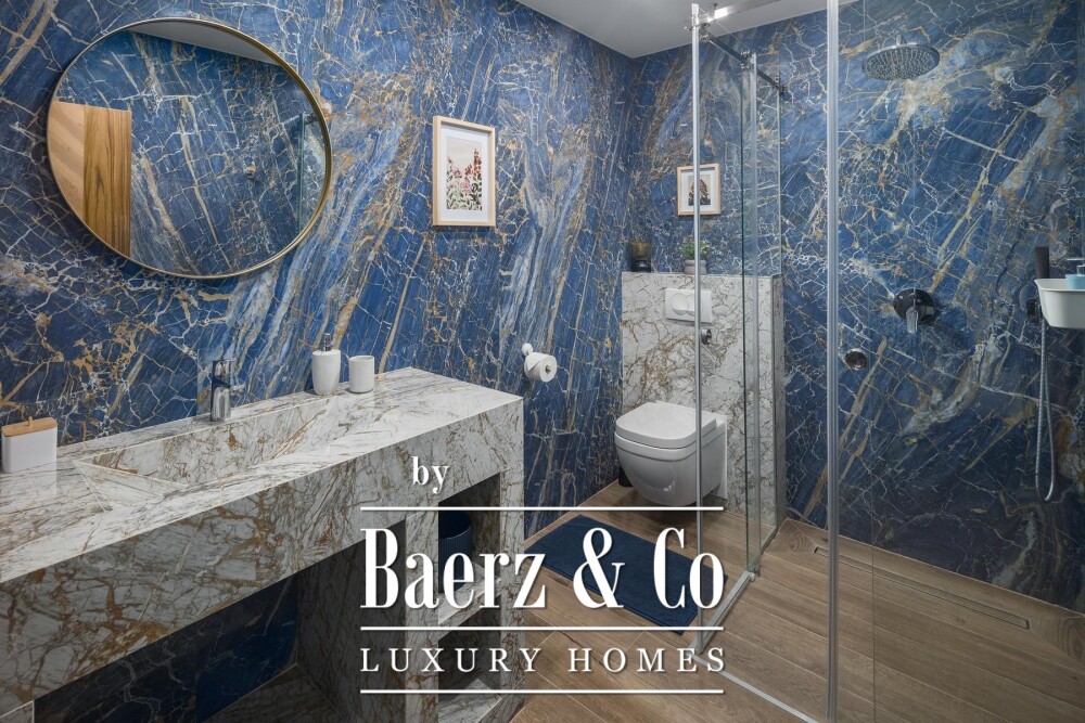 Upstairs, four bedrooms each offer private en suite bathrooms, while one opens onto a spacious balcony and an 80 m² roof terrace with views of the sea. Underfloor heating, air conditioning and solar water heating ensure consistent comfort year-round.