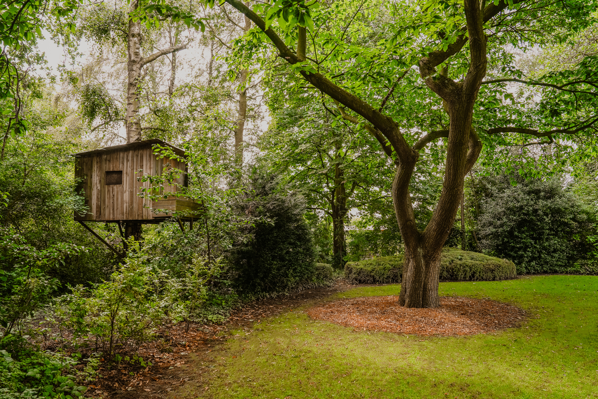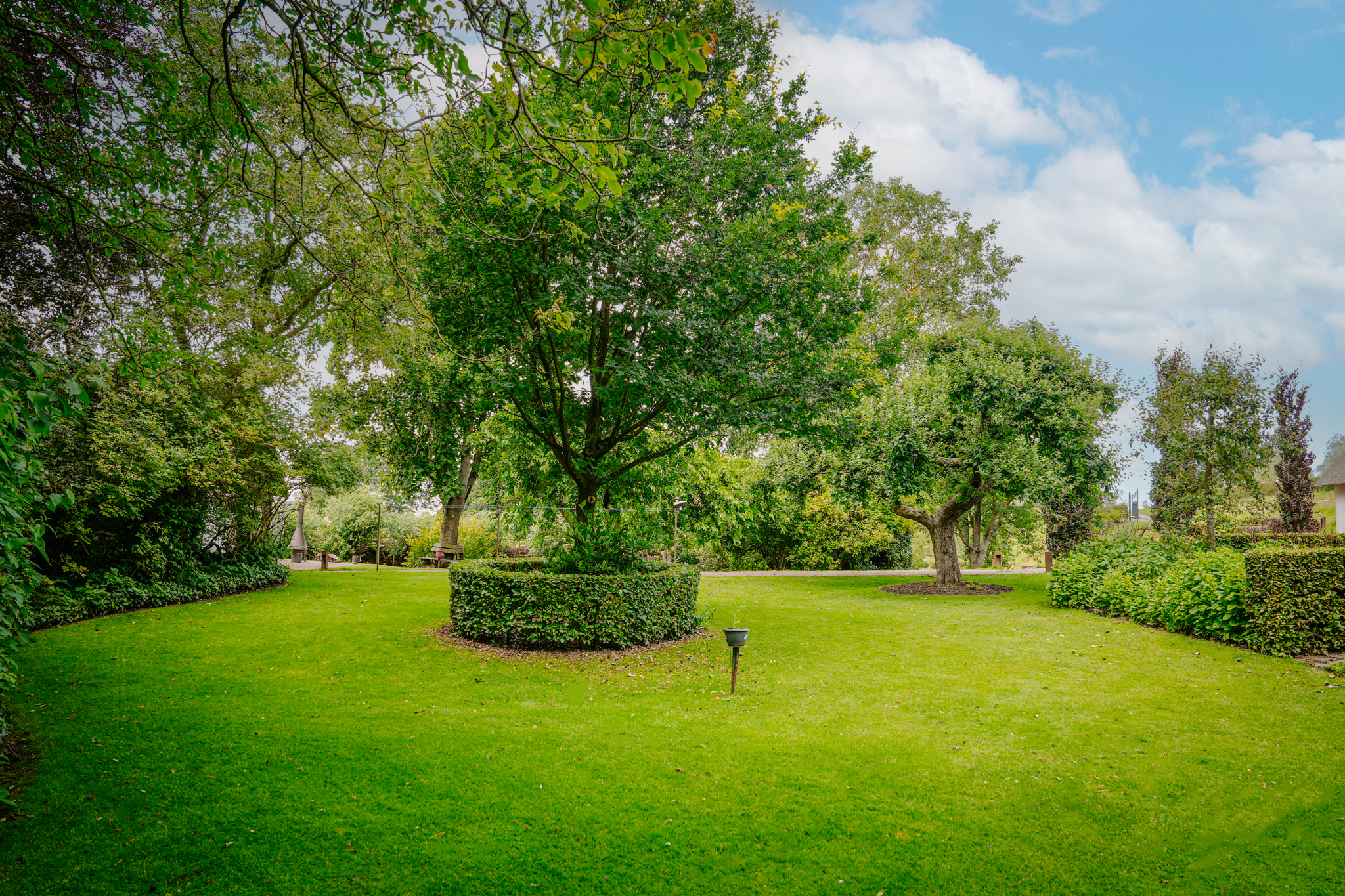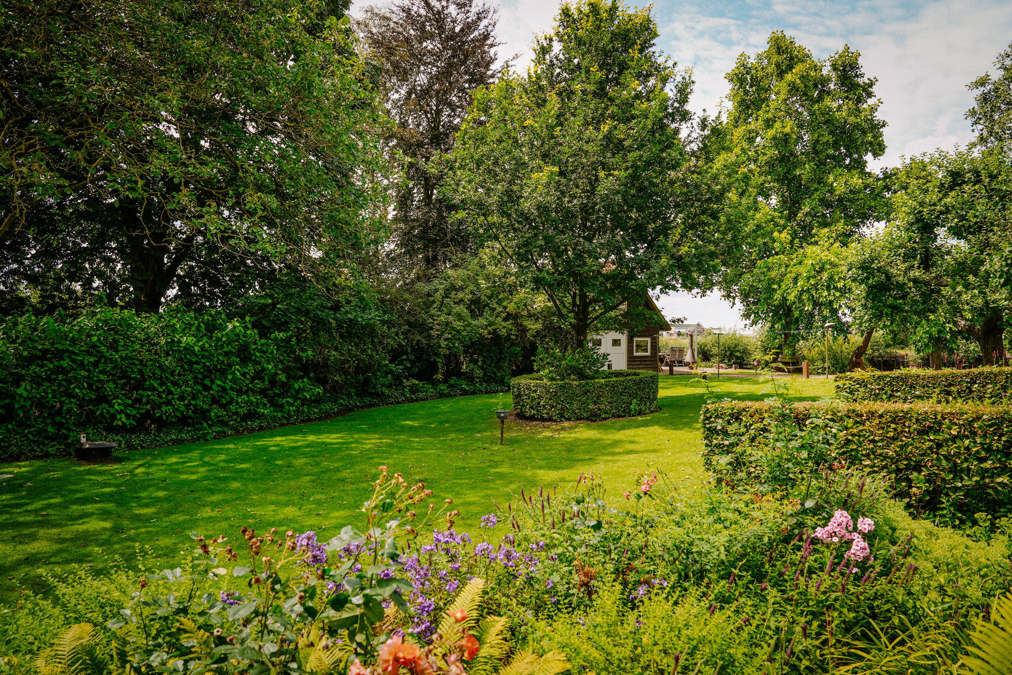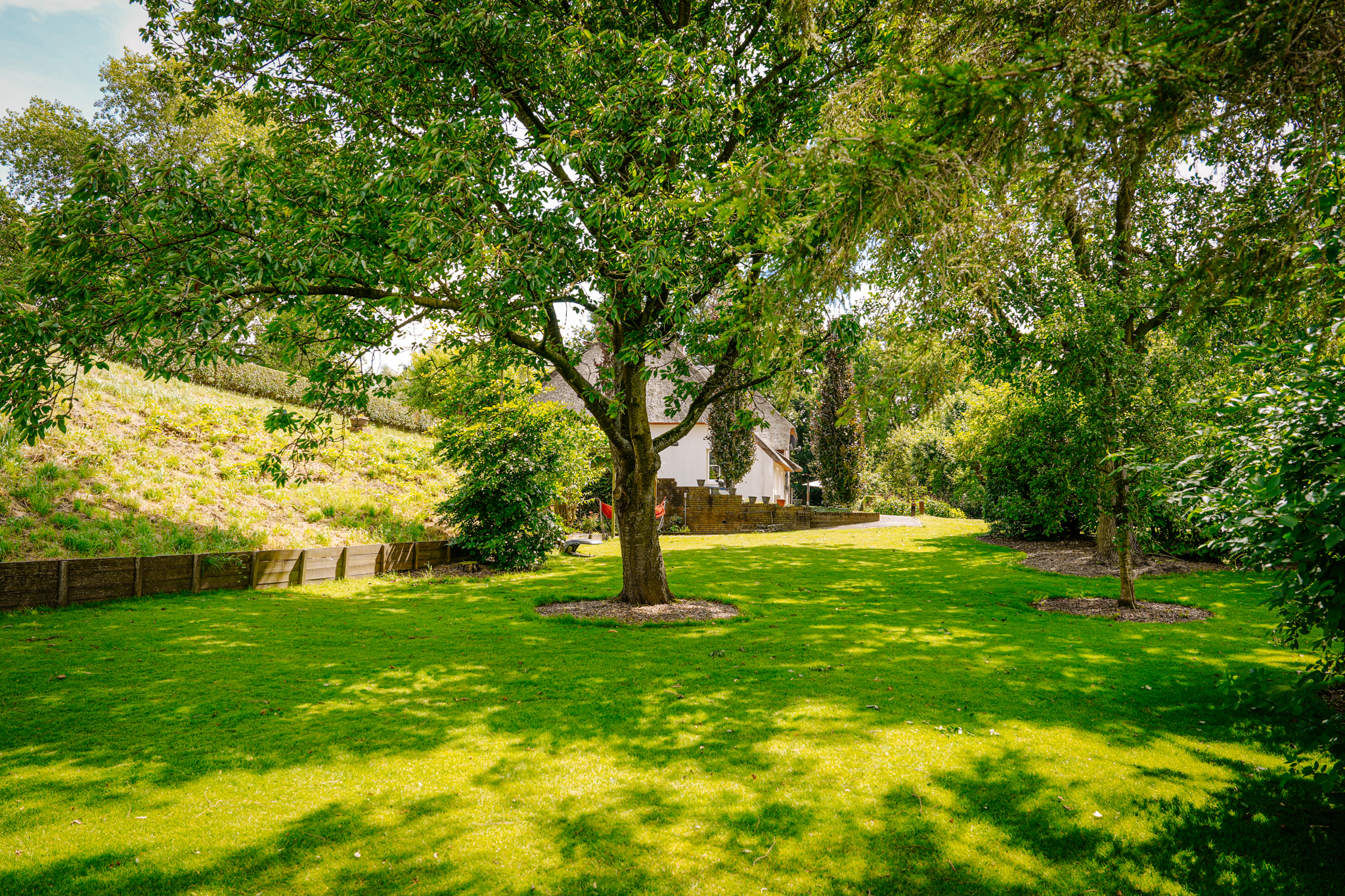 T-farmhouse with a detached outbuilding and a beautifully landscaped landscape garden with mature (fruit) trees facing south.