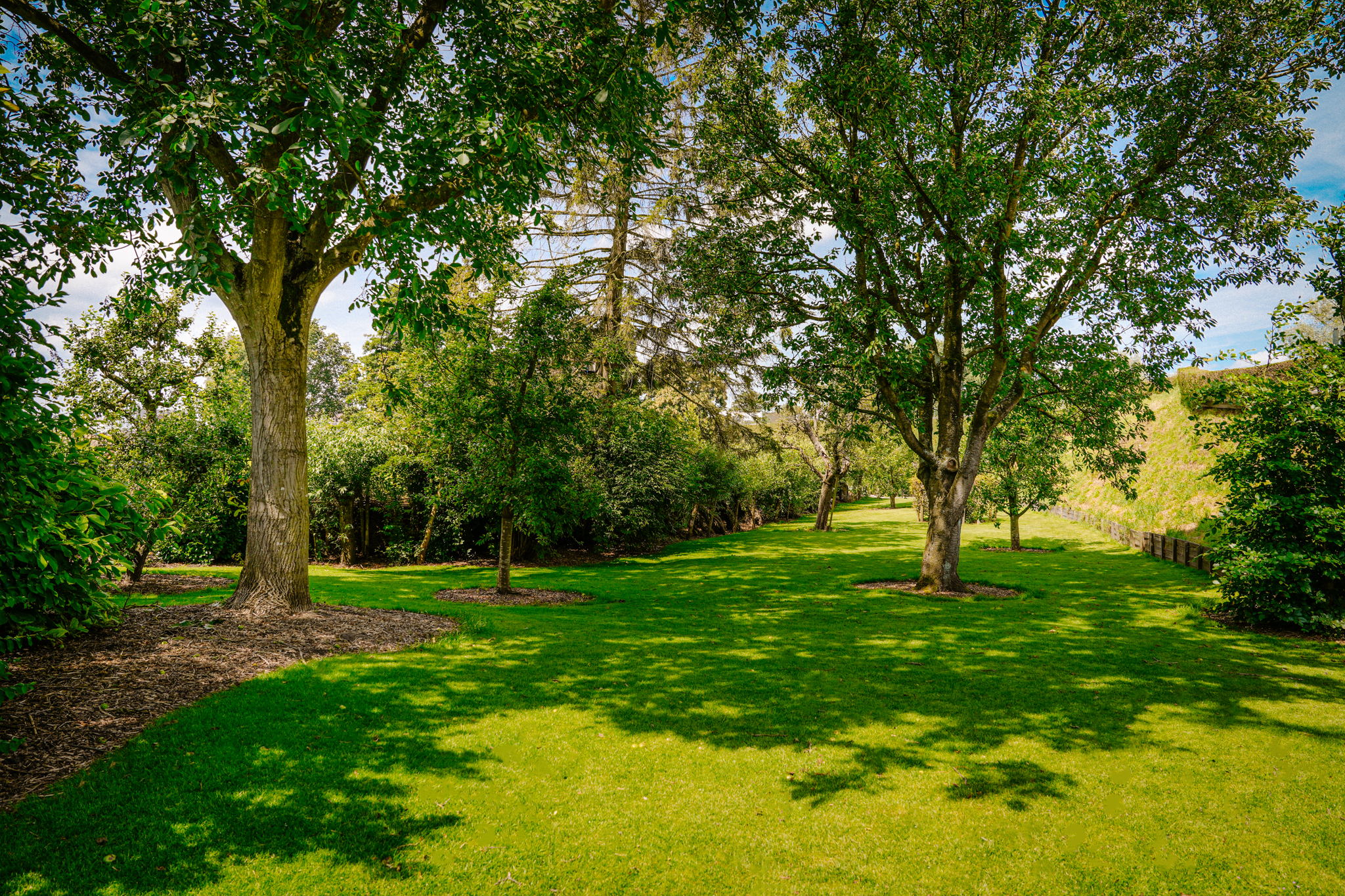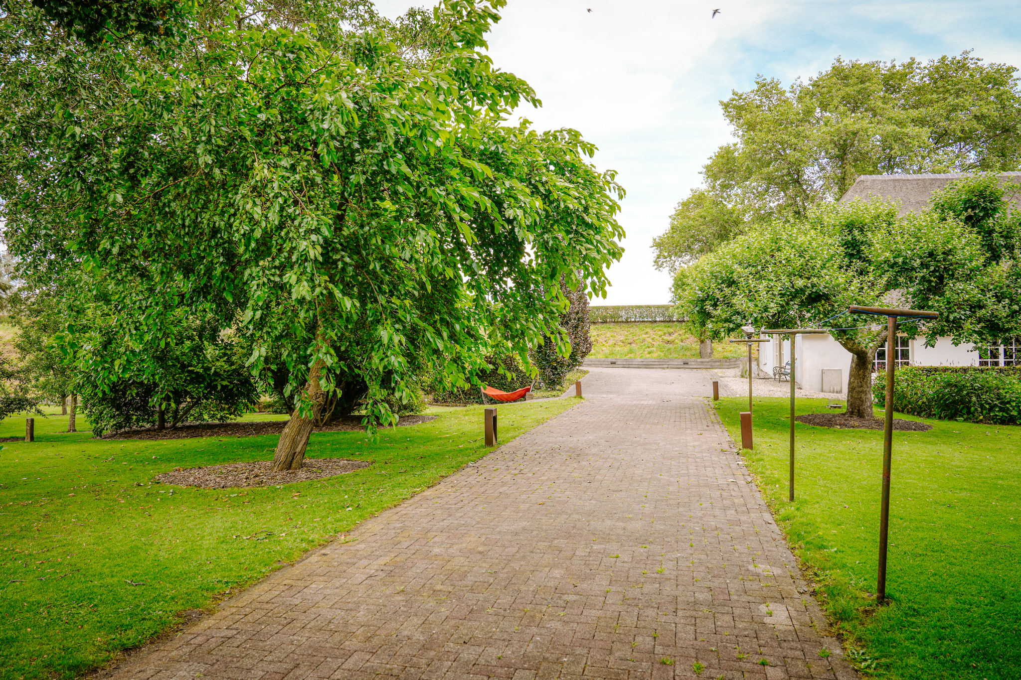 The paved driveway with electric gate and lighting leads to the farmhouse and outbuilding. The south-facing landscape garden is bordered on the ditch side by pollard willows. There is a lawn, mature trees, and standard fruit. On the other side of the farmhouse is a walking/cycling dike from where you have beautiful views of the river Waal and its floodplains.