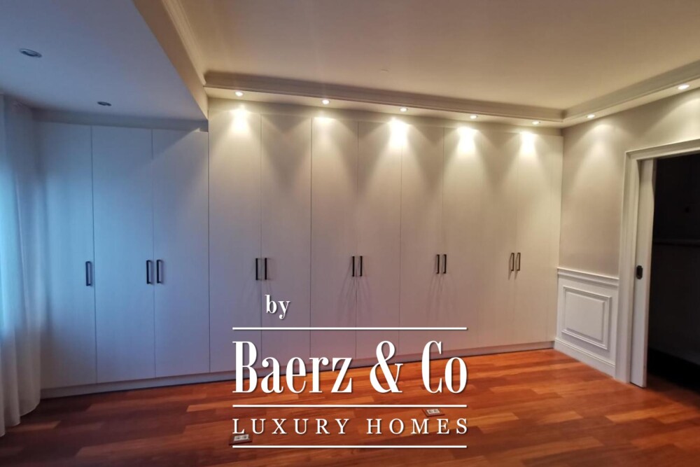 The lower level features two spacious bedrooms, both with walk-in closets and garden access, complemented by a further bathroom. Throughout, the apartment makes deliberate use of quality materials, new installations, and underfloor heating in bathrooms. The interior was renovated in 2019, with first-class parquet and considered finishes shaping every space.