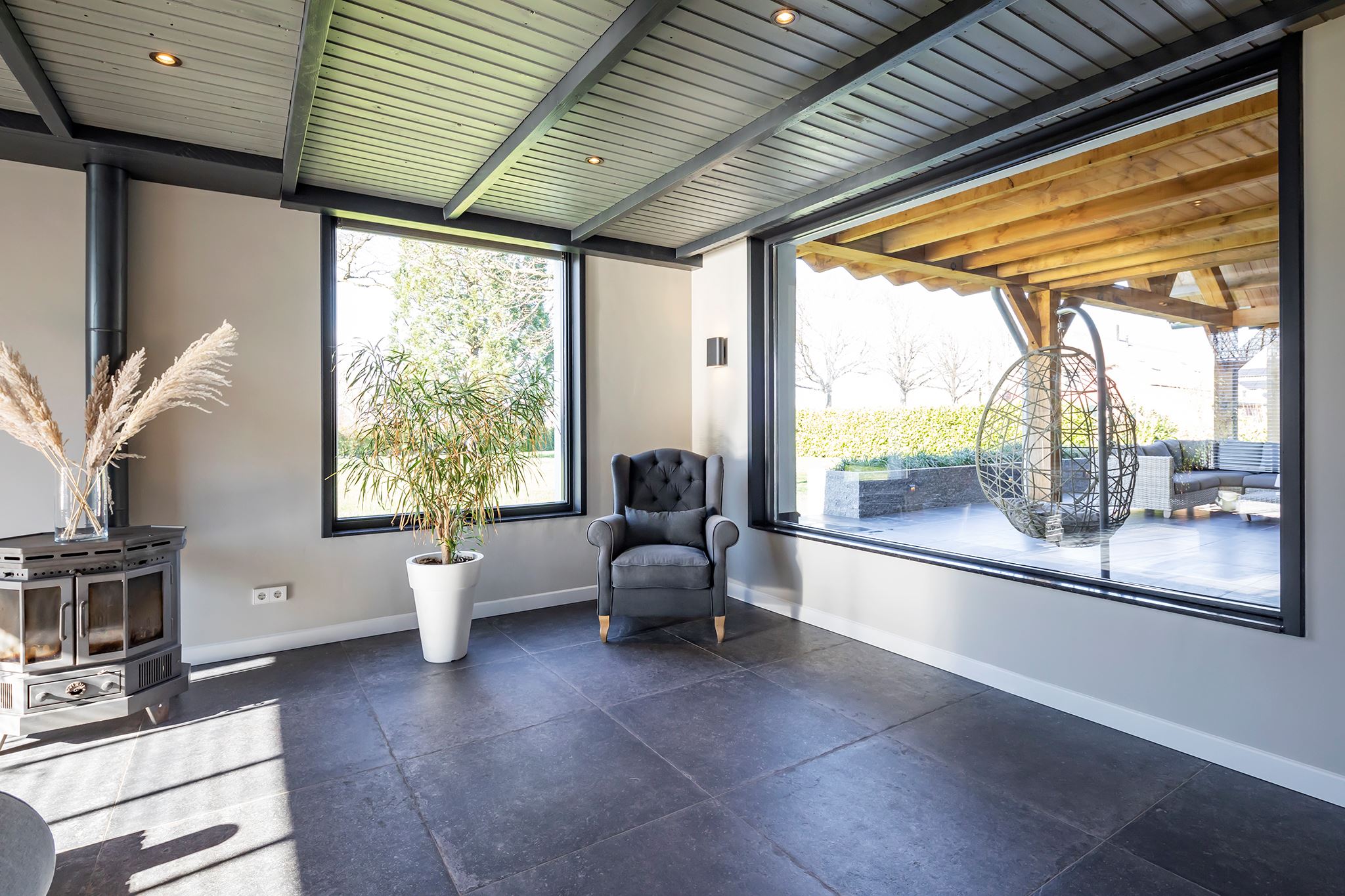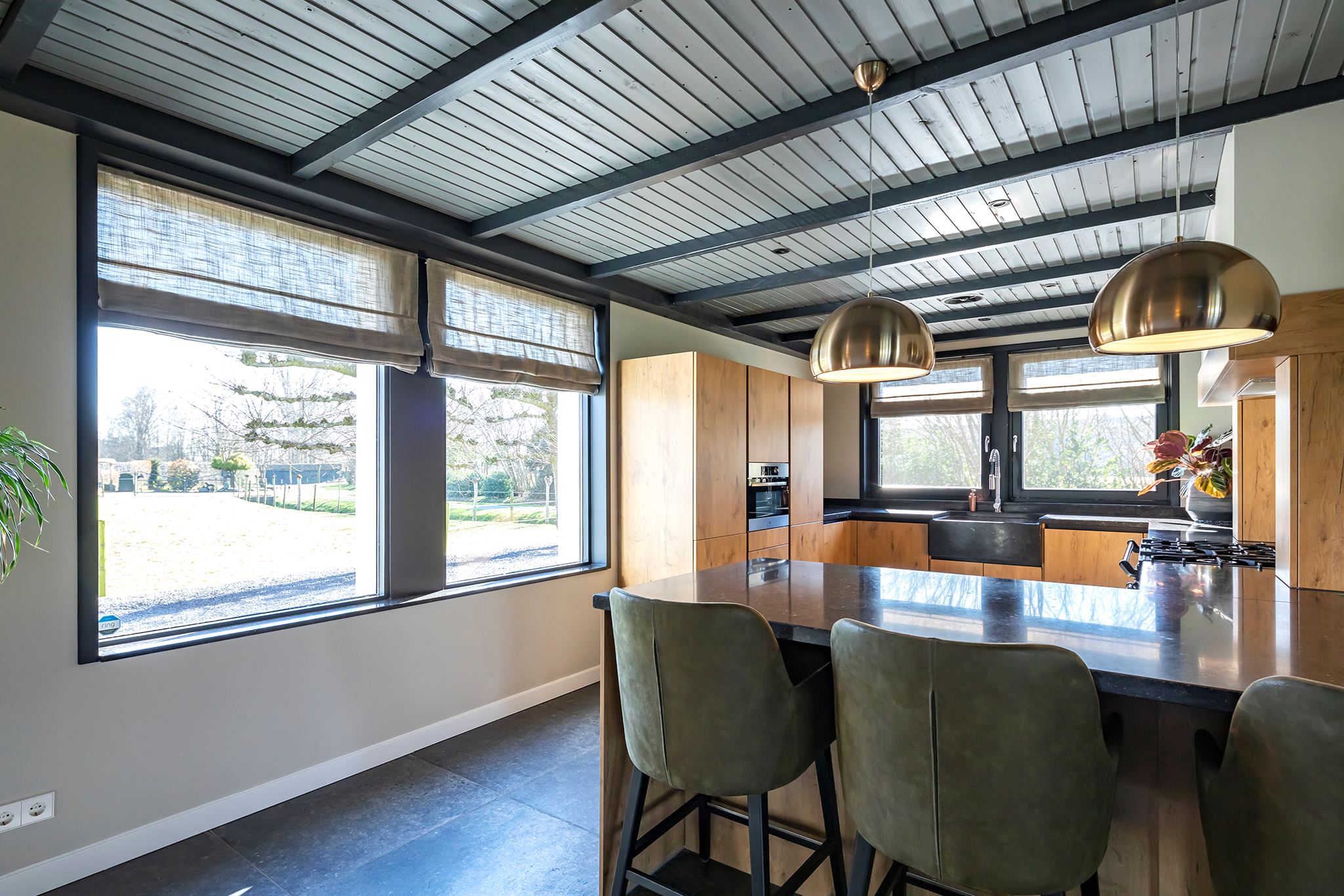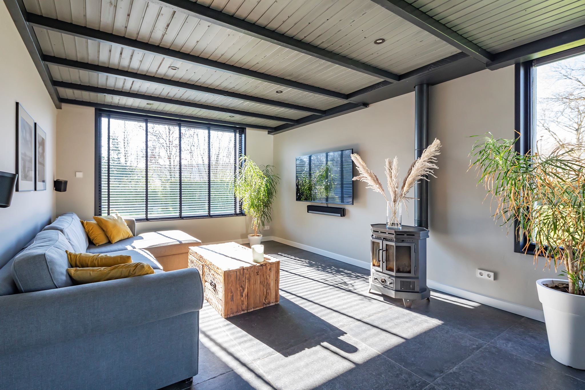 The surrounding garden with various mature trees and is neatly maintained, has a large lawn and a spacious covered terrace. This canopy made of Douglas fir and oak wood is a true eye-catcher! You can sit here with your family, friends or family. There is room for both a large garden table and a lounge set. The outdoor fireplace ensures that you are always comfortable here, even when it gets a little chilly outside.