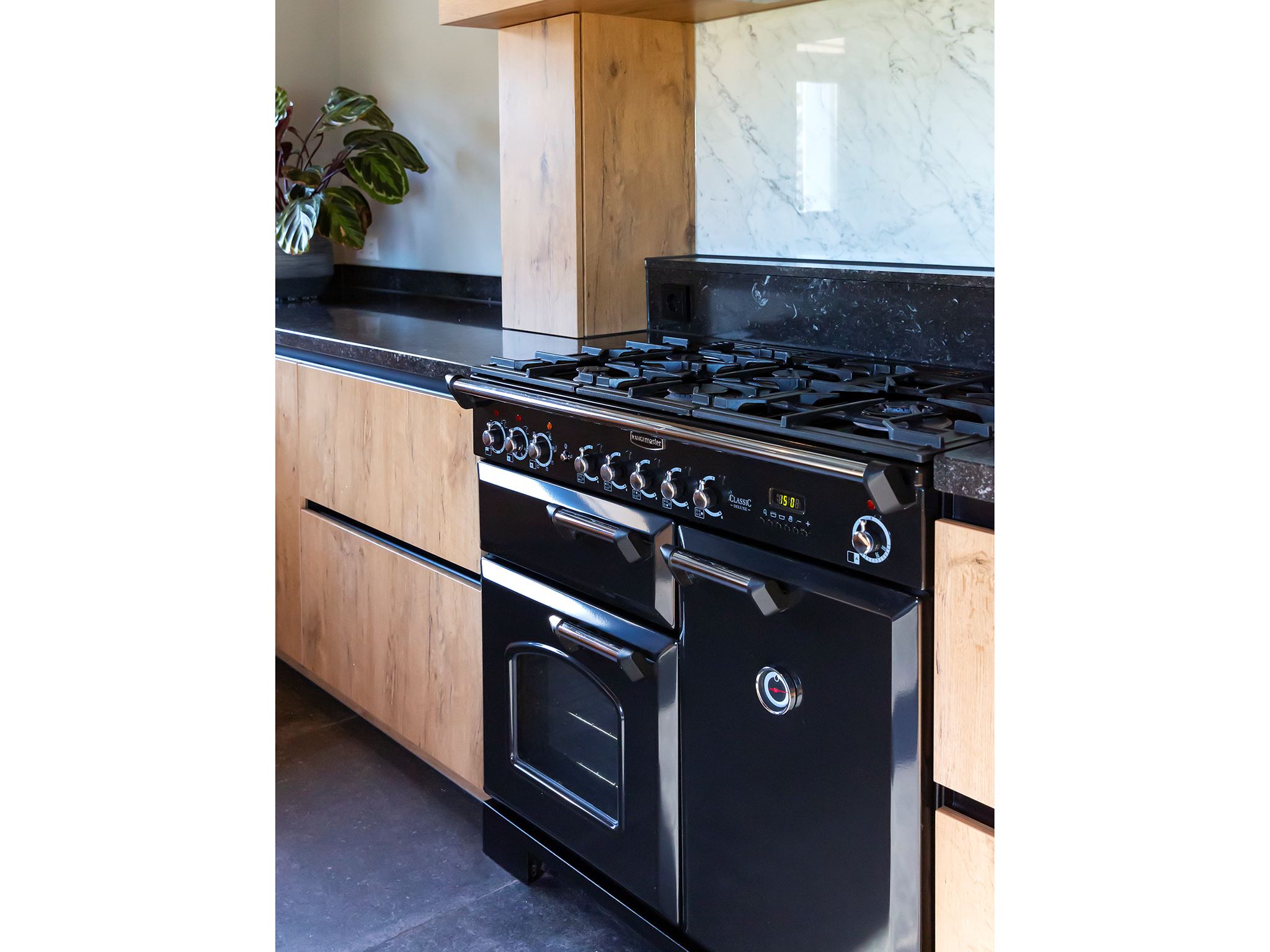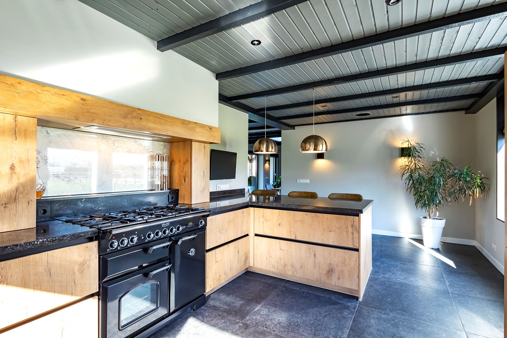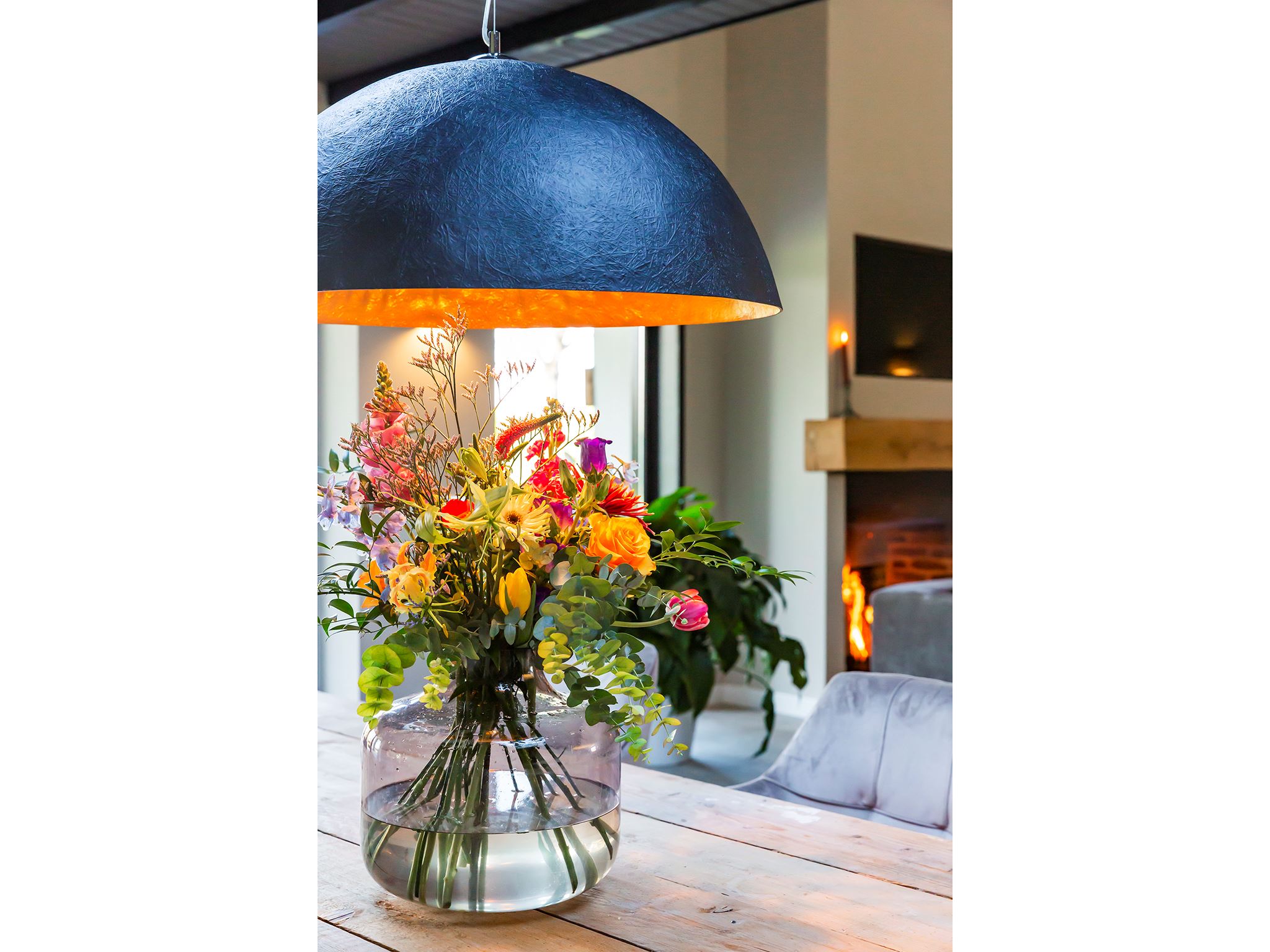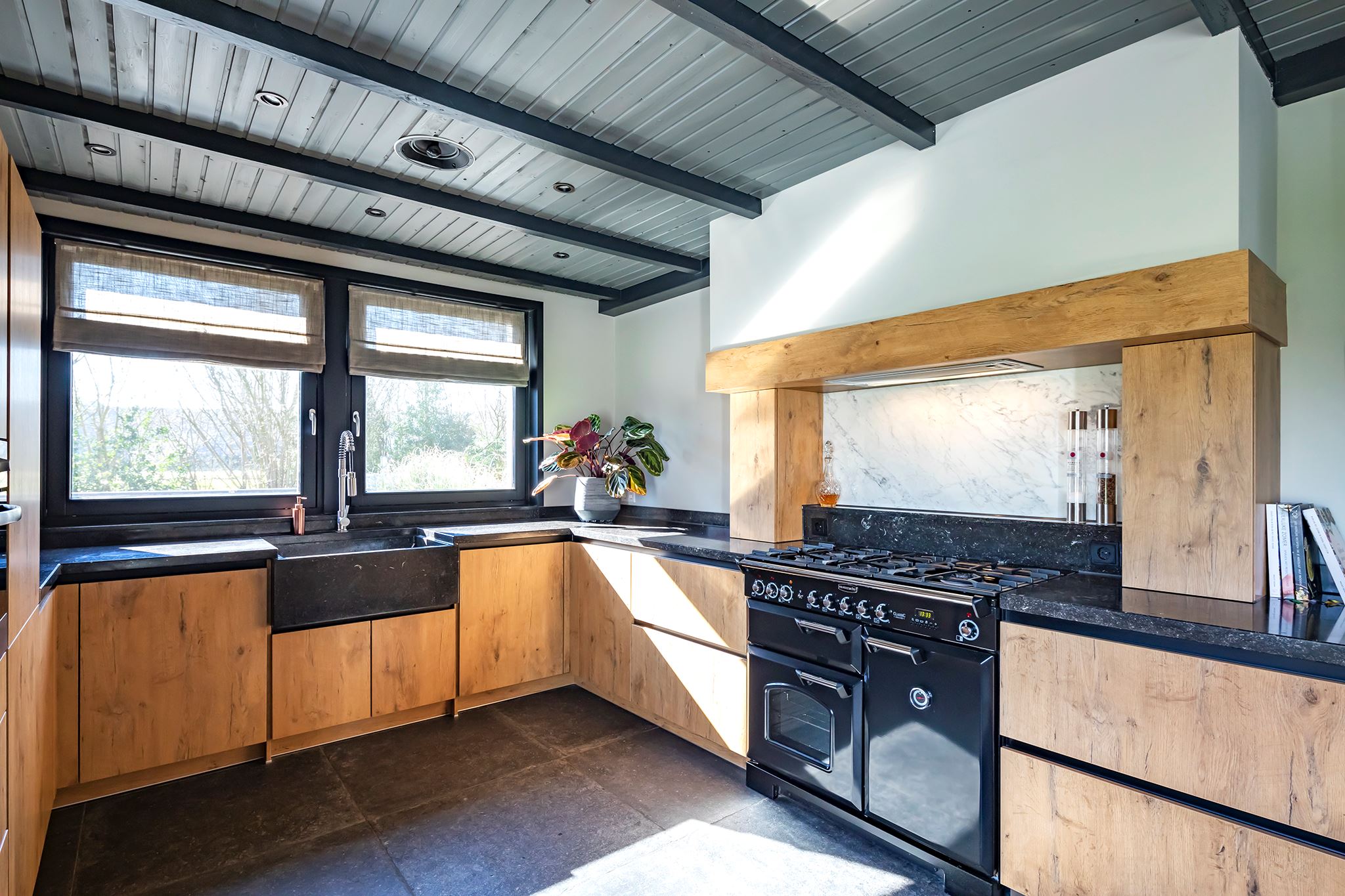 The surrounding garden with various mature trees and is neatly maintained, has a large lawn and a spacious covered terrace. This canopy made of Douglas fir and oak wood is a true eye-catcher! You can sit here with your family, friends or family. There is room for both a large garden table and a lounge set. The outdoor fireplace ensures that you are always comfortable here, even when it gets a little chilly outside.