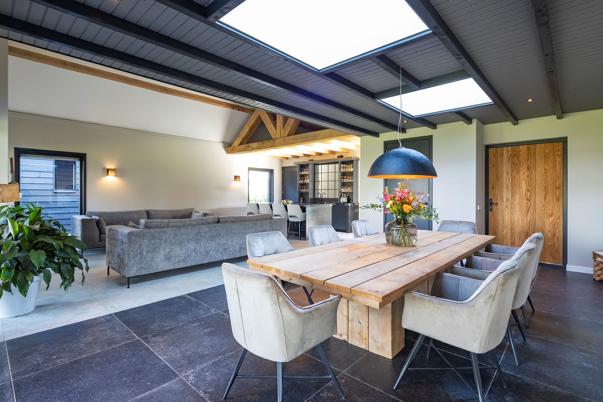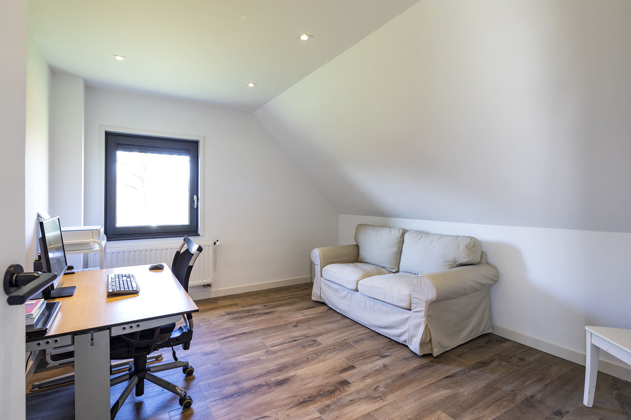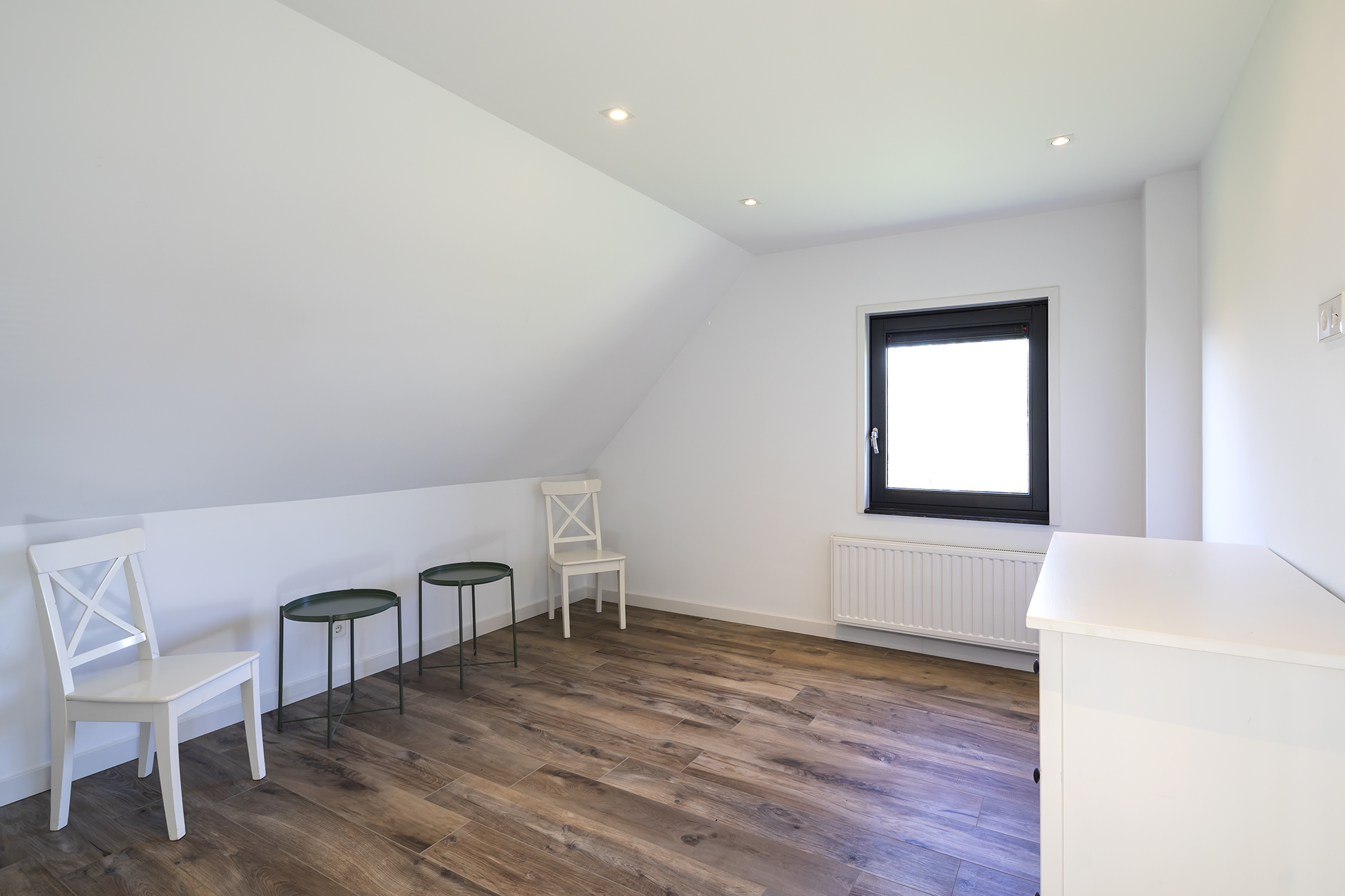 The living room has several attractive areas where you can sit. The fireplace provides even more atmosphere and extra warmth in the house. The entire floor is equipped with underfloor heating. There is room for a large dining table between the living room and the television area.