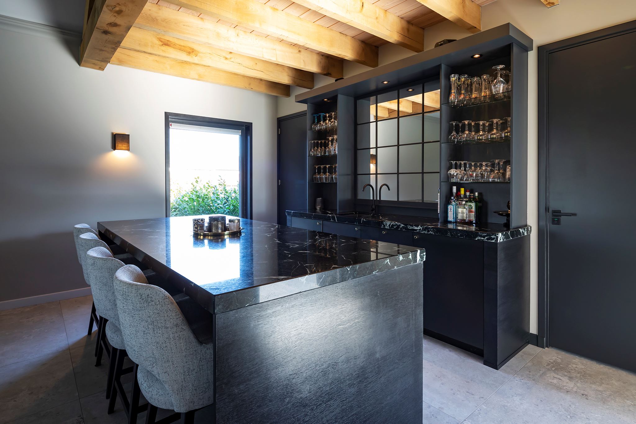 At the front is the luxurious kitchen, spacious, square layout, equipped with a Belgian bluestone countertop, various built-in appliances including a steam oven, dishwasher, fridge/freezer and a large, sturdy 6-burner gas stove with two ovens. At the end there is a cozy bar area.