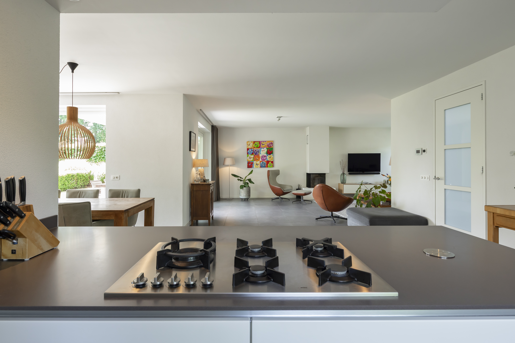 Cooking enthusiasts will be in their element here! This luxurious kitchen is equipped with a convenient Quooker, a steam oven and a convection oven, a refrigerator, and a dishwasher. The island has a 4-burner gas cooktop and a wok burner, and the extractor hood is integrated into the ceiling. The kitchen features a beautiful composite countertop and offers ample work and storage space thanks to the wide drawers and cabinets. It is handleless and finished in high-gloss white, which contrasts beautifully with the floor. While you're cooking, you can still enjoy the company of others at the table and not miss a thing.