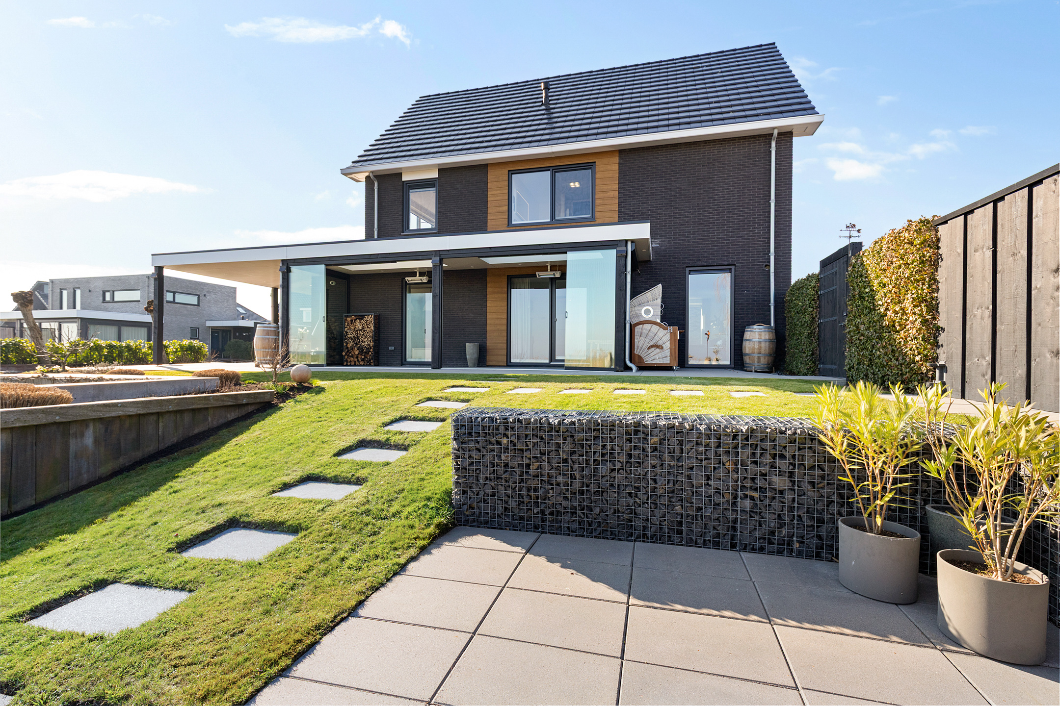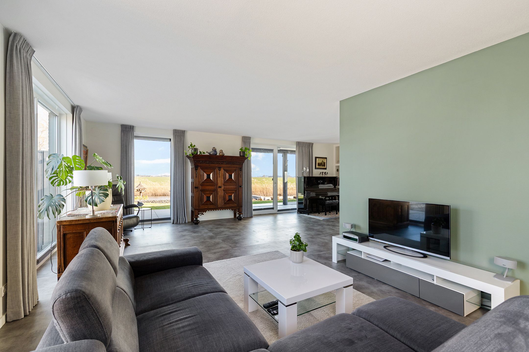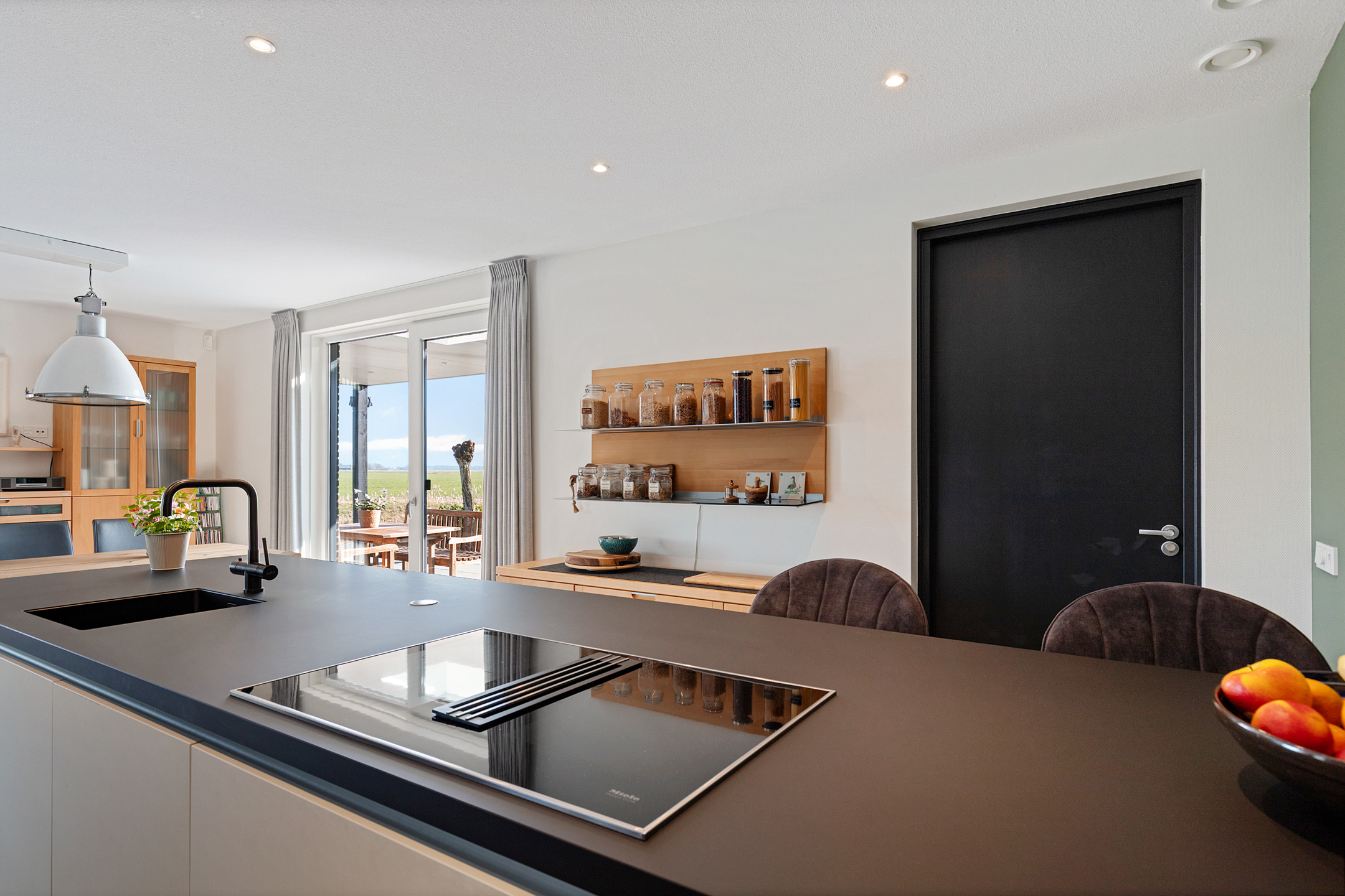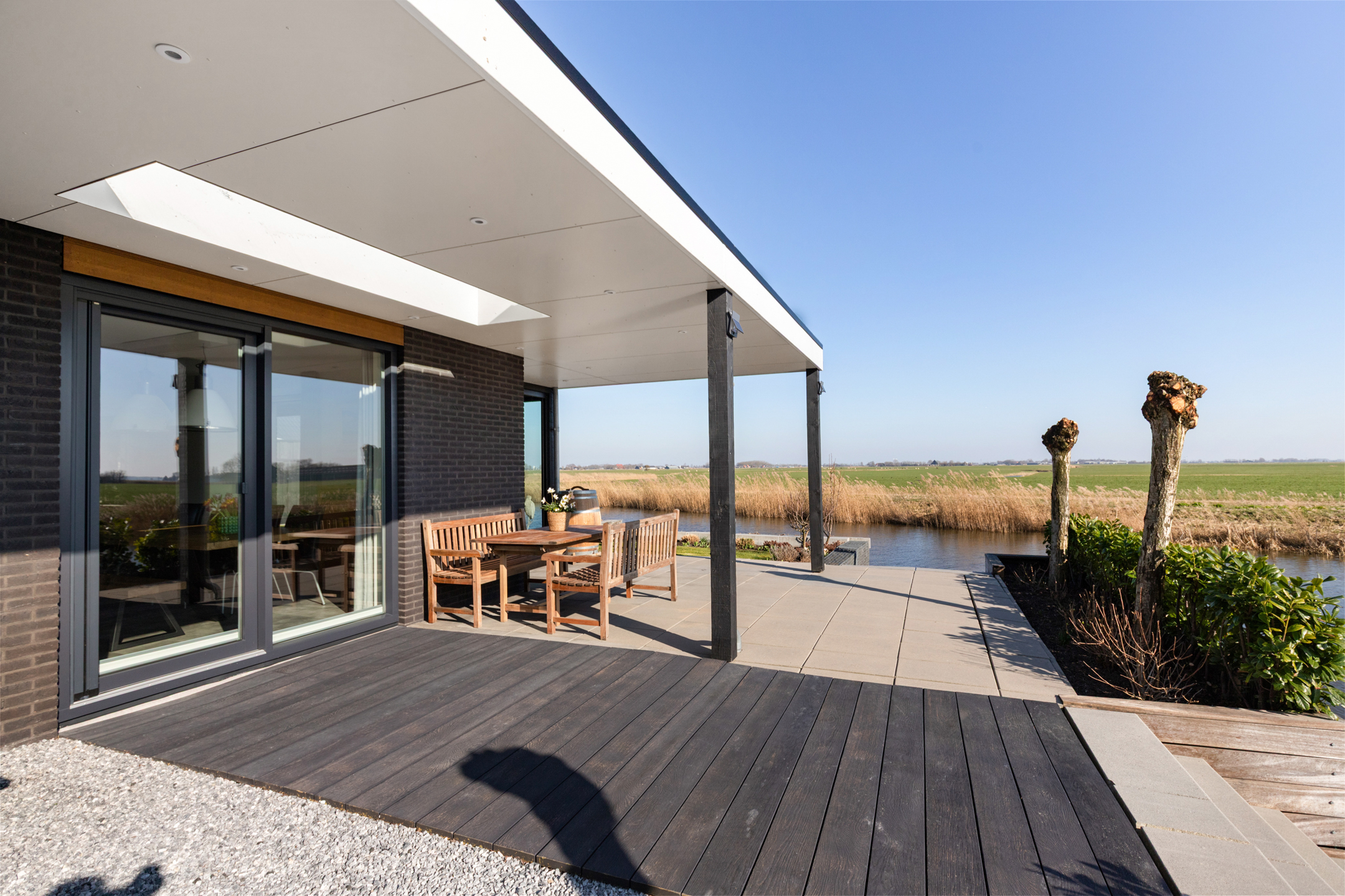 Through the covered entrance, you enter a spacious hall with staircase, guest toilet, and meter cupboard. A glass pivot door provides a beautiful sightline through the living room to the water and open fields.