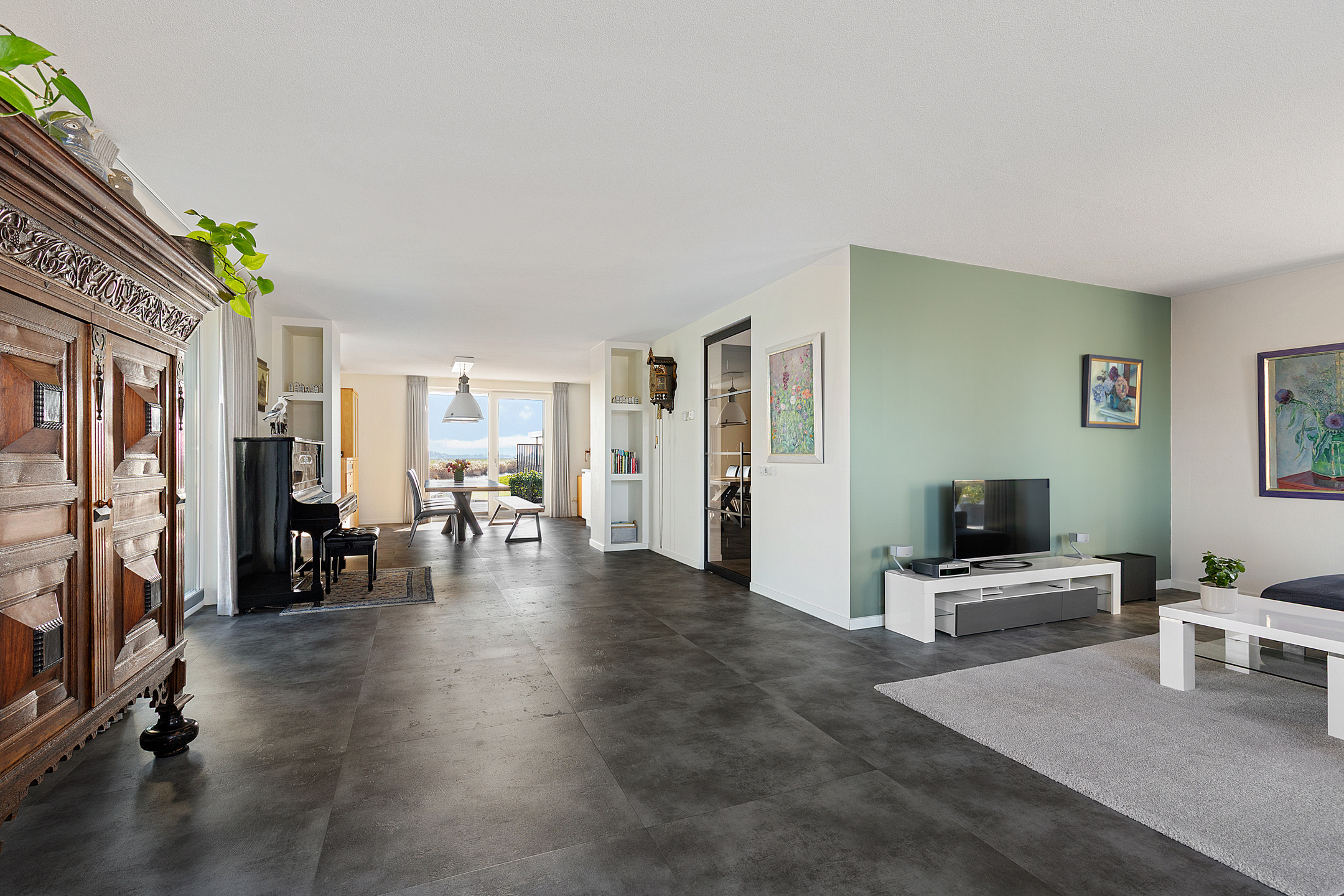 The open kitchen is generously sized and features a cooking/cleaning island and a wall of built-in cabinets with Miele appliances, including a coffee machine, combination microwave oven, combination steam oven, fridge, freezer, and plenty of storage. A hot-water cooker and an induction hob with integrated extractor are also included. The kitchen provides direct access to the spacious utility room with laundry facilities at work height, garden access, and a connection to the garage with heating room. The ground floor has a PVC floor with underfloor heating.