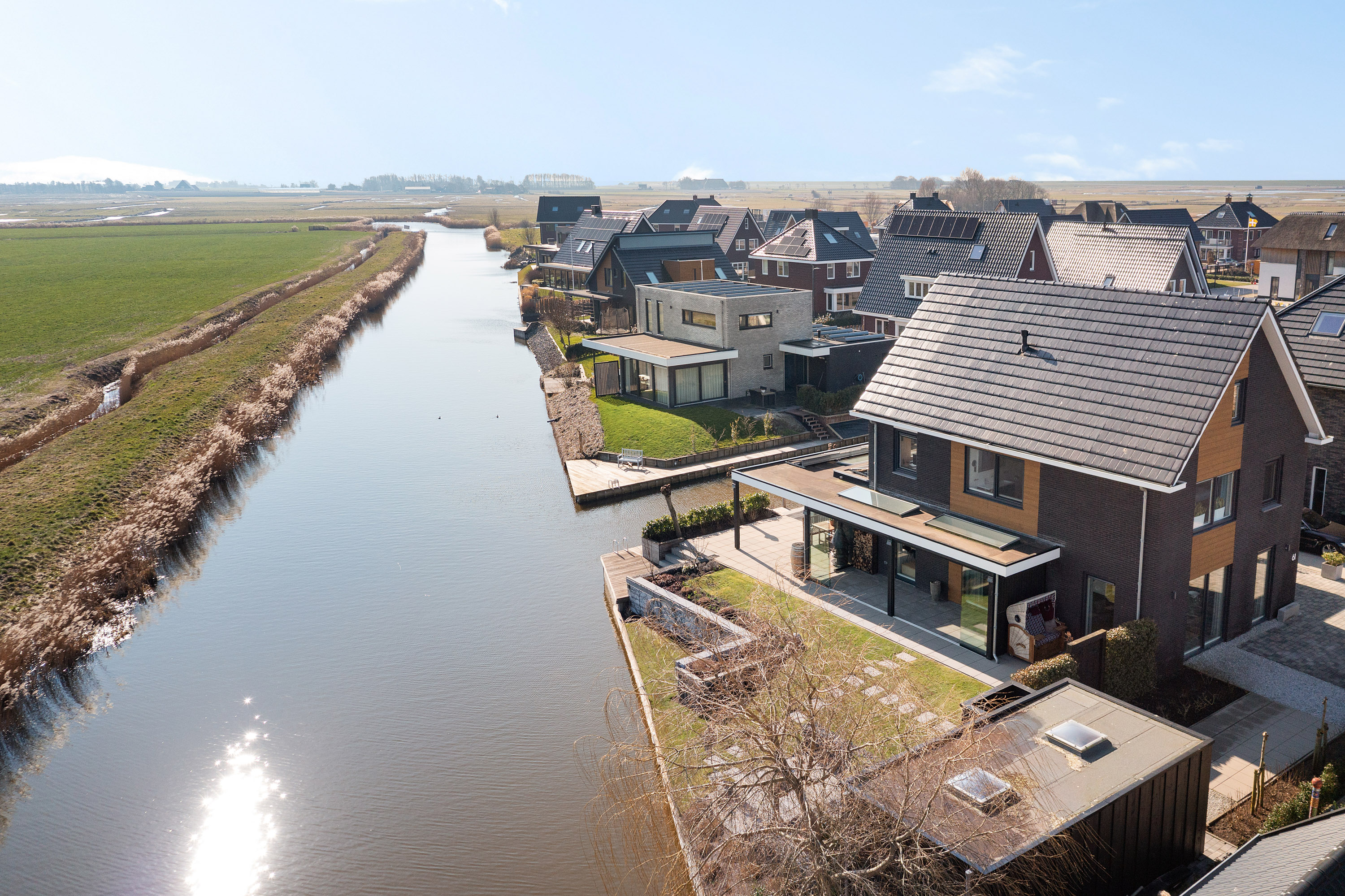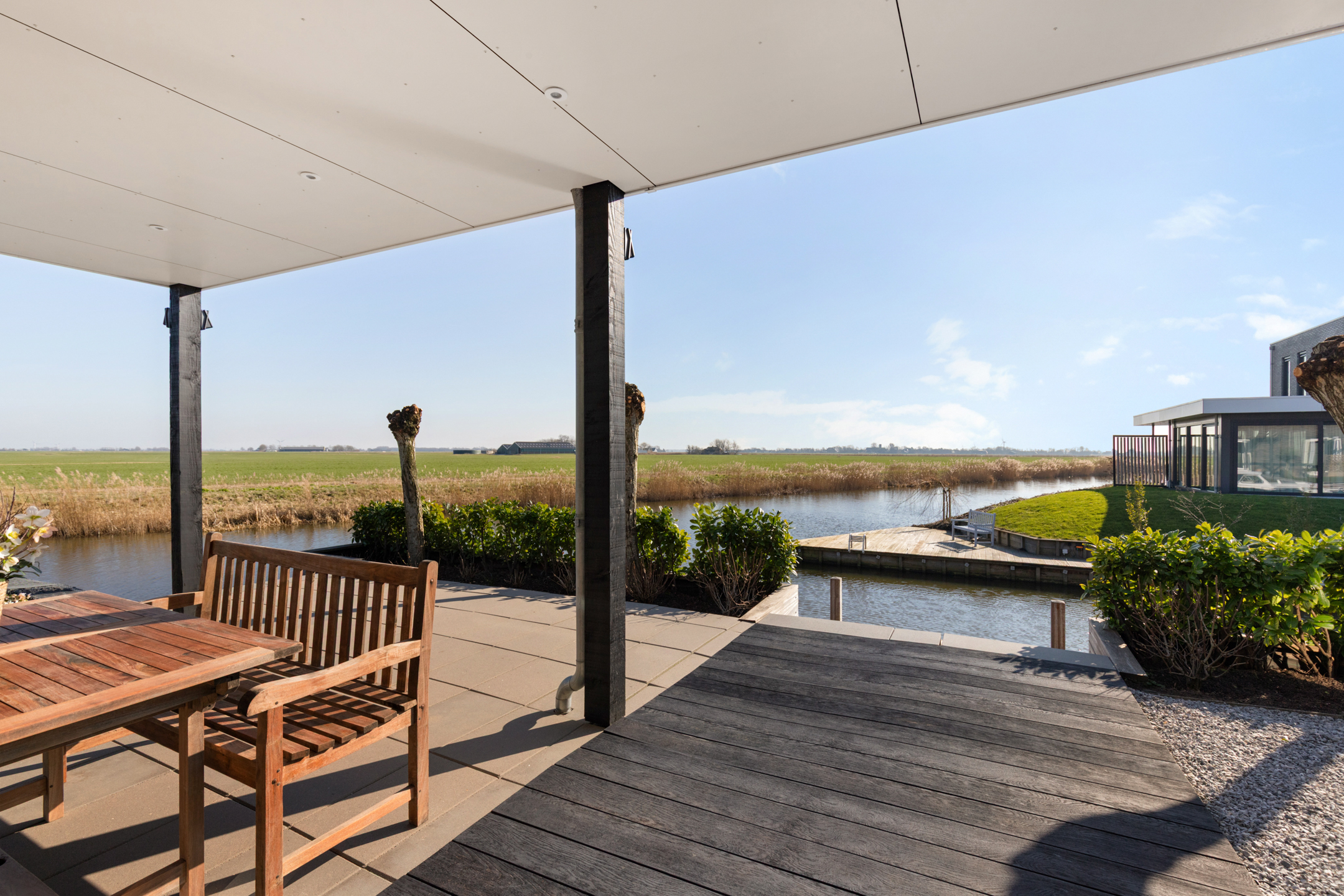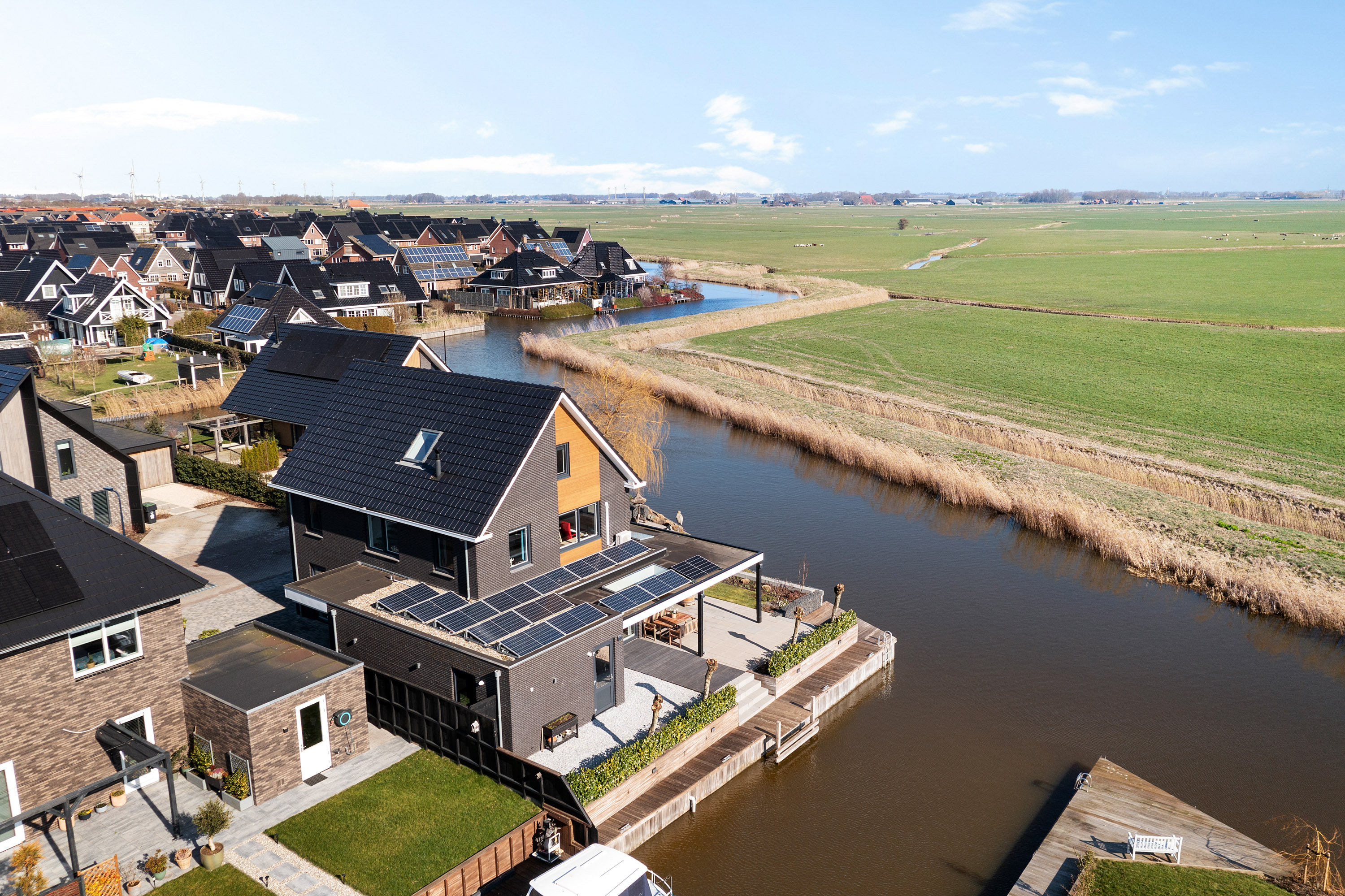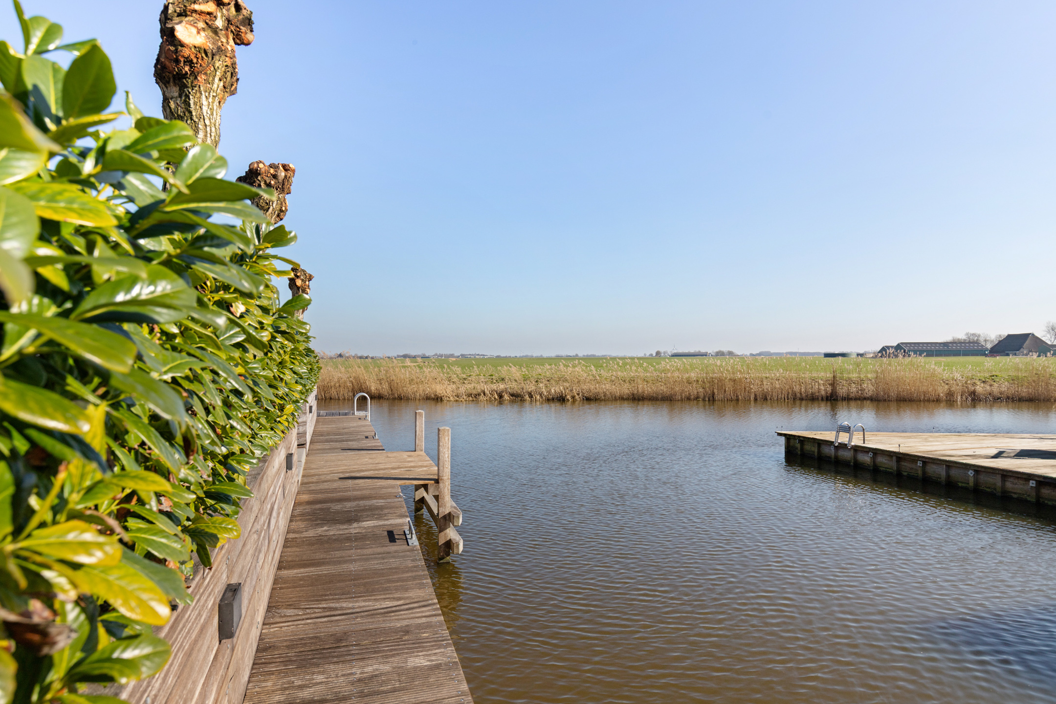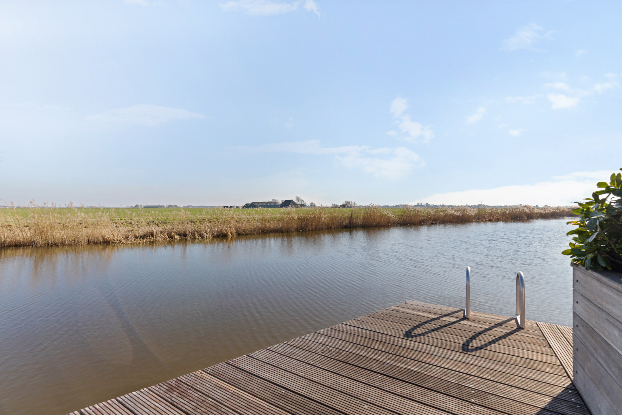 Thanks to the corner location on the water, the property enjoys a generous sun deck flanked by two luxury mooring docks, one with a swimming ladder. The enclosed stylish outdoor shower is a welcome addition for swimmers. The water in front of the property is calm, partly private, and connects directly to the Bolswardervaart.