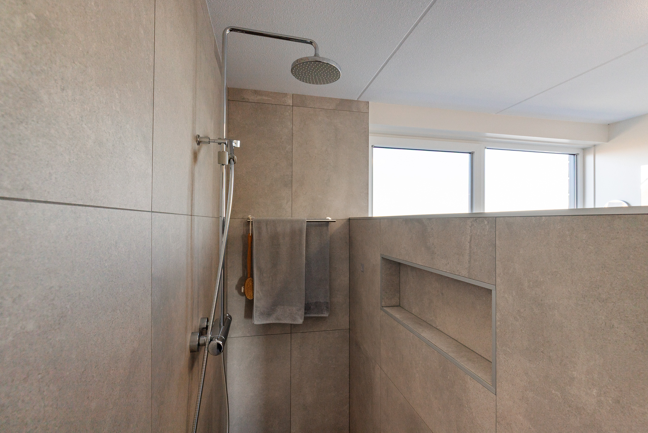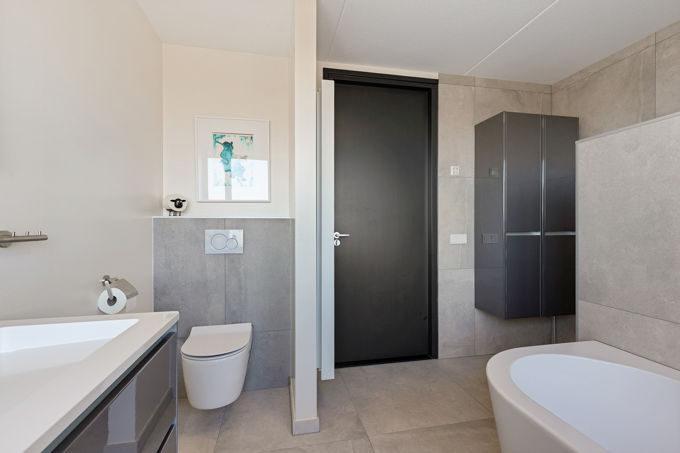 The family bathroom is bright and modern, with a bathtub, wide walk-in shower, and stylish double sink unit. Large windows offer panoramic views over the water and meadows—a spot where time seems to stand still. The first floor is heated with radiators and fitted with carpeting. All windows have insect screens.