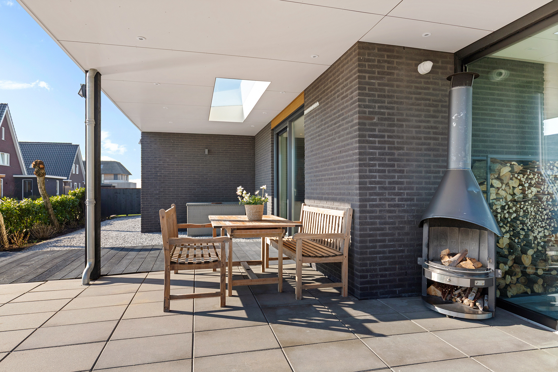 The luxurious garden room is finished to a high standard, equipped with heating, and has fully closable glass sliding doors, making it a true extension of the living space. Daylight from the roof brings in plenty of natural light, with adjustable louvers for shade when needed.