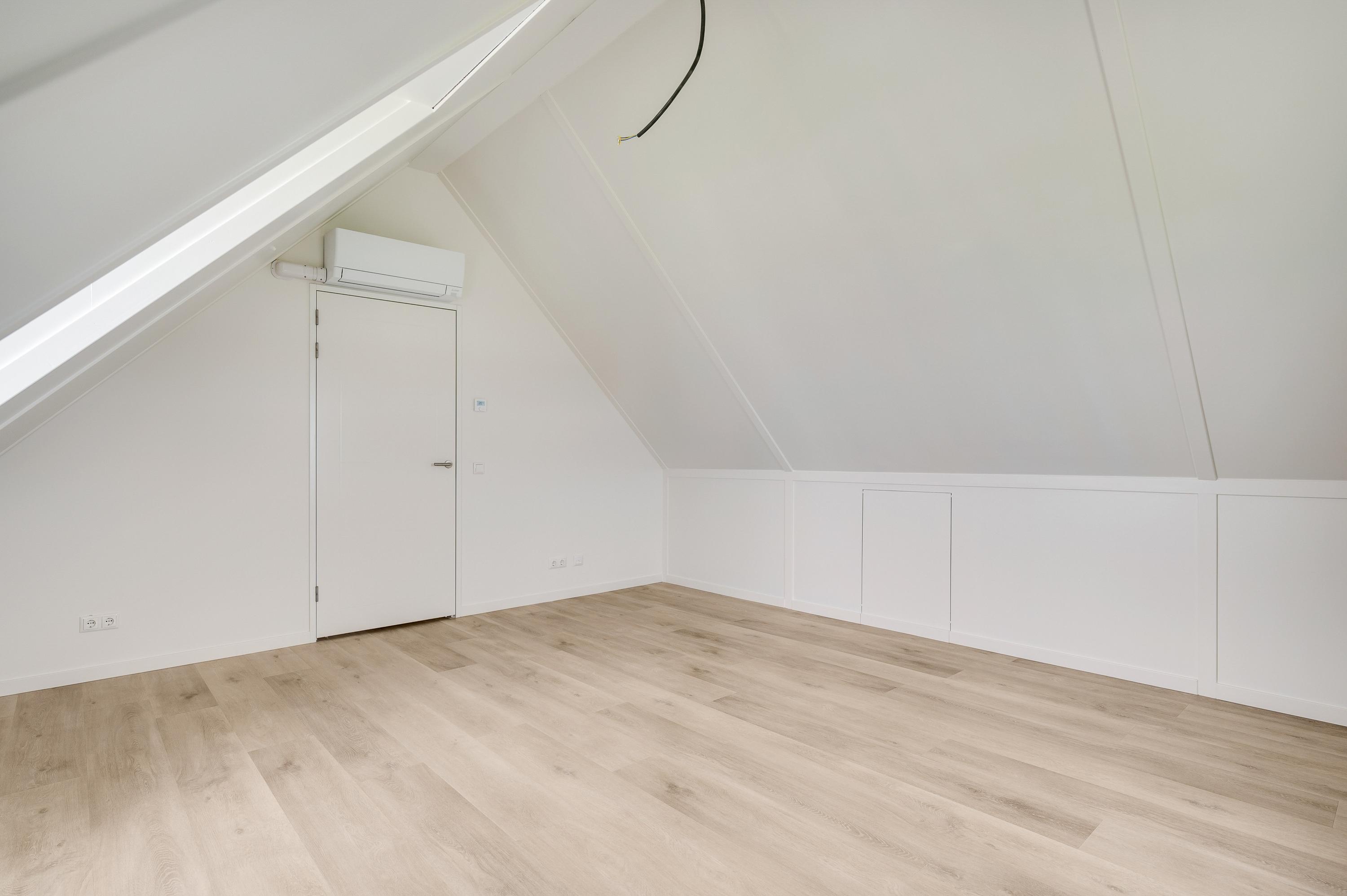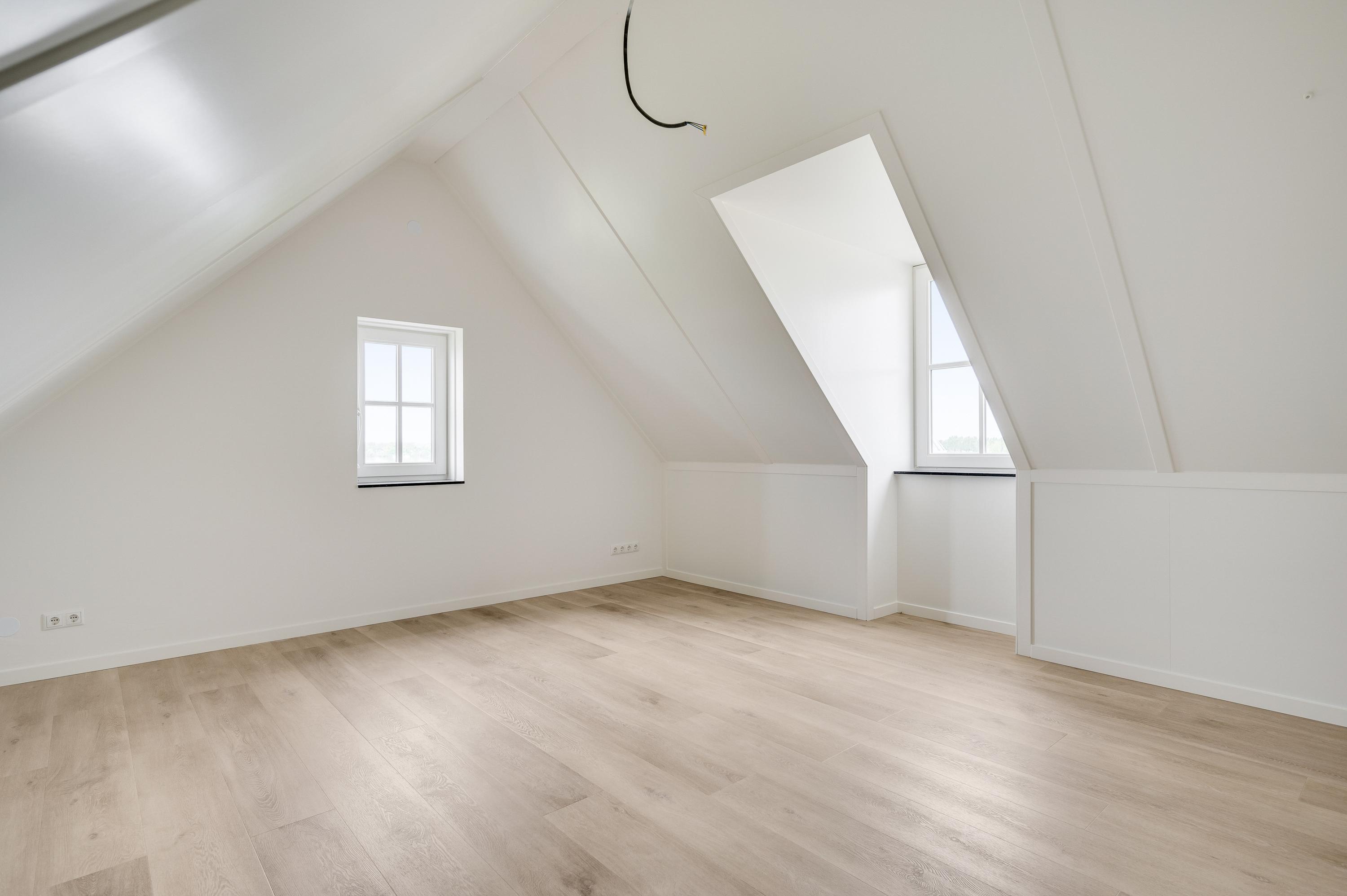 On the L-shaped second floor with high ceilings and a dormer window you will find bedroom 3 and 4. Both rooms are spacious and overlook the water. The third bathroom is also located here, which has a walk-in shower, sink and toilet. Finally, you will find the technical room here, where you will also find white goods connections.