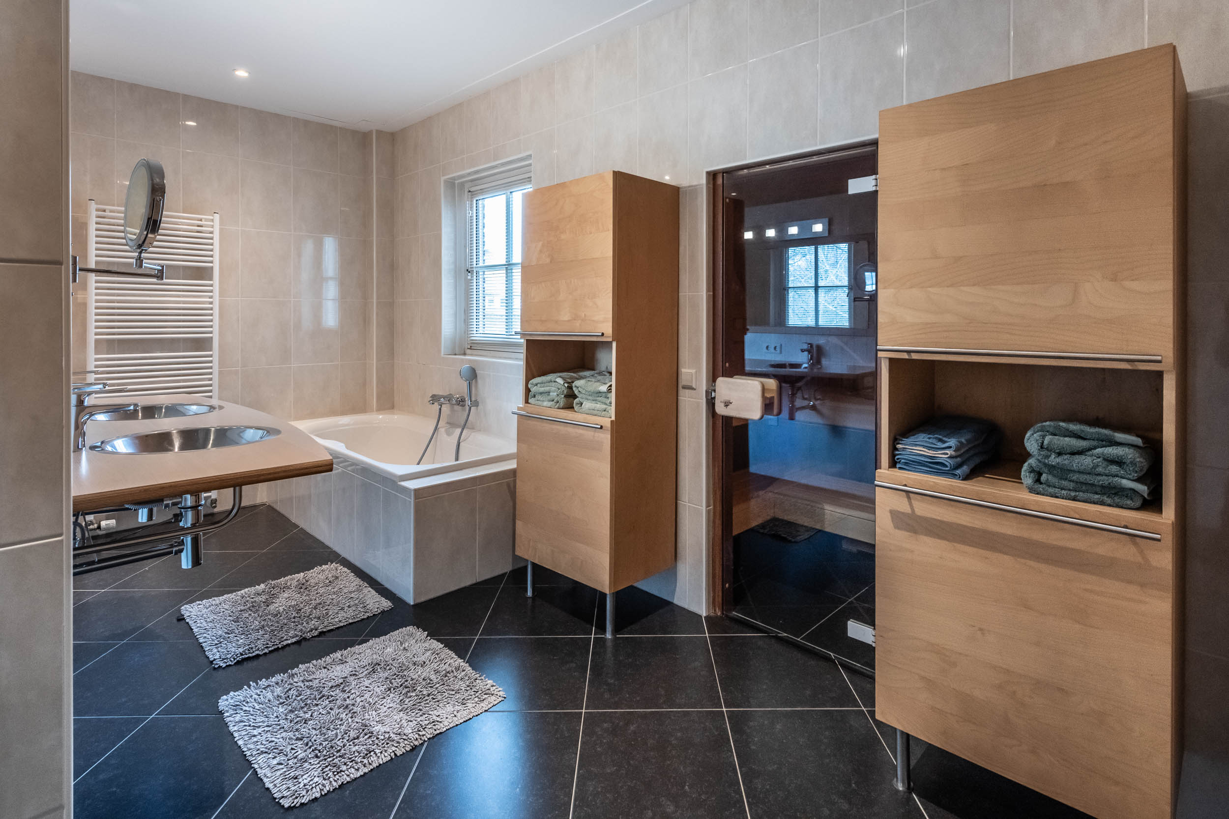 First floor: Landing with access to four spacious and bright bedrooms and two modern bathrooms. The large master bedroom is located at the rear and provides access to the walk-in closet and the bathroom with bathtub, walk-in shower, second toilet, double sink, and sauna. The second bathroom has a shower, third toilet, and a sink. The second bedroom at the rear of the house provides access to the roof terrace via French doors.