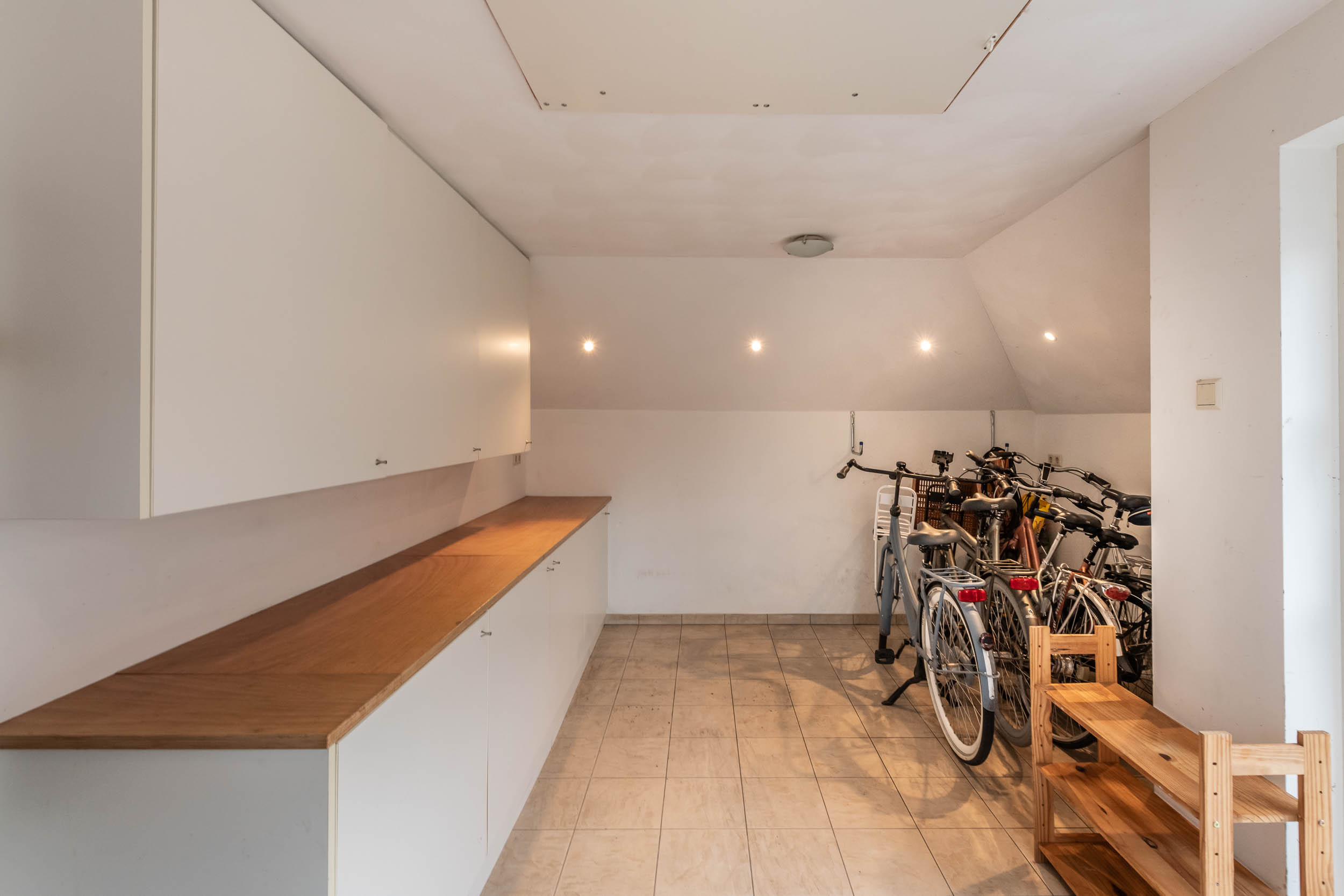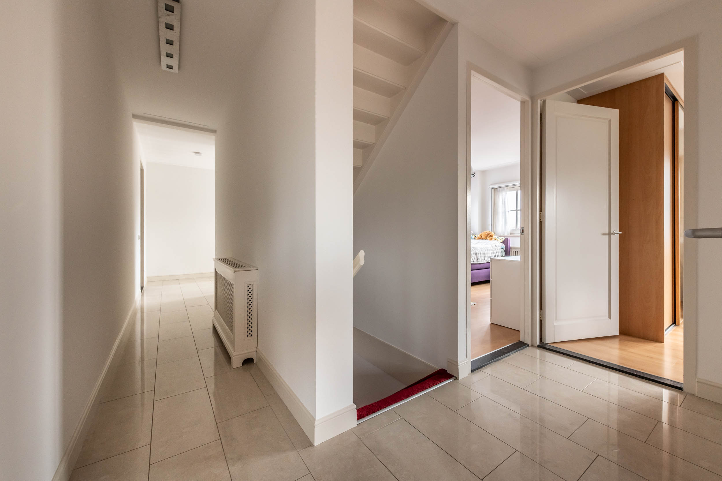 Ground floor: Entrance, large L-shaped hall with wardrobe and WC. From the hall, access is provided to the garage on the right and the living room on the left. At the front of the house are the dining room and a dedicated office space. Through the sliding doors of the dining room, you enter the rear of the house, where a cosy sitting room features a gas fireplace, a wide wall of built-in cupboards, and double doors opening onto the backyard. The spacious, modern SieMatic kitchen is open to the living room and features a large cooking island equipped with a built-in teppanyaki plate and an induction wok, along with additional features. One wall is fitted with a range of modern kitchen appliances. The utility room, accessible from both the garage and the kitchen, is equipped with a washing machine connection and a kitchen unit with a sink. The double French doors open onto a beautiful, spacious garden featuring a partially covered terrace, multiple seating areas, and a stylish garden shed.