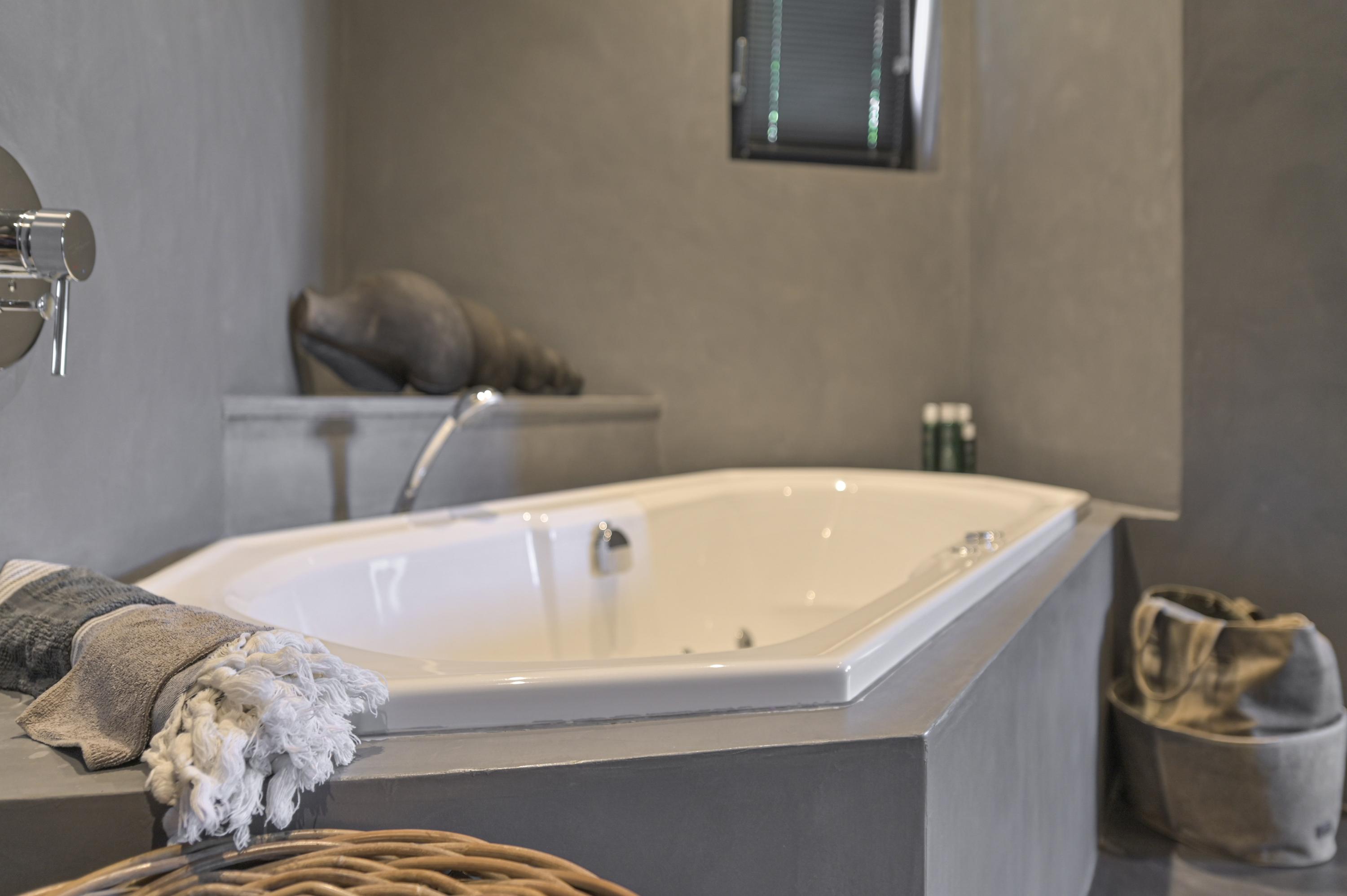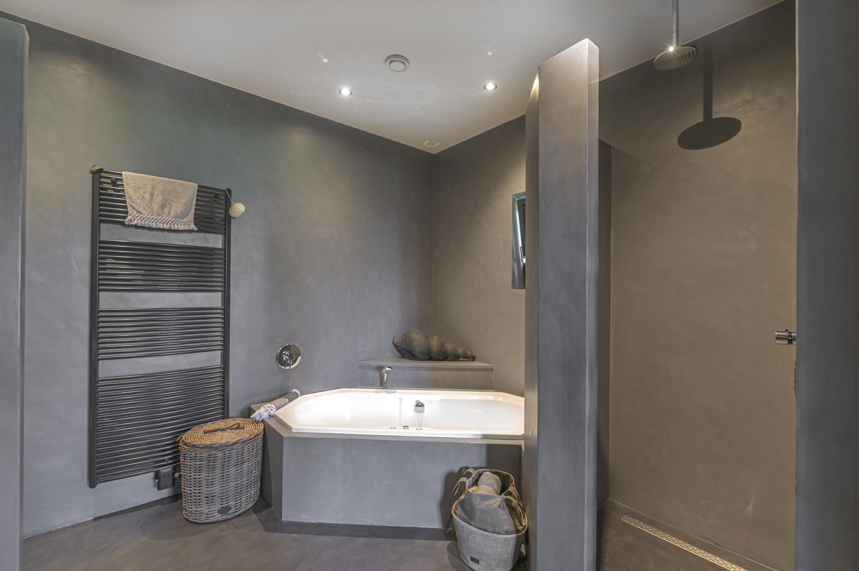 The master bedroom features a wooden floor, fitted wardrobes, and access to the en-suite bathroom through a glass sliding door. This bathroom has been fully renovated with a beton ciré floor and includes a walk-in shower with built-in taps, whirlpool bath, toilet, washbasin with vanity, and natural ventilation through a window.