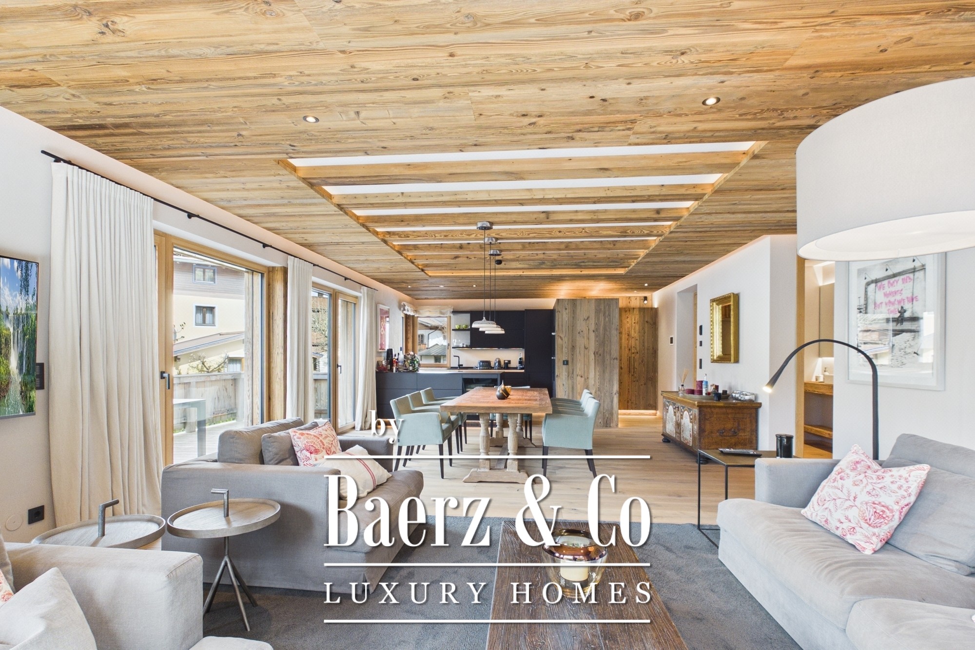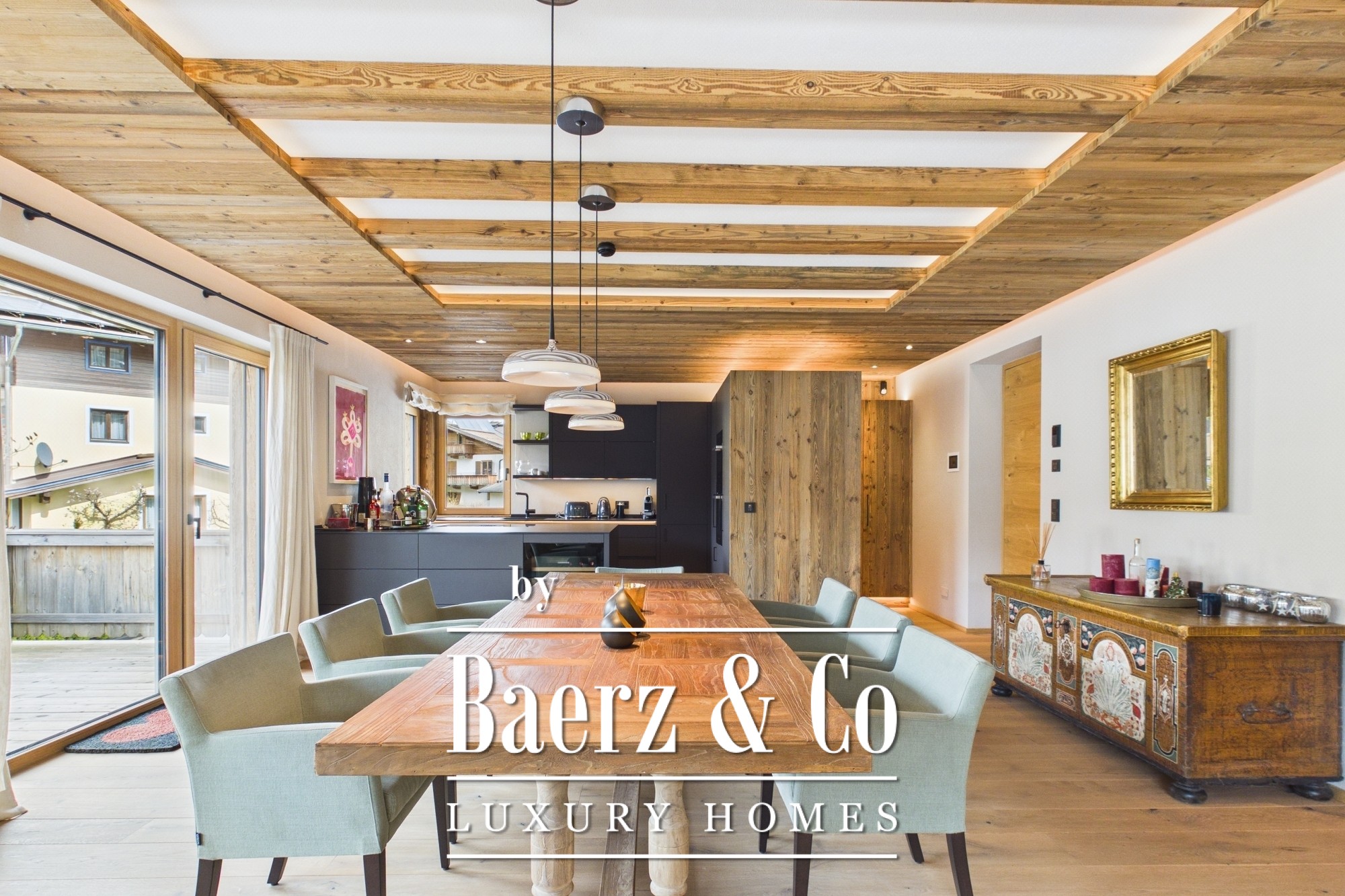 Apartment Kirchberg in Tirol offers a refined living experience at the end of a quiet cul-de-sac, set slightly elevated with close proximity to ski slopes and the town center. Encompassing a generous 135 m² of living area, this residence is distinguished by three rooms each with en-suite bathrooms, two configured as bedrooms, and a large wellness room complete with sauna. An open-plan living, dining, and kitchen area becomes the social heart of the home, featuring reclaimed wood ceilings and a custom-built kitchen fitted with Miele appliances.