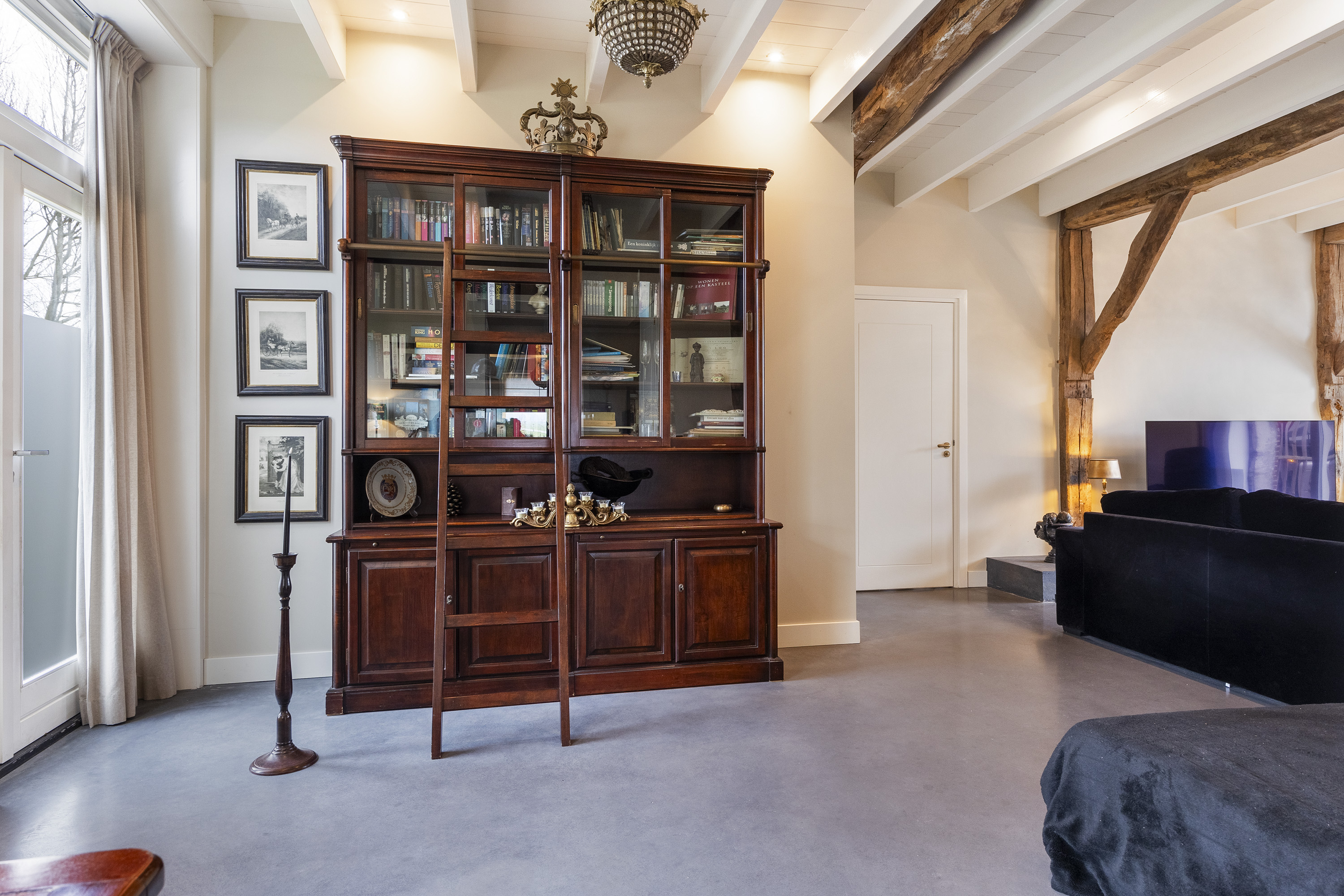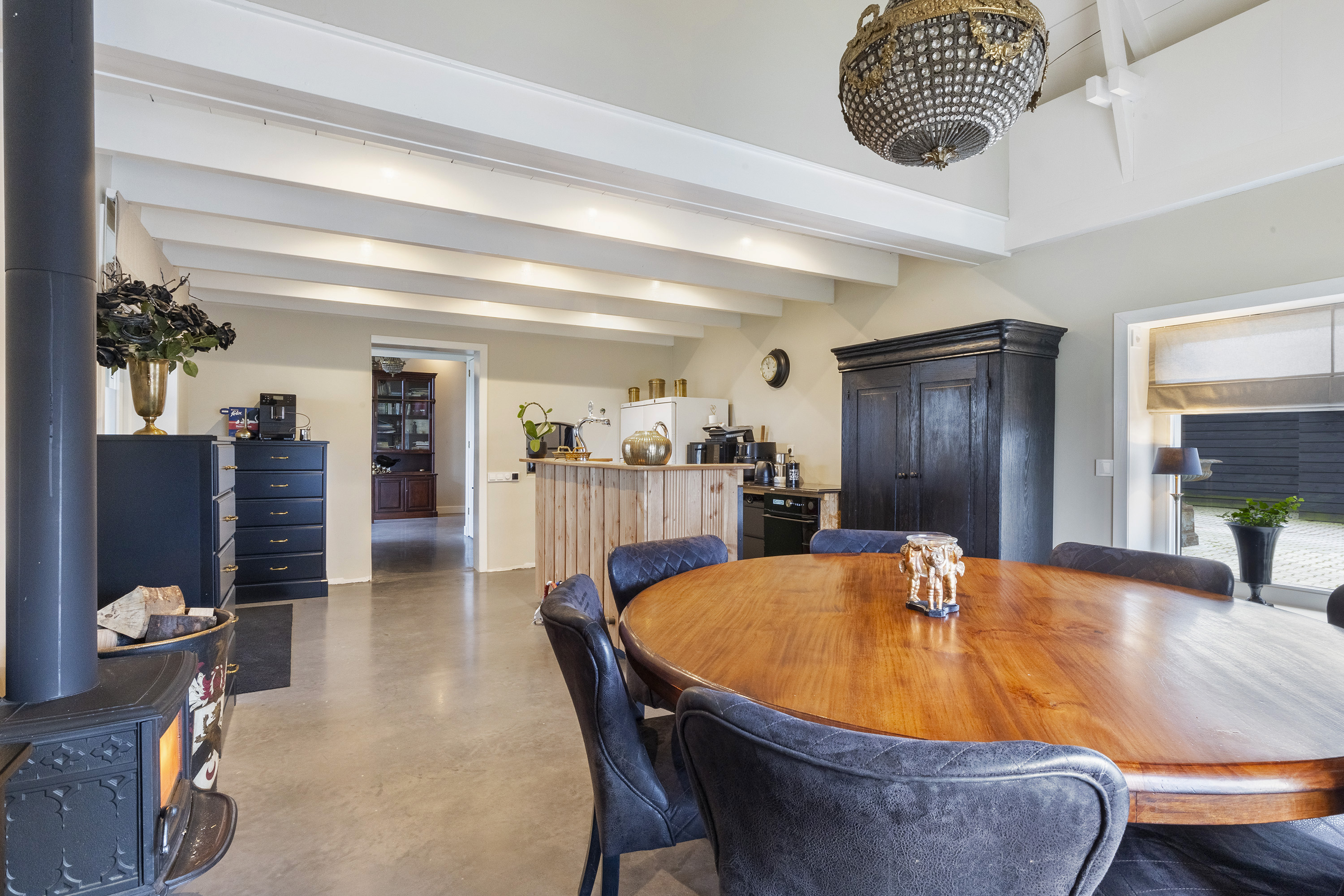 The living room is equally spacious and is characterised by a beautiful combination of white-painted timber ceiling beams, robust structural beams and a polished concrete floor. The wood-burning stove and French doors to the garden create a seamless connection between indoor and outdoor living. The room comfortably accommodates multiple seating areas, offering flexibility in layout.