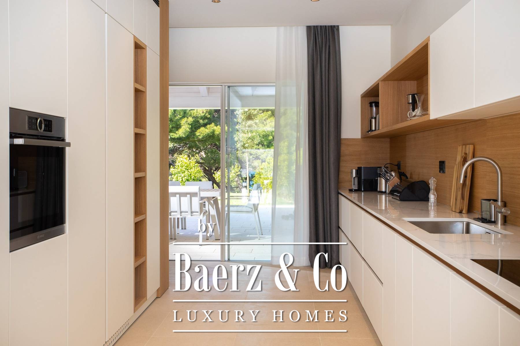 Villa B spans 375 m² over a similar three-level layout, complementing the estate with an additional three bedrooms and private retreats. Altogether, the estate offers seven bedrooms and seven bathrooms. Outdoor amenities include a swimming pool set amidst landscaped grounds. The pace of life here is attuned to the rhythm of the sea and the enduring elegance of the Adriatic.