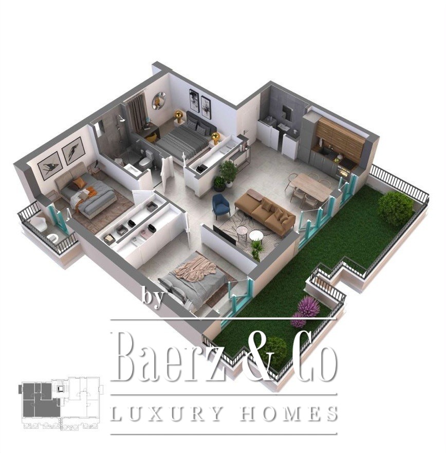 The building has 3 floors, while the apartment is on the 3rd floor. It has 2 pools which are on top of the building and 1 of them belongs to this apartment. The building is connected by an asphalt road to the main road. It is newly built.