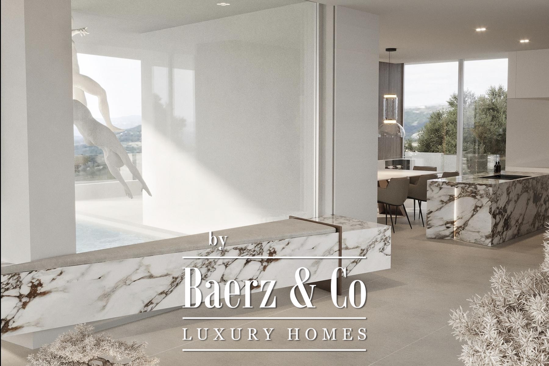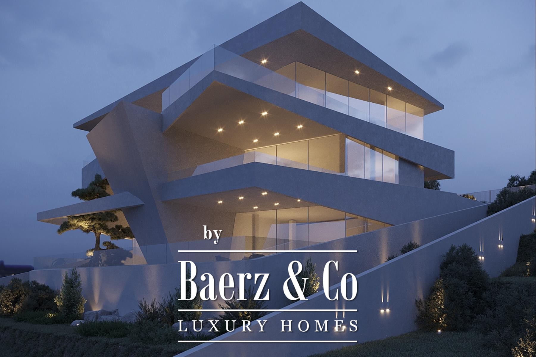 The home offers four bedrooms and four bathrooms, each finished with designer sanitary ware in brushed bronze and satin, ensuring a blend of comfort and composed elegance. The interior is designed for fluid living, while terraces of 197 m² and a 34 m² rooftop pool invite seamless connection between in and outdoor spaces. Features such as a sculptural Ergofocus fireplace, Schüco systems, and top-quality ceramics emphasize refined detail, with a 32 m² garage complementing the layout.