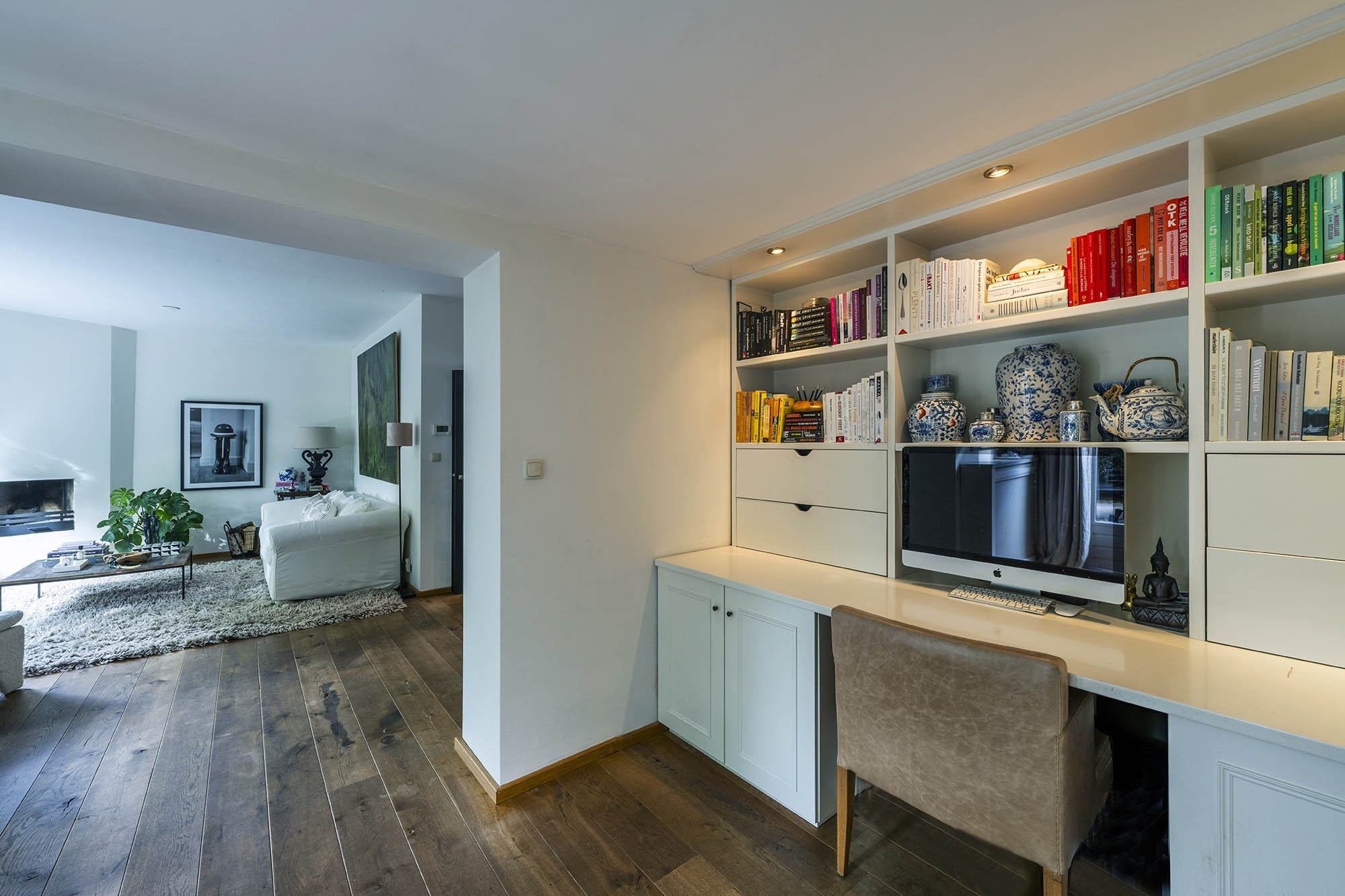 On the first floor there are three well-sized bedrooms, one of which is currently used as a laundry room, as well as a modern bathroom with bathtub, vanity unit, and toilet. A fixed staircase takes you to the second floor, where the master bedroom with built-in wardrobes and private bathroom forms a delightful private retreat.