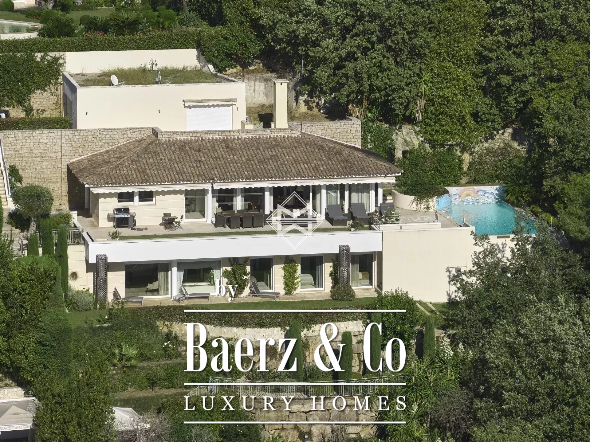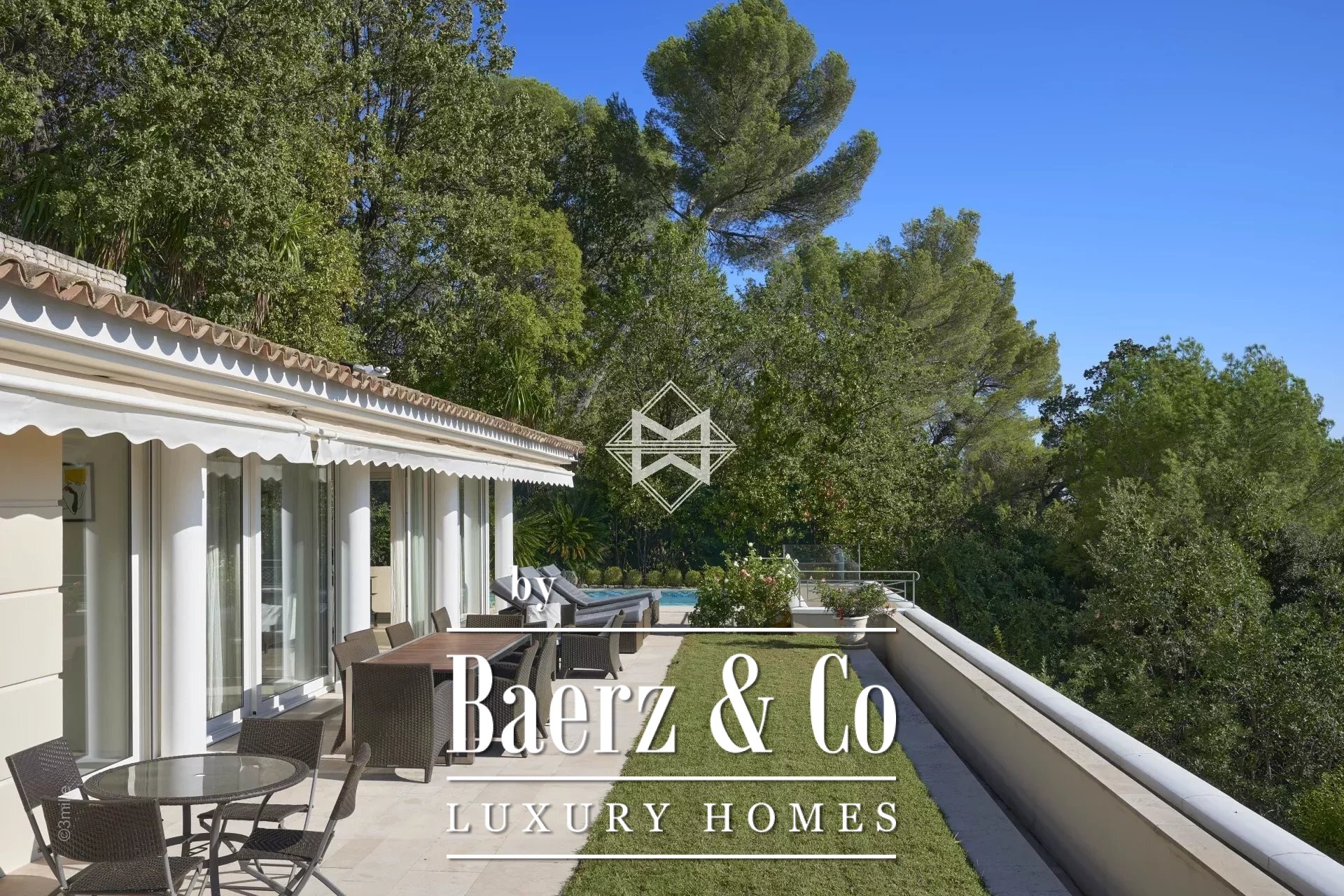 Amenities include a wellness area and a wine cellar, while an independent studio with kitchenette offers flexibility for guests or staff. Air-conditioning, electric shutters, and an alarm system reflect considered attention to comfort and security. Completing the property are a two-car garage and carefully curated outdoor spaces, all oriented to capture the sea horizon. This villa for sale in Cannes offers a setting attuned to privacy, design, and the natural rhythm of its surroundings.