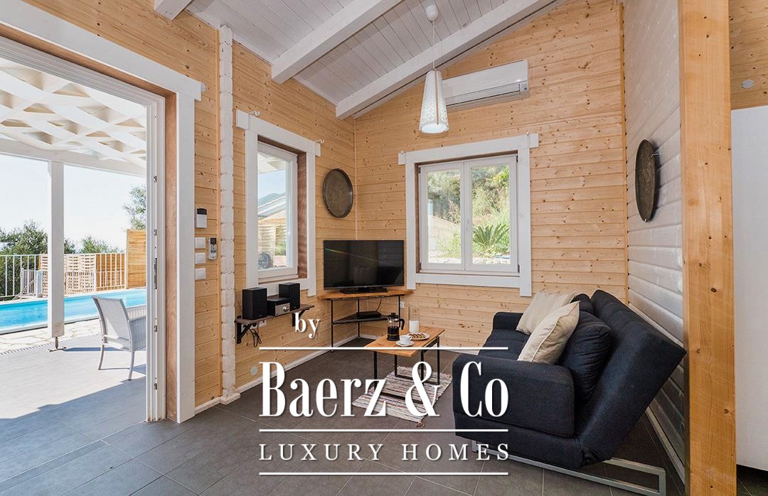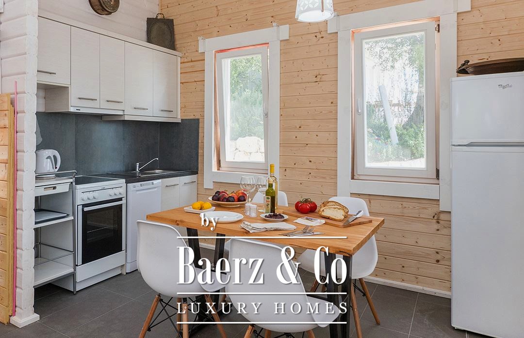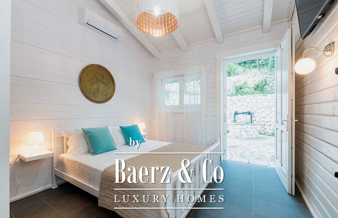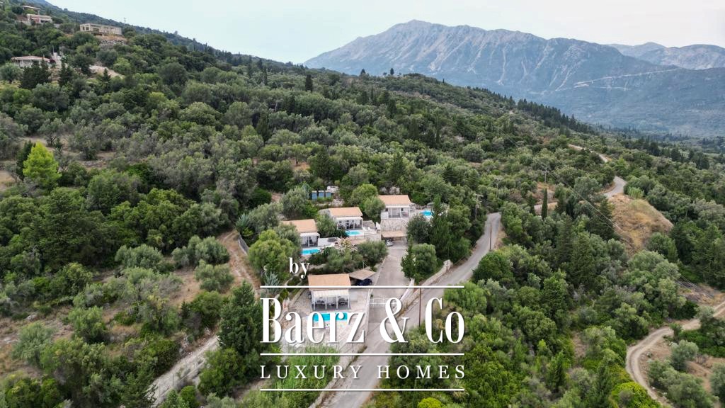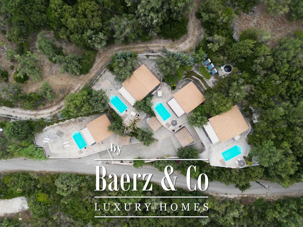 Each residence offers a distinct sense of privacy, whether in the two 60 m² houses with separated bedrooms or the two 40 m² open-plan studios. Every unit includes its own kitchen, living space, and bathroom, opening onto private outdoor areas. Shared facilities include gardens, a swimming pool, and mature trees, creating a tranquil environment with wide Ionian Sea views.