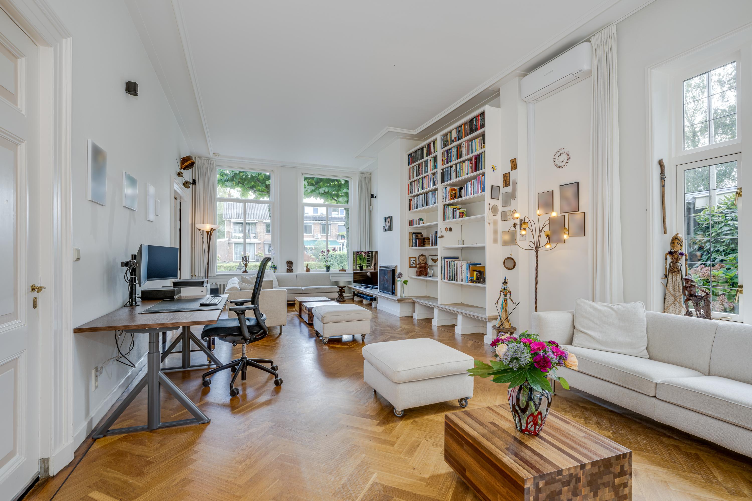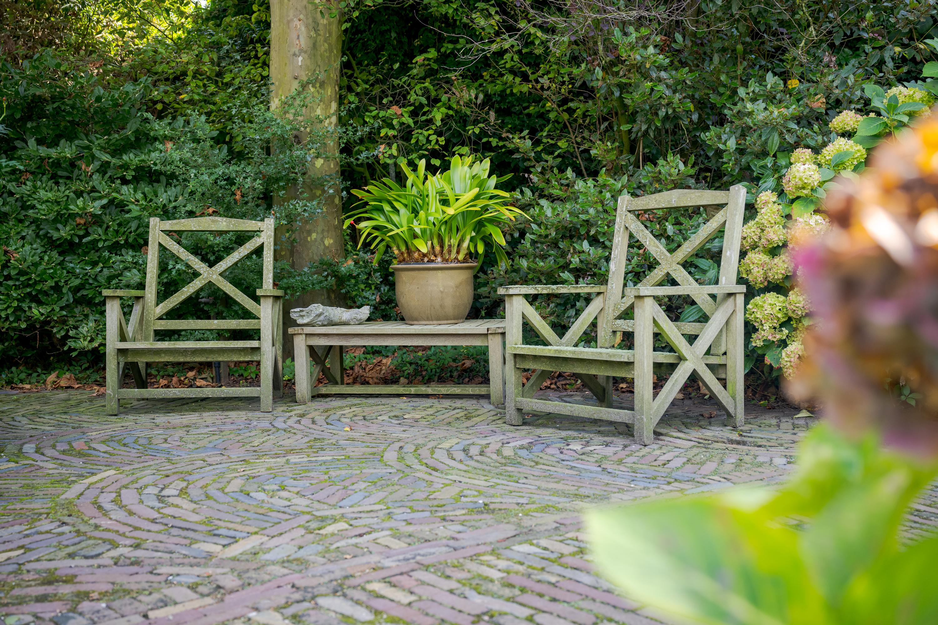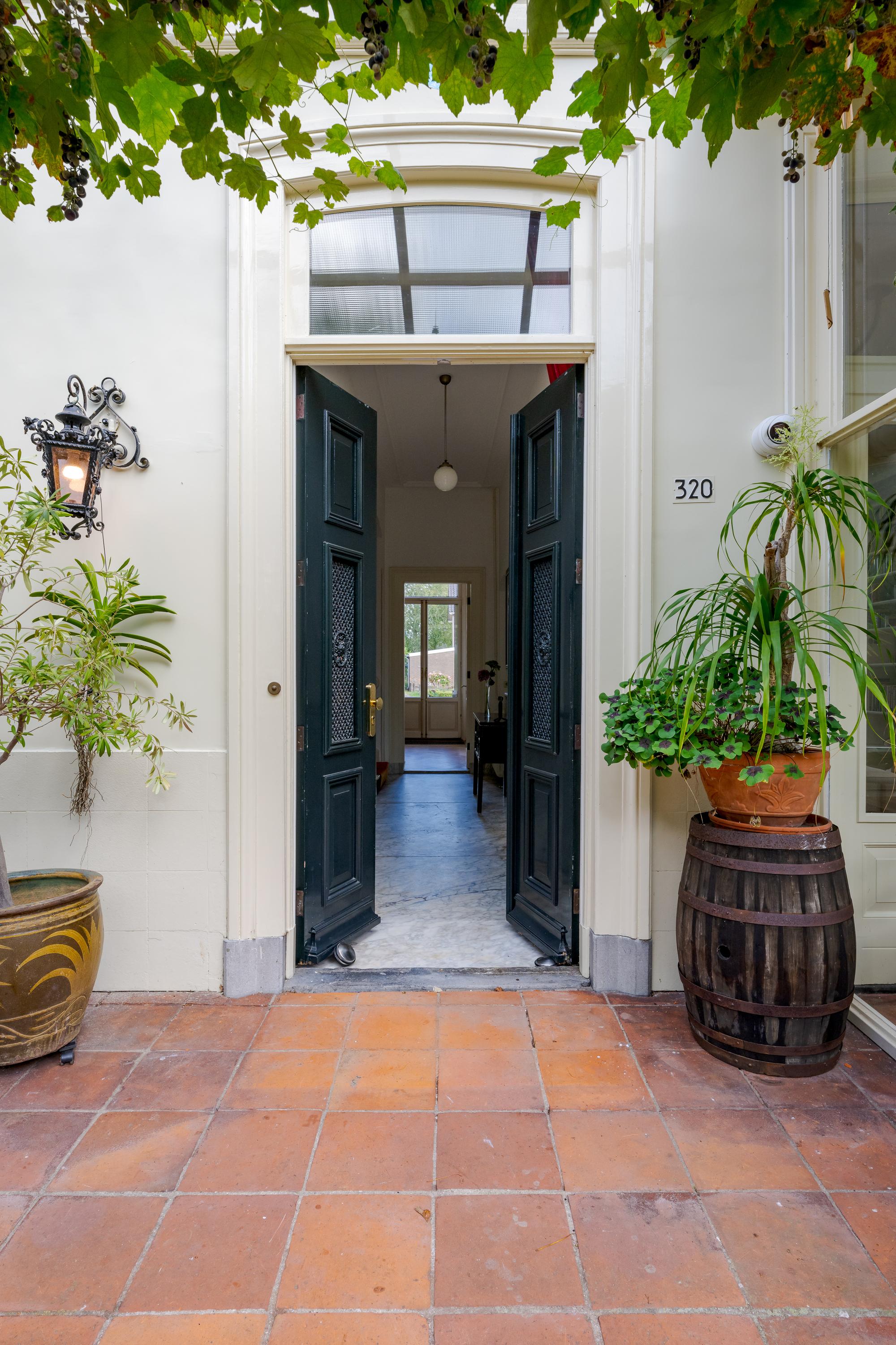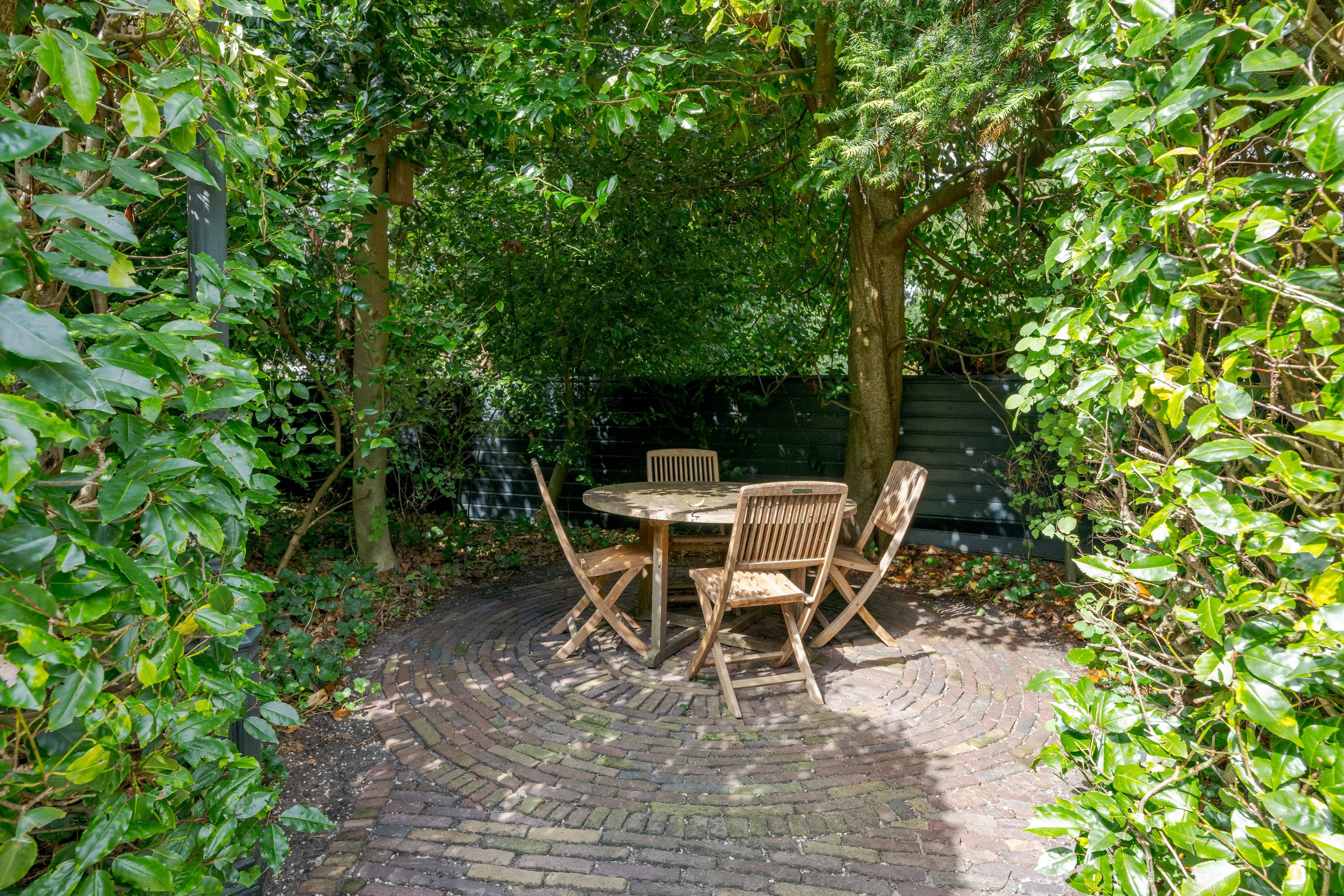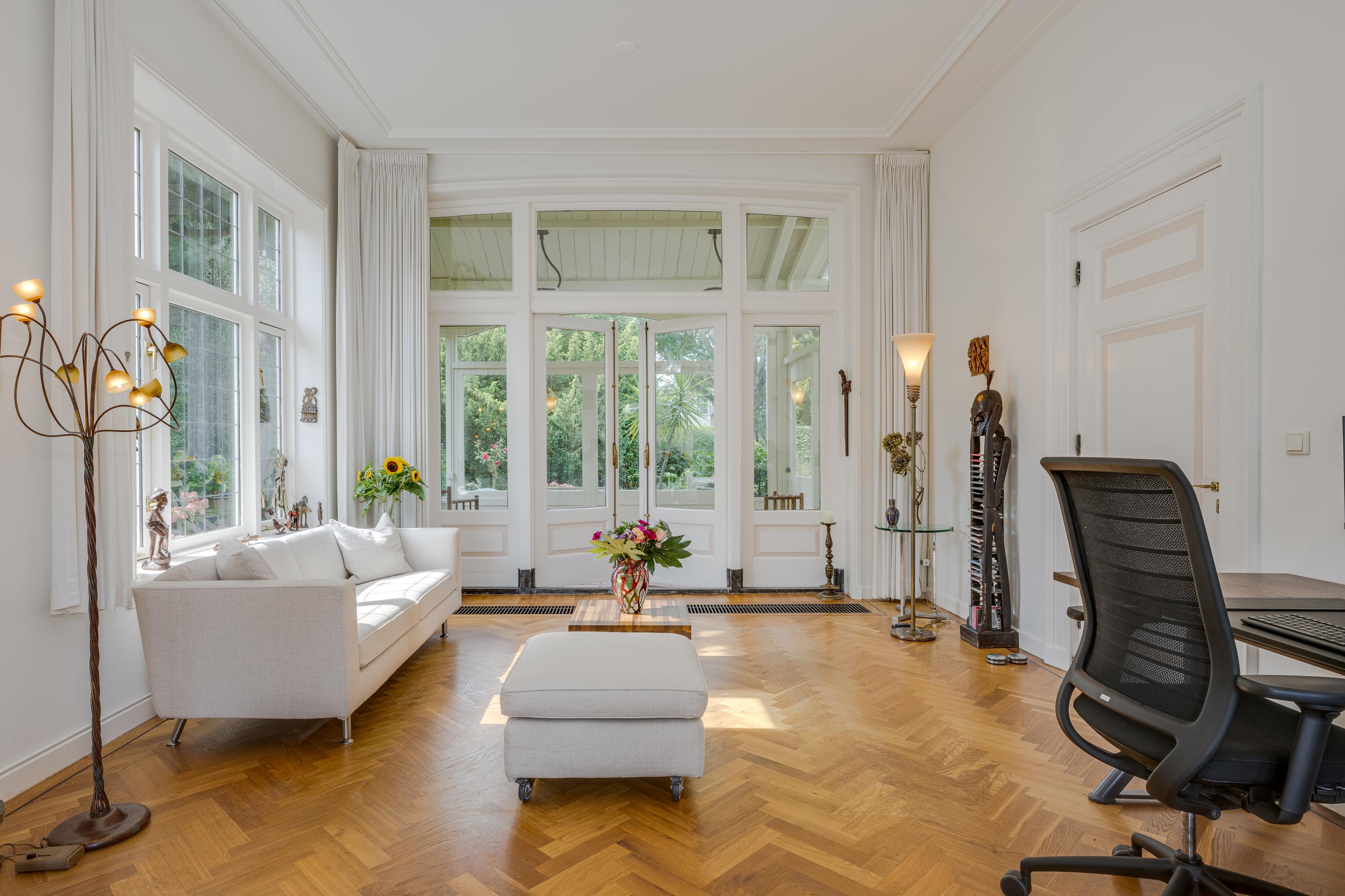 After you have closed the electric gate of the gatehouse behind you, you immediately imagine yourself in a different environment and the peace comes over you. A central lawn with a centuries-old plane tree (1820) forms the heart of the courtyard. Special is the greenhouse with a mandarin tree next to this tree, where you can still sit on a sunny day in the middle of winter. Both to the left and right of the lawn is a gravel path, where you can drive directly to the house if you want. There are now a few corners and seats where you can enjoy the sun or shade at different times of the day. A little further on is a pond that is equipped with a water supply system with Rhine water, with the entrance to the house behind it, flanked on the left by a veranda and on the right by a sunny conservatory. Here too, you can enjoy this large garden all year round.