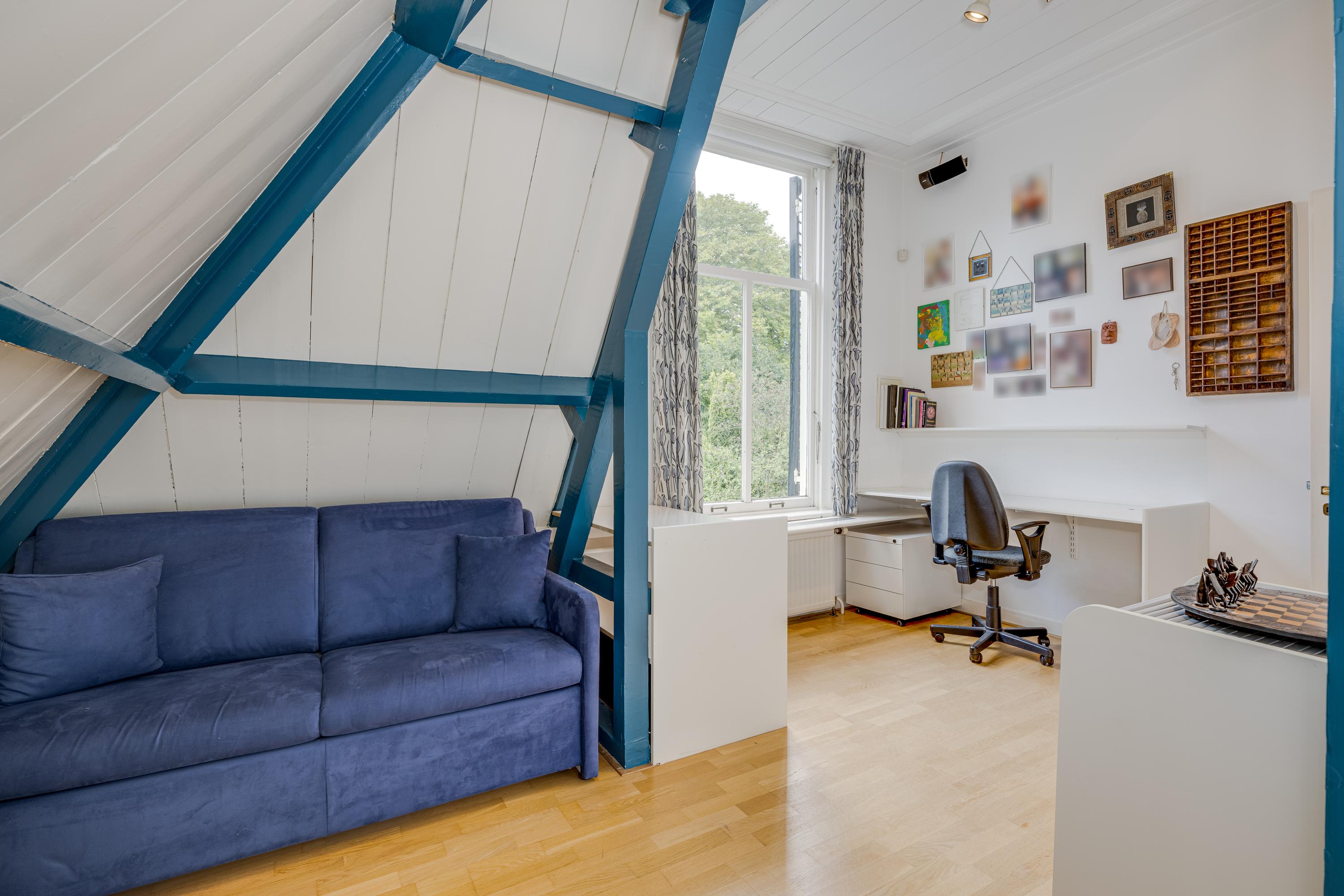 The gatehouse from 1995 is symmetrical in design with a central passage in the middle and on the ground floor an entrance on both the left and right sides. The left wing is used as an office, which also has a toilet, shower and pantry. The right wing is used as a fitness room and also has a toilet, shower and pantry. From both the left and right wings there is a staircase to the room above the gate, which is now furnished as a guest bedroom. The facade of the gatehouse consists largely of glass and has French doors to the garden in both wings, which ensures plenty of light and a connection to the inner garden.