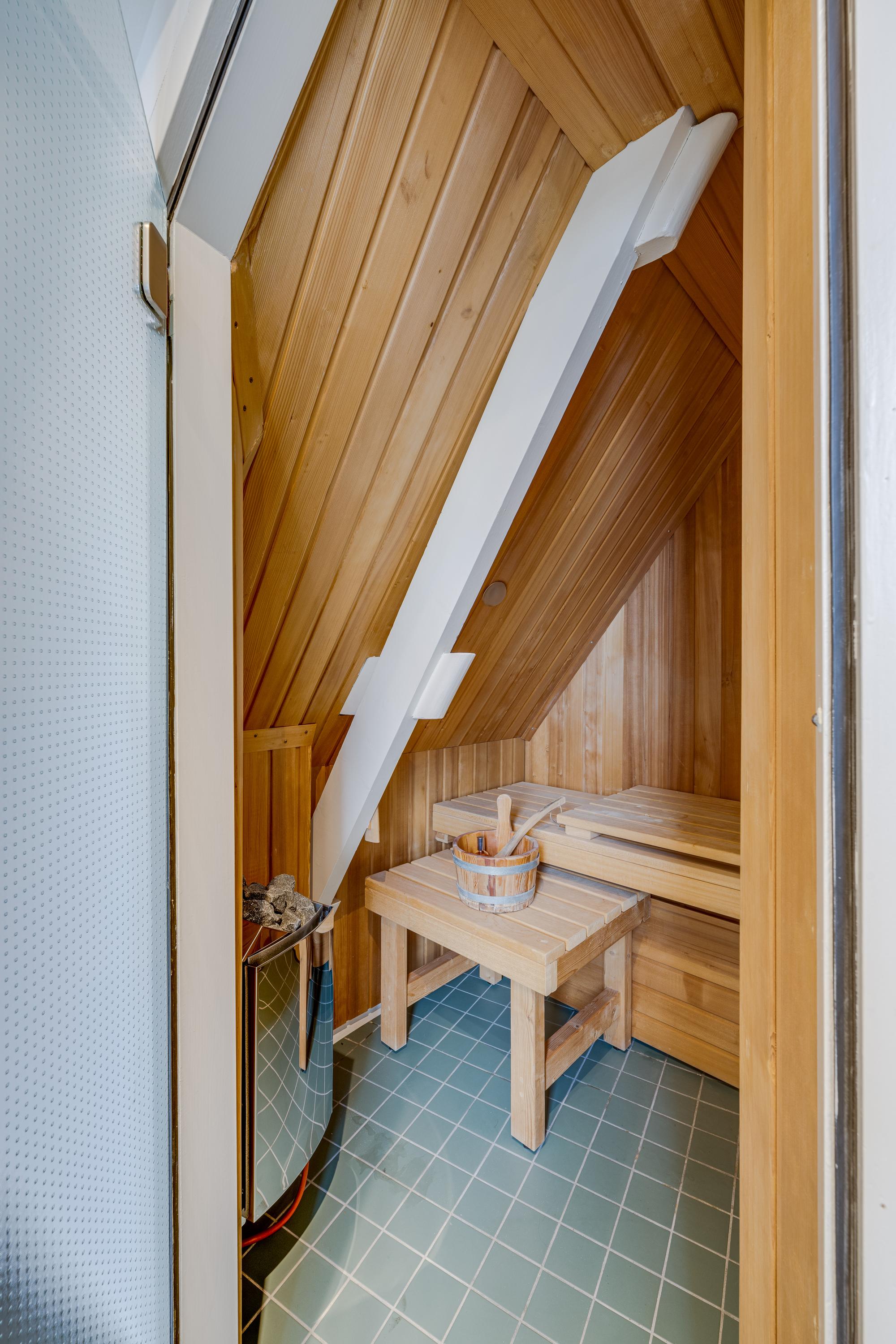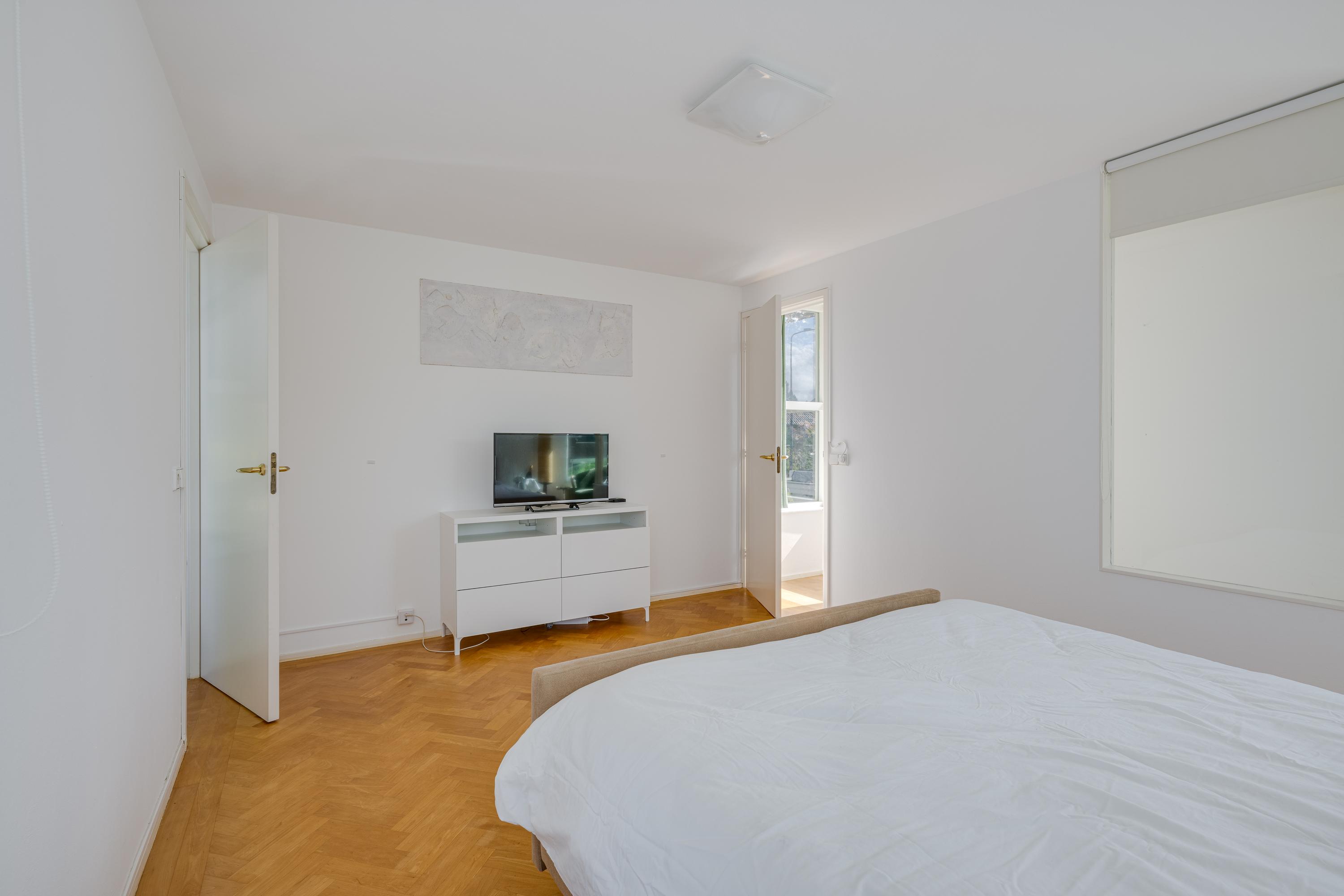 The landing staircase forms the heart of the house and the connection, with an access to a spacious toilet room with wall closet and fountain, to the sleeping floor. Here are three spacious bedrooms with the master bedroom on the water side and walk-in closet. The bedrooms are characterized by the high ceilings and the view of the garden and the water, with the master bedroom standing out because of its size. The bathroom is equipped with every luxury with a granite floor, underfloor heating and 2 washbasins built into natural stone. Not only hygiene, but also relaxation: in addition to a sunken duo bath, a shower room with rain shower and "Turkish bath", sauna, a wall bidet and a wall closet.