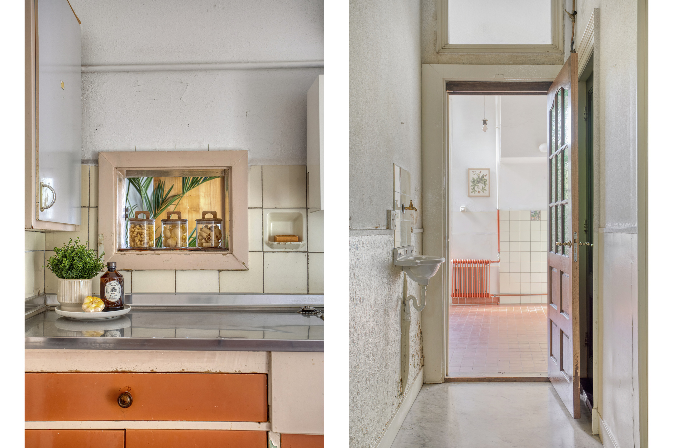Behind its facade, the home preserves the elegance of its era: high ceilings, tall windows, generous detailing in façades, stucco, staircases, and doors. Upon entry, a marble hall with lofted ceilings and stately stairs mediates a calming transition from city pace to interior quiet. The classic living room, with original ensuite doors and ornamental ceilings, opens to a luminous eat-in area and a garden-facing conservatory. Eight bedrooms unfold across the first and second floors, with a study, walk-in closet, and flexible guest or work spaces, accommodating family living or home working.