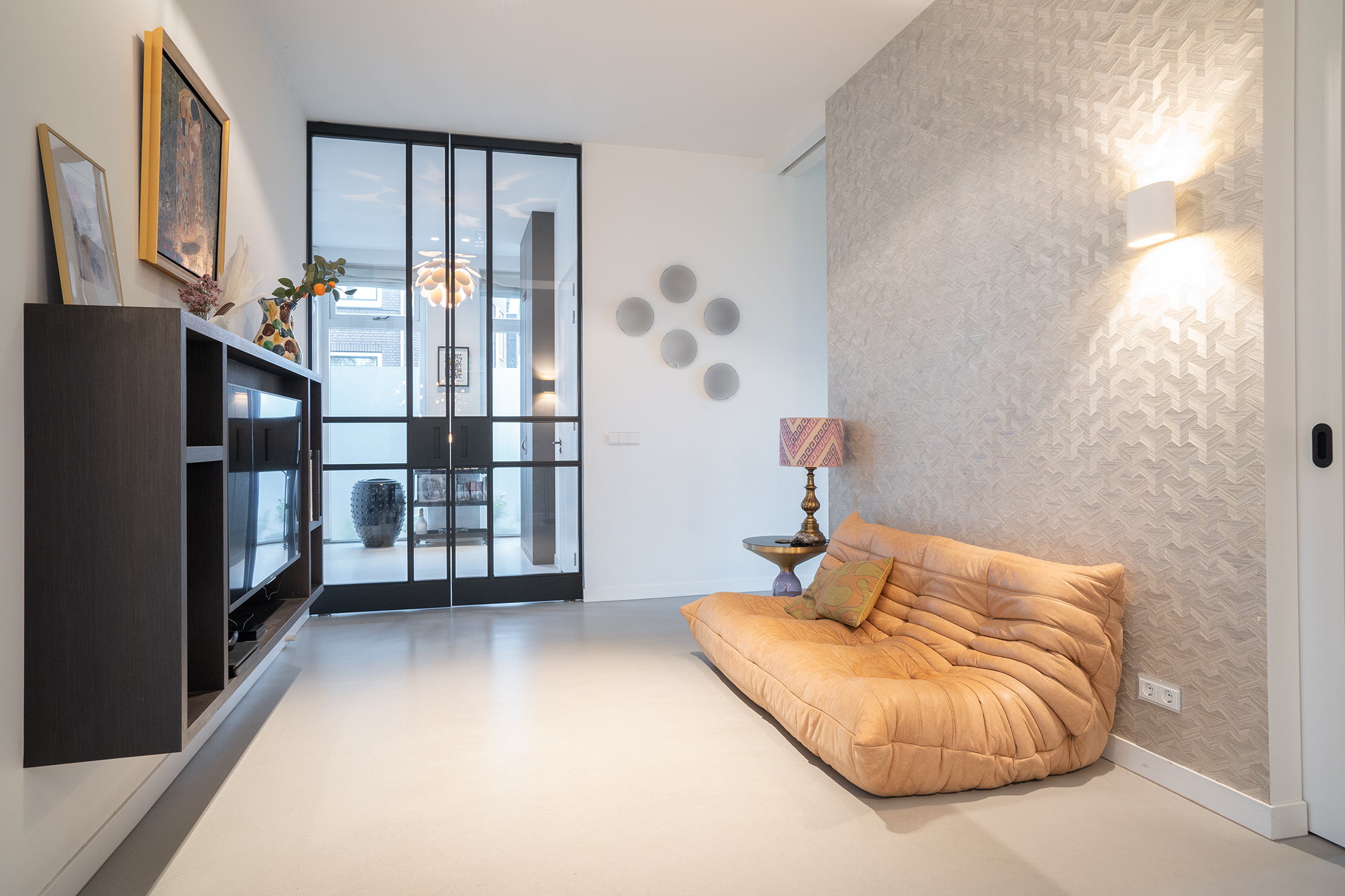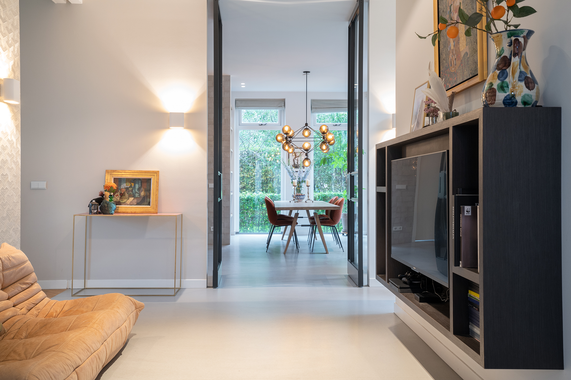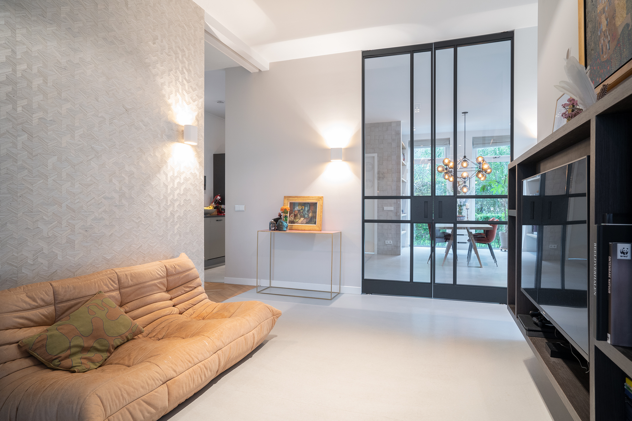 The double garage and wide tiled path lead to the stately front door. The bright, modern hall, featuring luxurious design elements, forms the heart of the home. To the right is the spacious living room, divided into two attractive seating areas by an elegant partition with large white sliding doors. On the sheltered side is a designer concrete floor that continues into the kitchen, and on the other side is a beautiful Hungarian point floor.