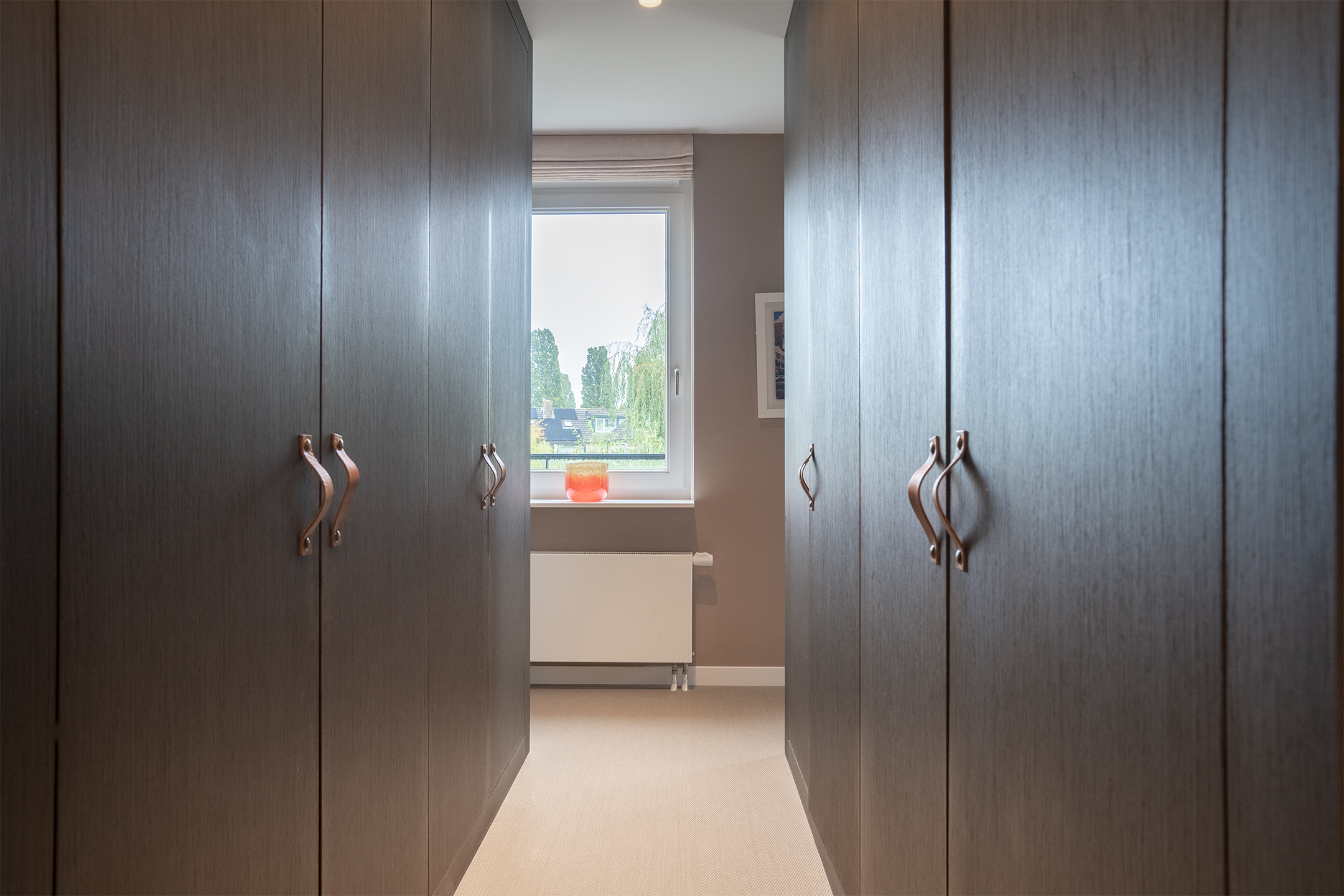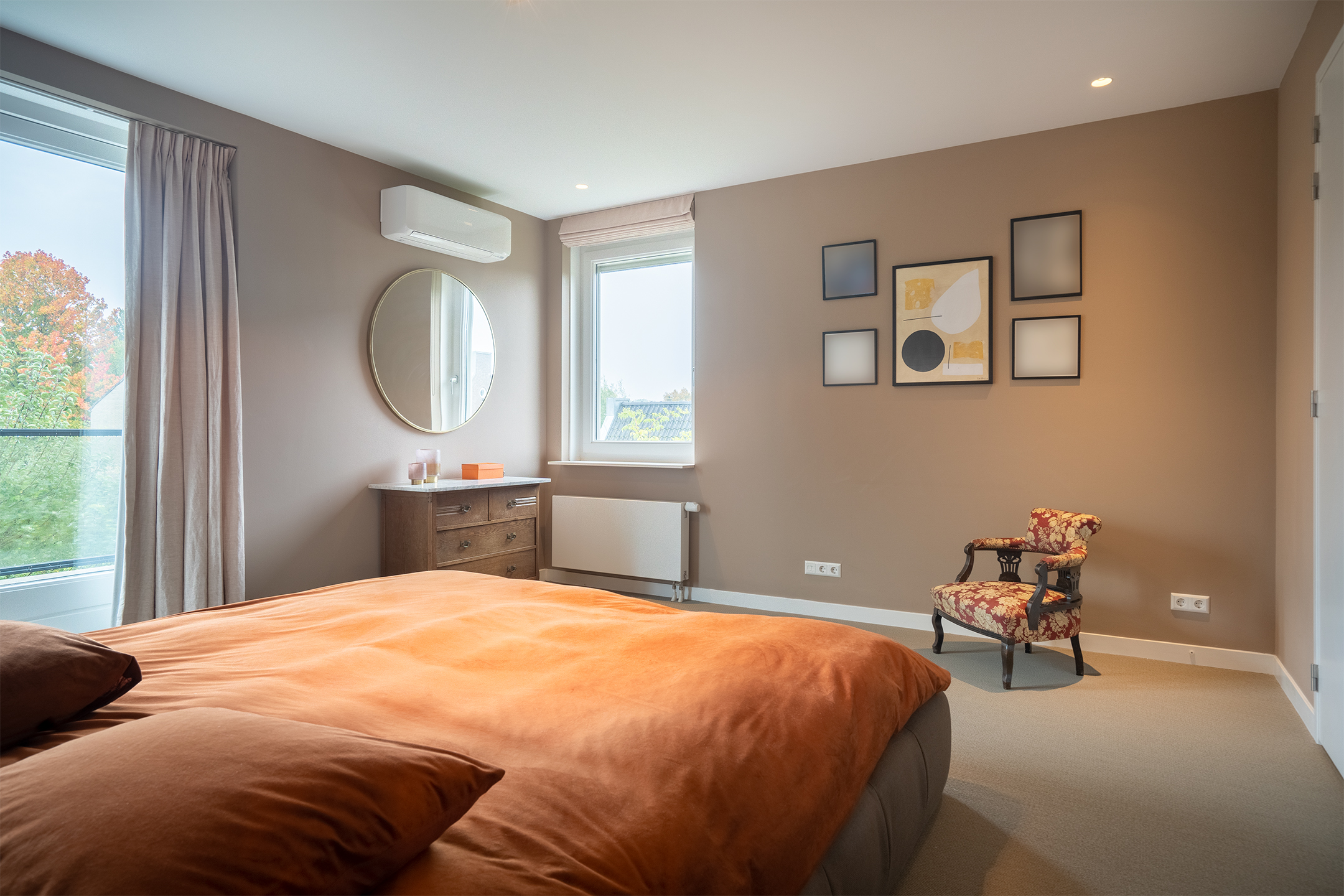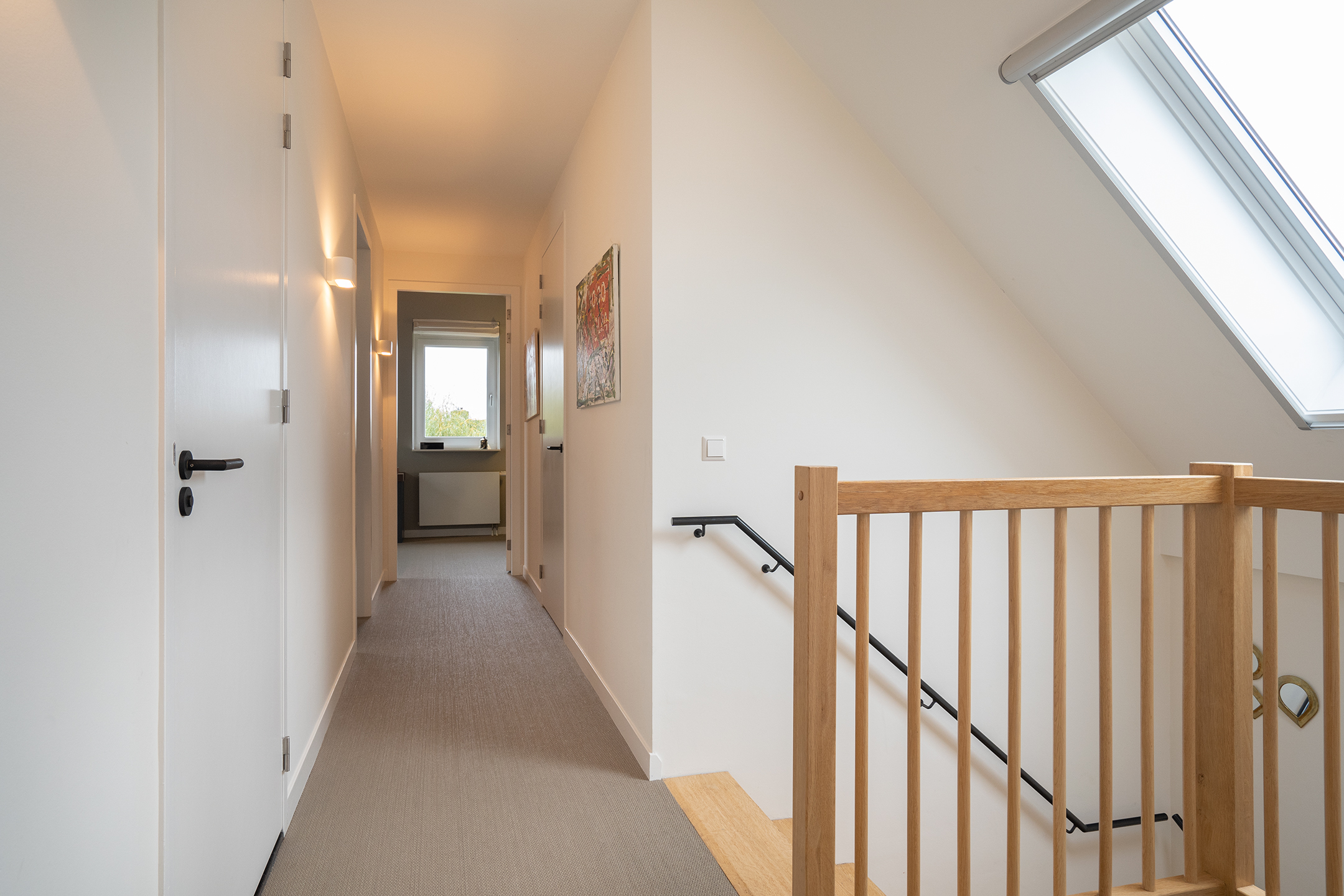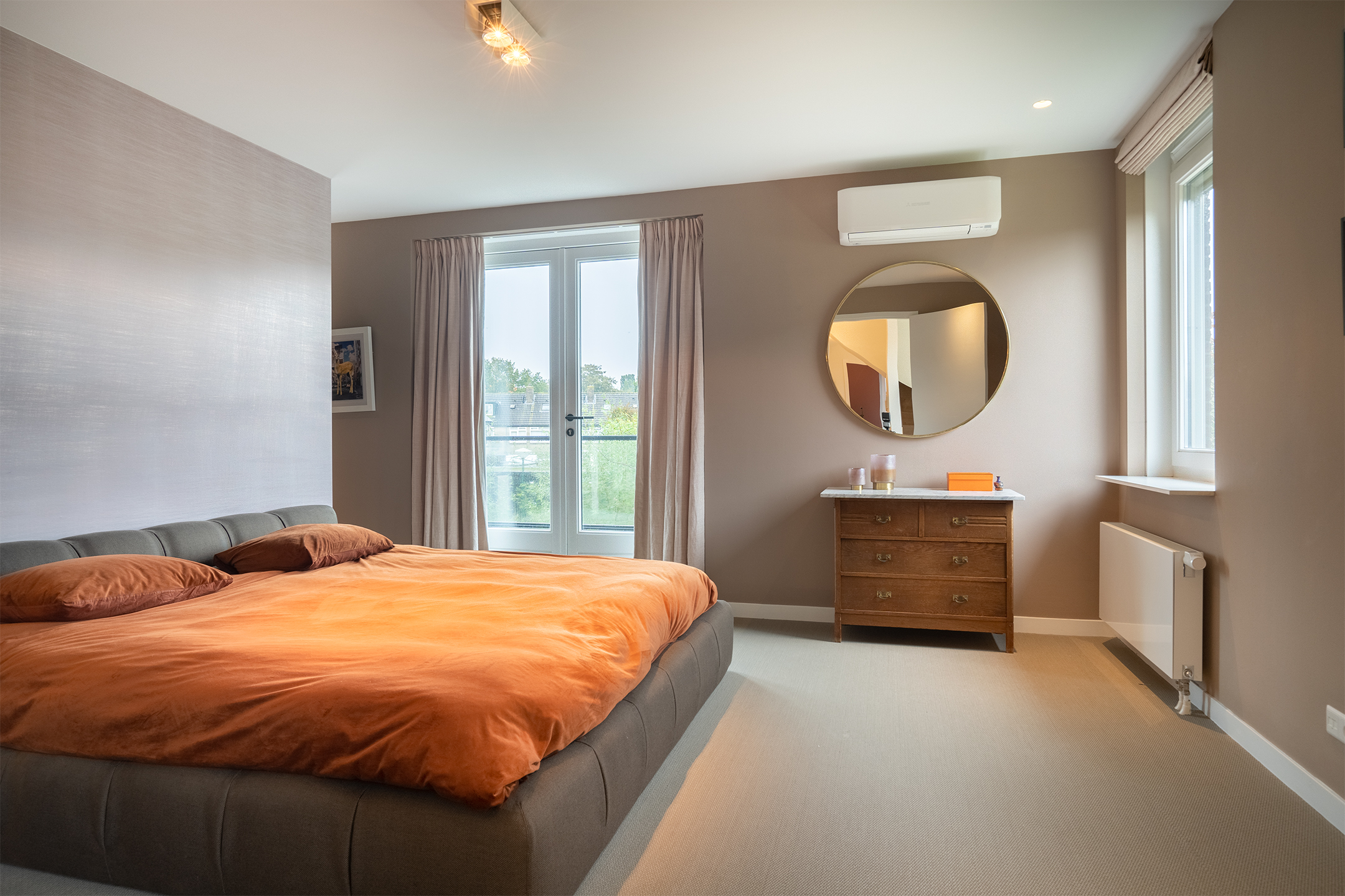 A fixed wooden staircase leads to a spacious landing with five doors: two bedrooms, a separate toilet, a luxurious bathroom, and the master bedroom. The latter is very spacious and not only has access to the large balcony, but also has a partition wall behind which a walk-in closet has been created. You will also find an extra door to the bathroom next to the walk-in closet, which makes it partly ensuite. The balcony, like the windows, faces east, making it a very sunny spot, especially early in the day. The master bedroom is equipped with air conditioning.