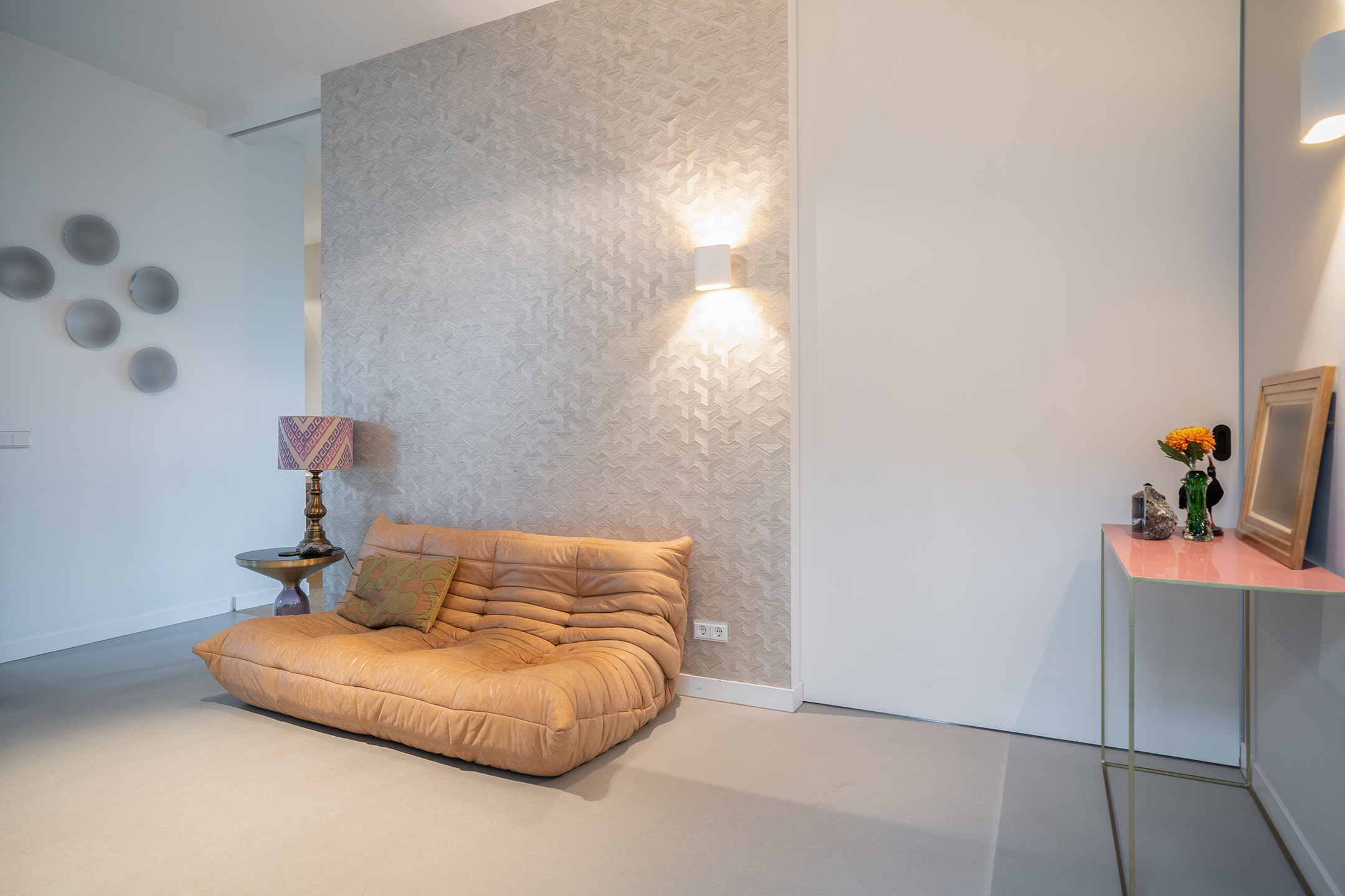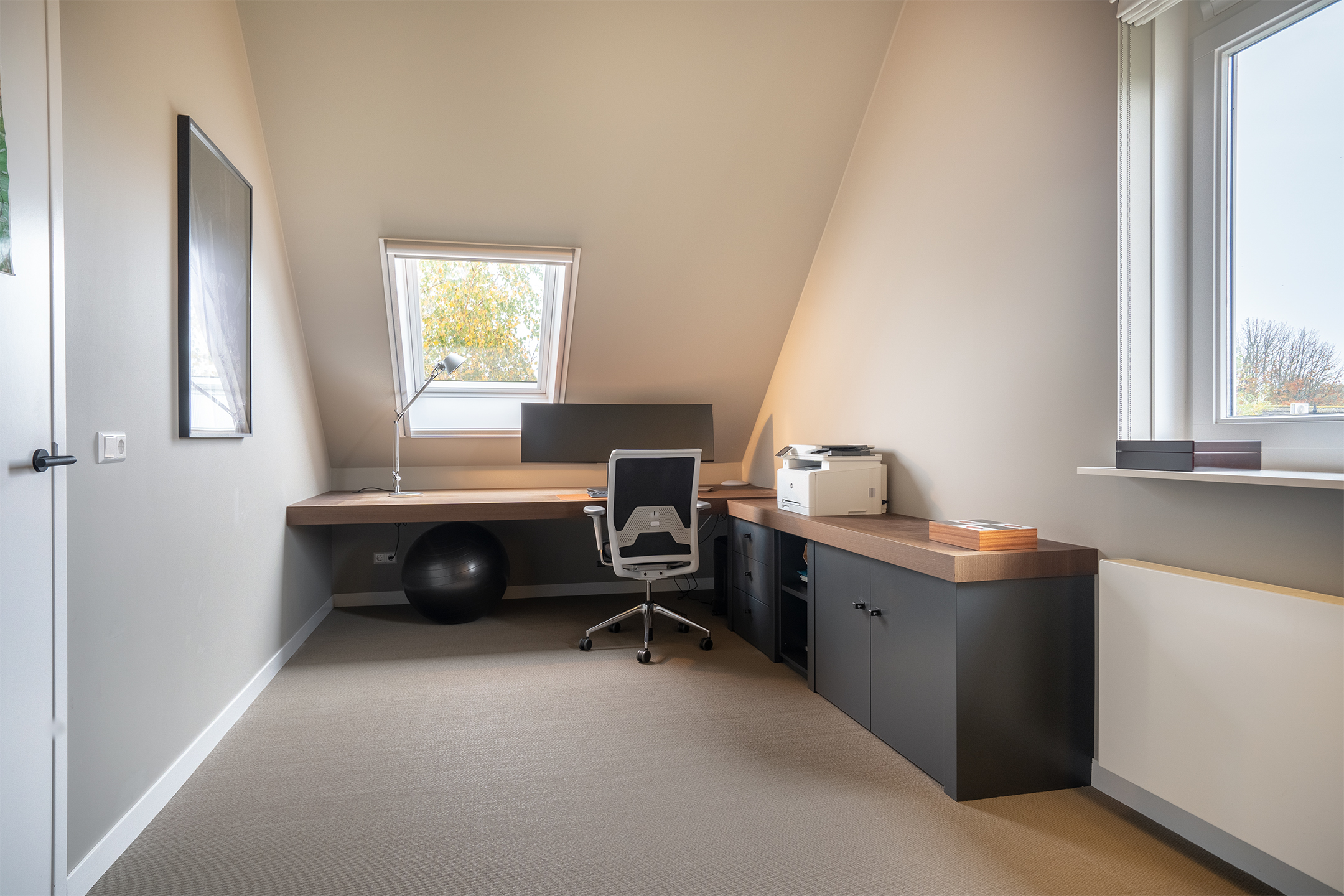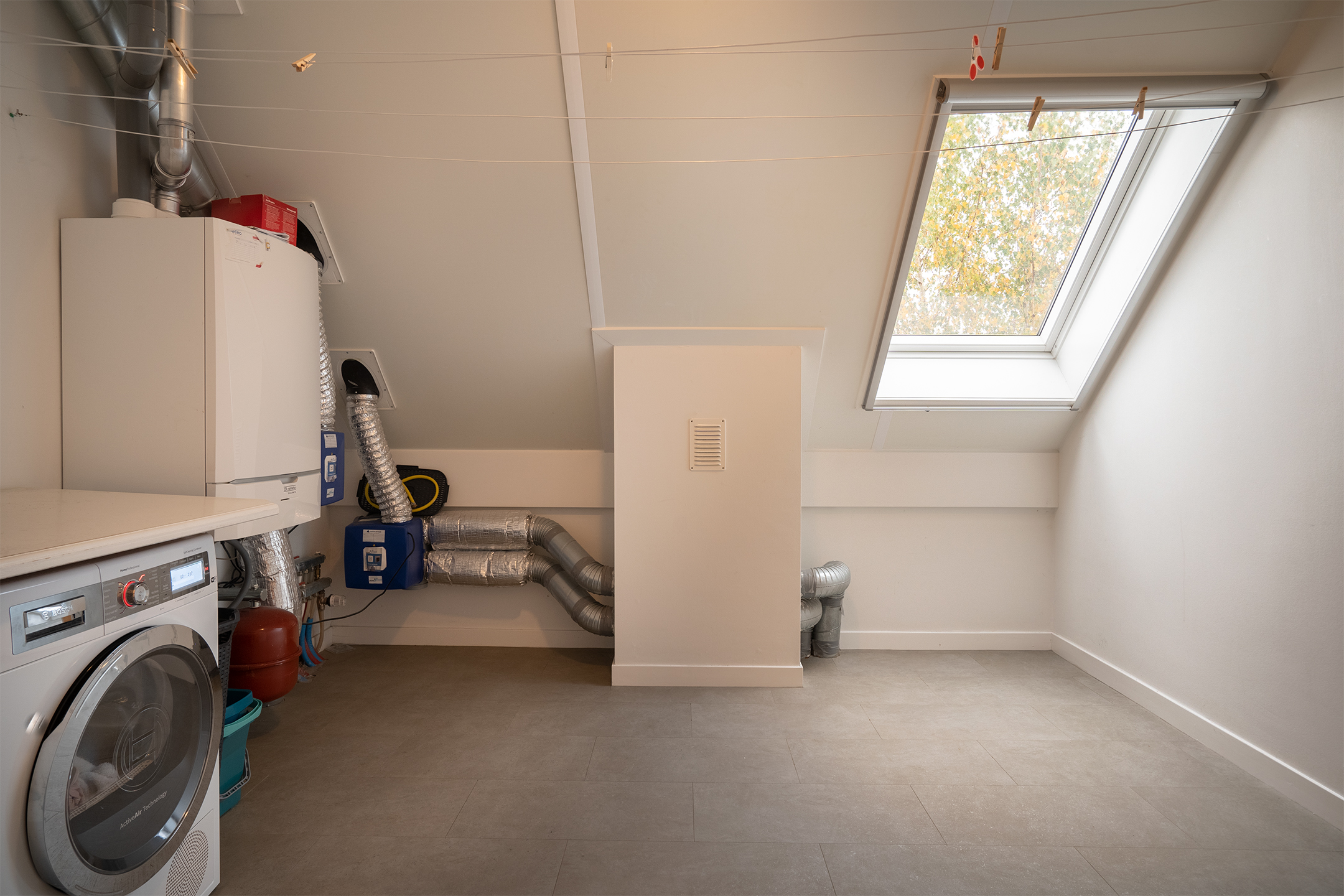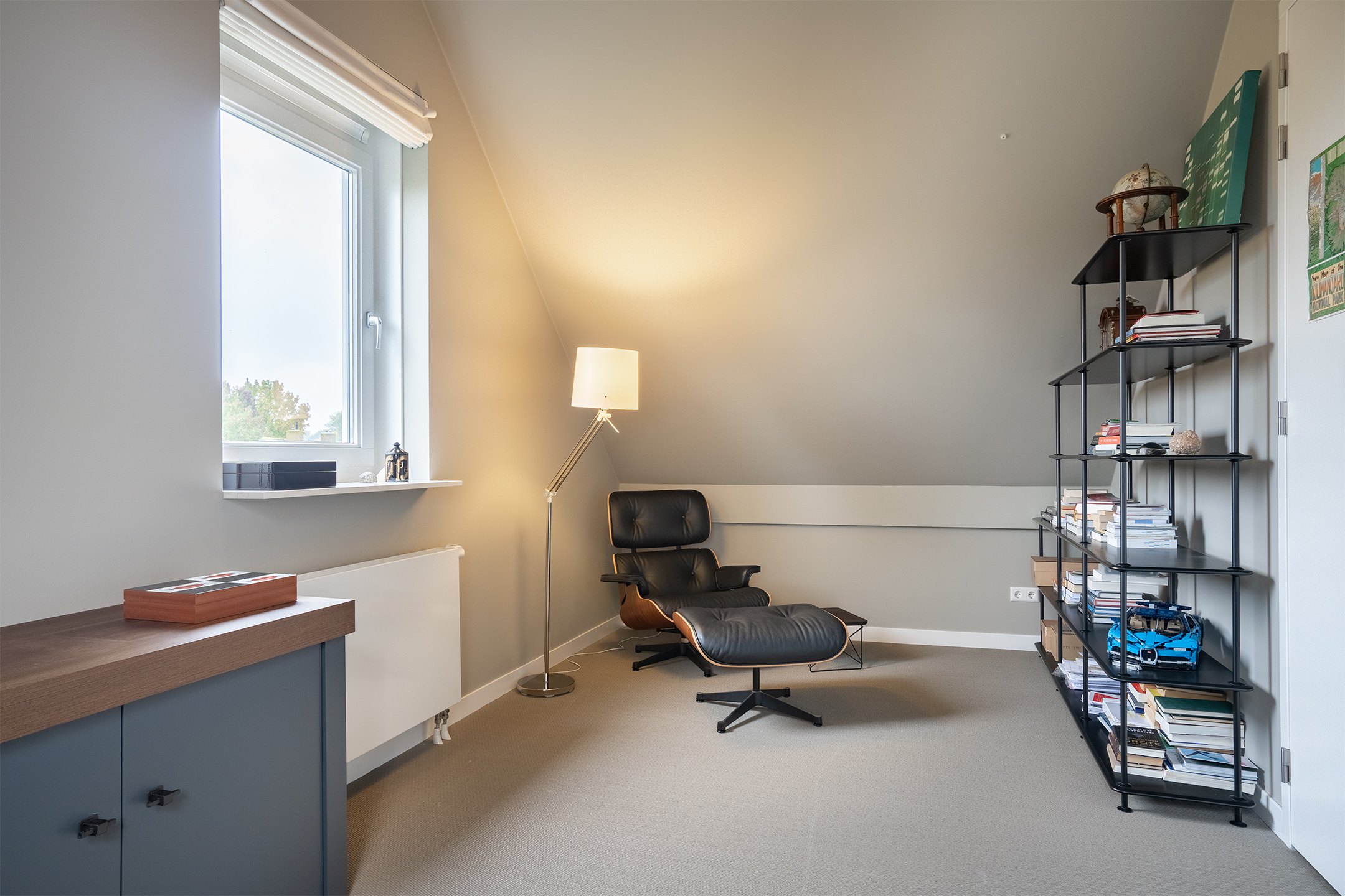 A fixed wooden staircase leads to a spacious landing with five doors: two bedrooms, a separate toilet, a luxurious bathroom, and the master bedroom. The latter is very spacious and not only has access to the large balcony, but also has a partition wall behind which a walk-in closet has been created. You will also find an extra door to the bathroom next to the walk-in closet, which makes it partly ensuite. The balcony, like the windows, faces east, making it a very sunny spot, especially early in the day. The master bedroom is equipped with air conditioning.