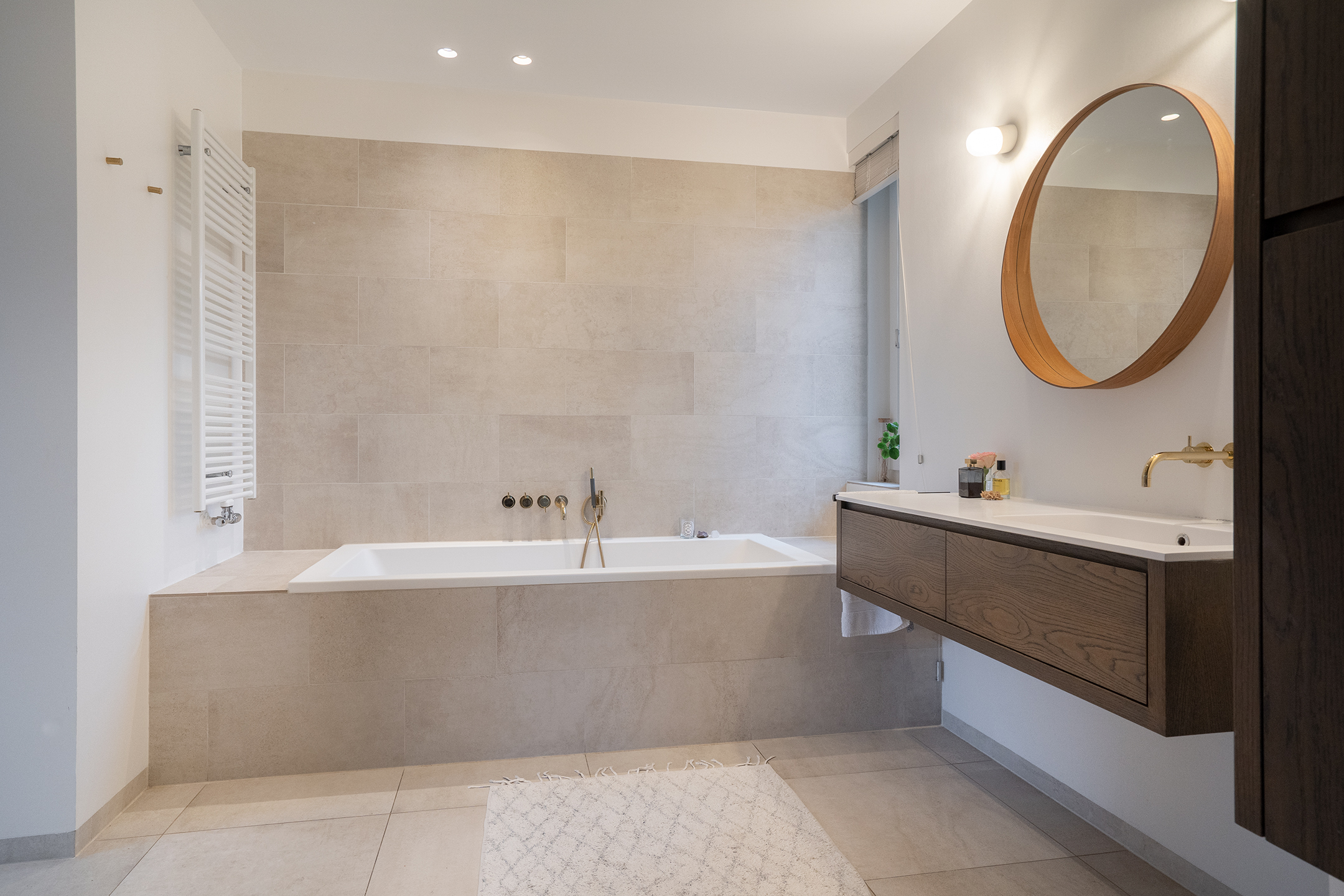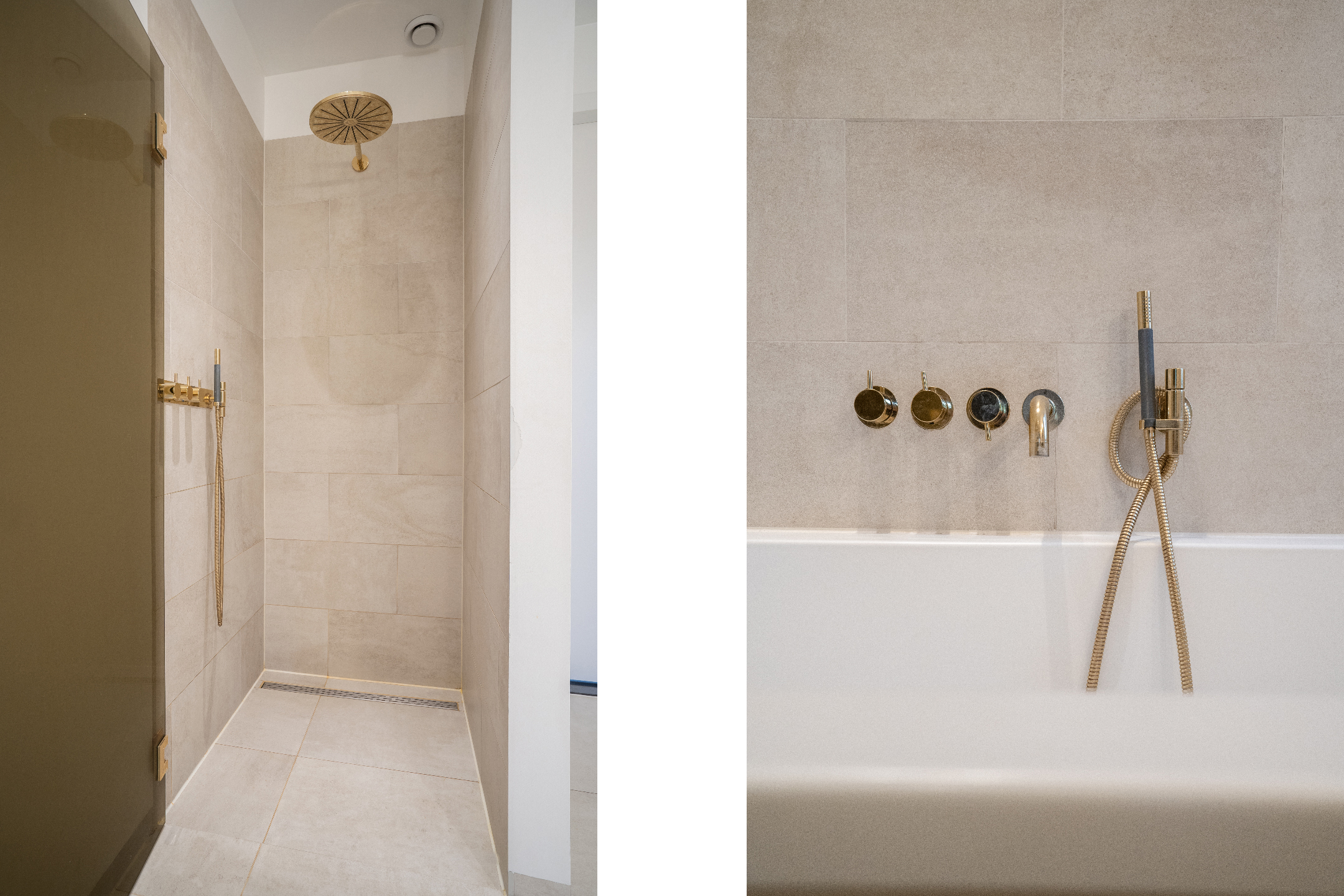 The adjoining bathroom is also very spacious and has a sleek finish. With sleek white walls and large light gray tiles on the back wall of the bathtub and walk-in shower as well as on the floor, it also looks very luxurious. The bathtub is spacious and the shower has both a handheld and rain shower, both of which are gold-plated VOLA taps, as are the other taps. There is also a long, rectangular sink in a wooden design cabinet.