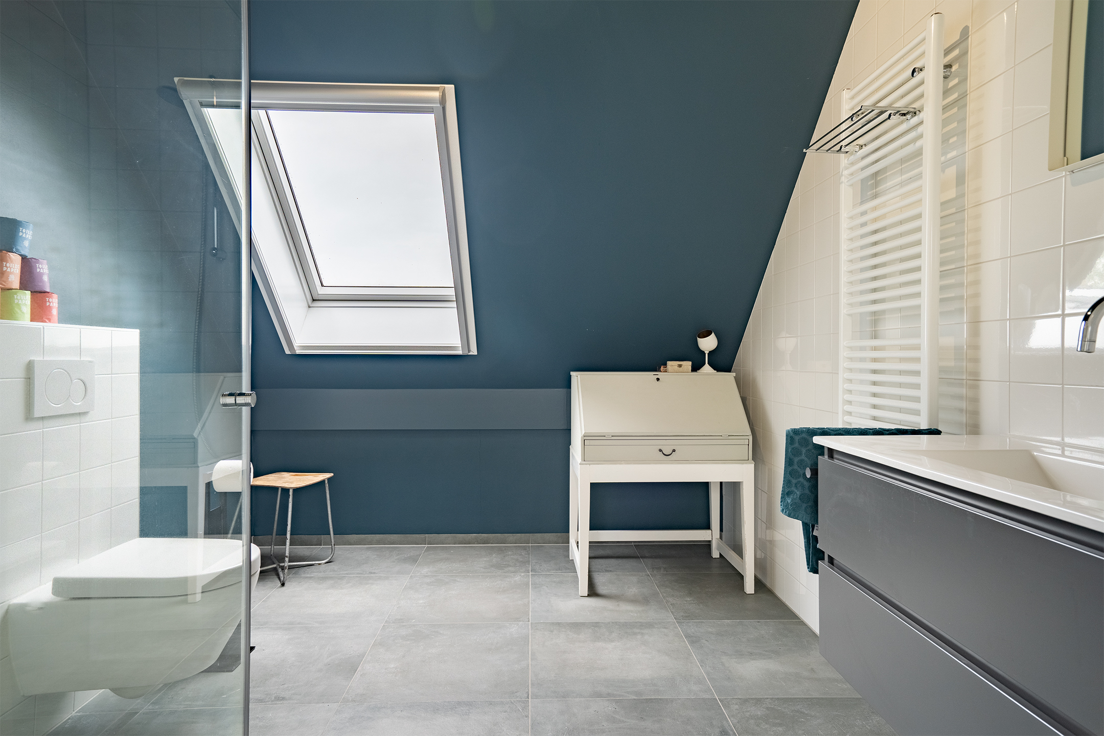 Here, too, the bedrooms are located at the front and rear, resulting in two very spacious rooms. In addition, the roof only starts above knee height, which means that despite the sloping roof, there is still plenty of living space.