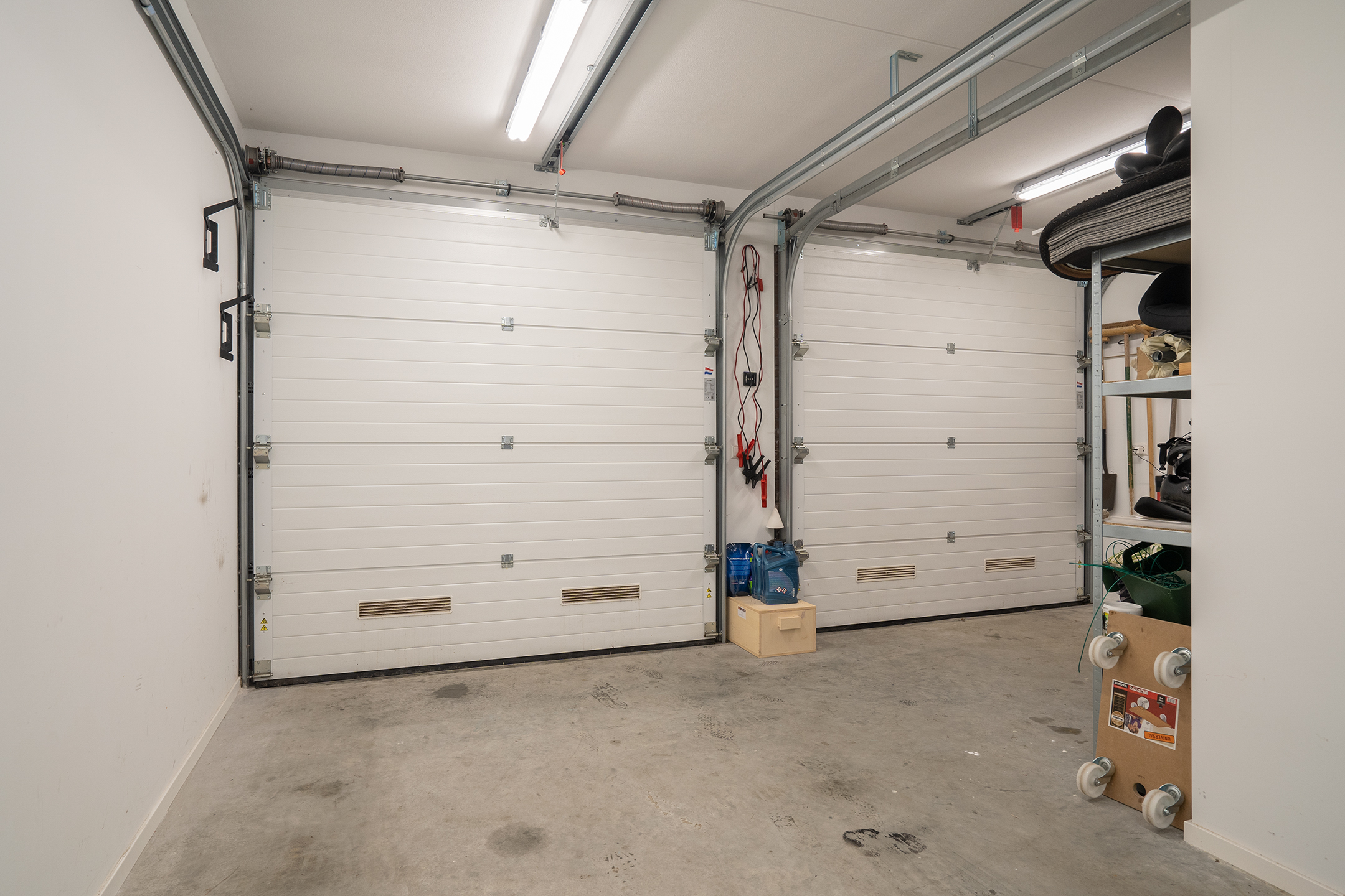 The spacious and well-insulated double garage/outbuilding with its own entrance has its own attic floor, which is currently used as a practice room. However, this floor is also ideal as a guest room or living space for an au pair, thanks in part to the presence of its own shower room, toilet, and central heating boiler.