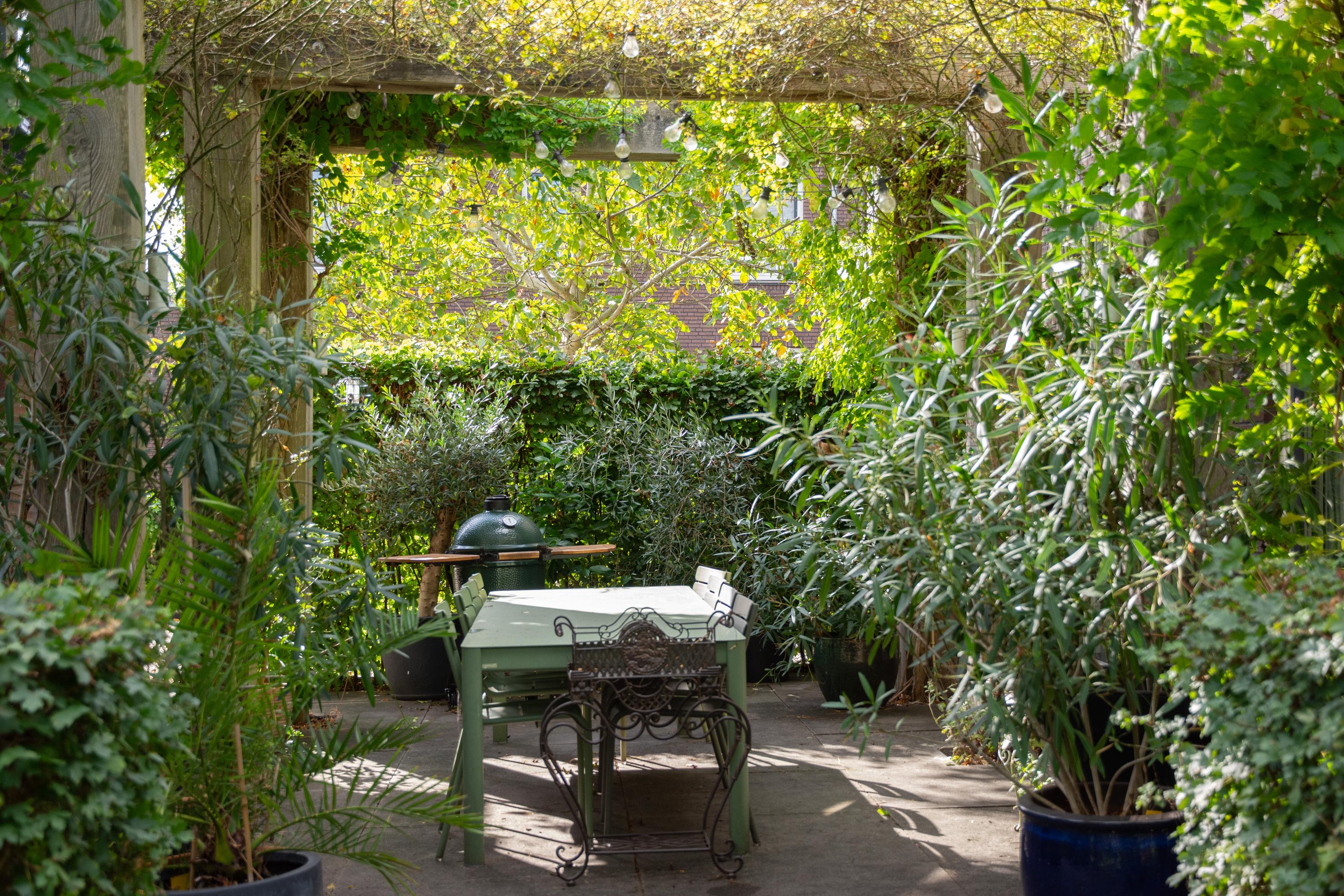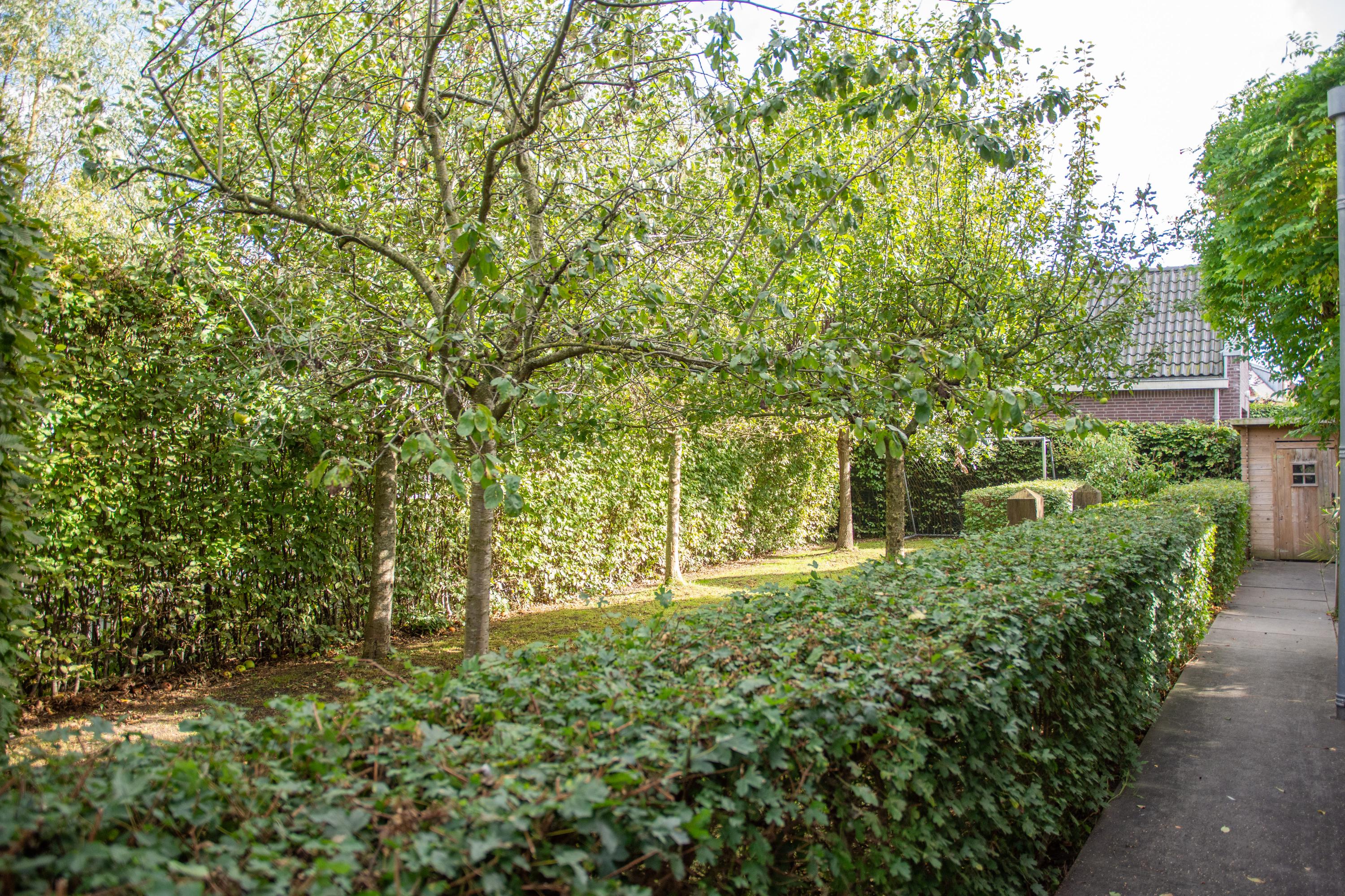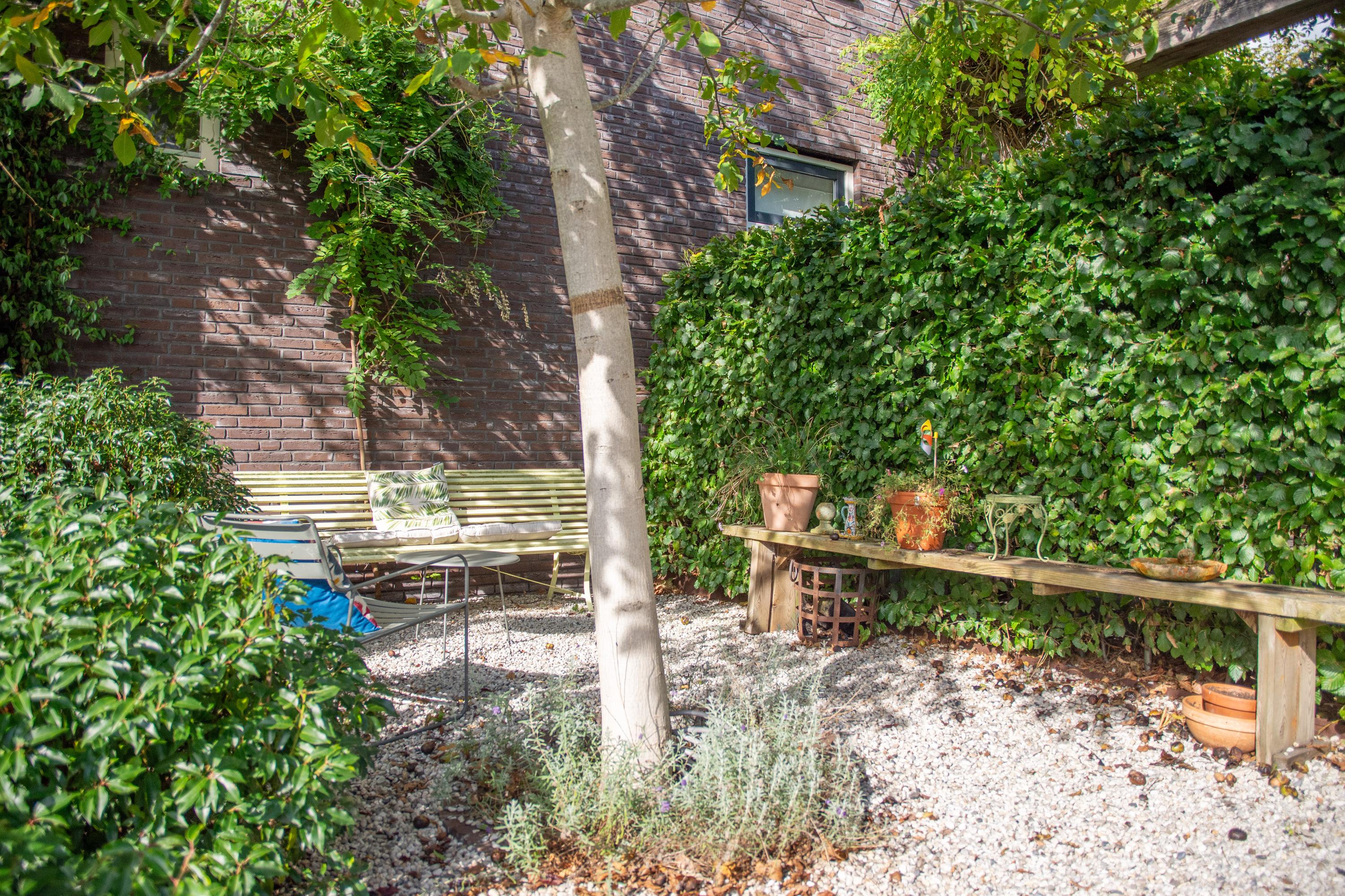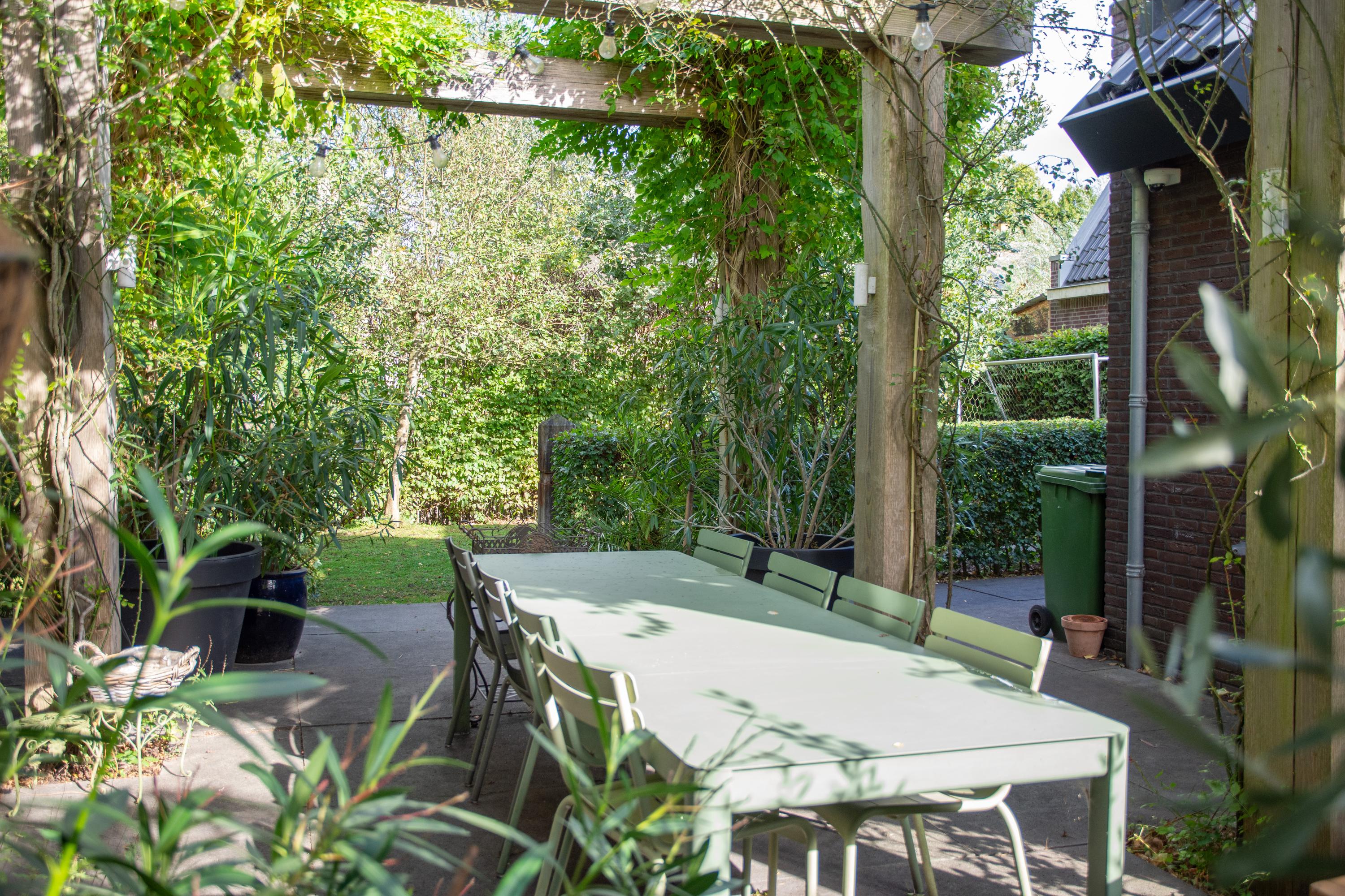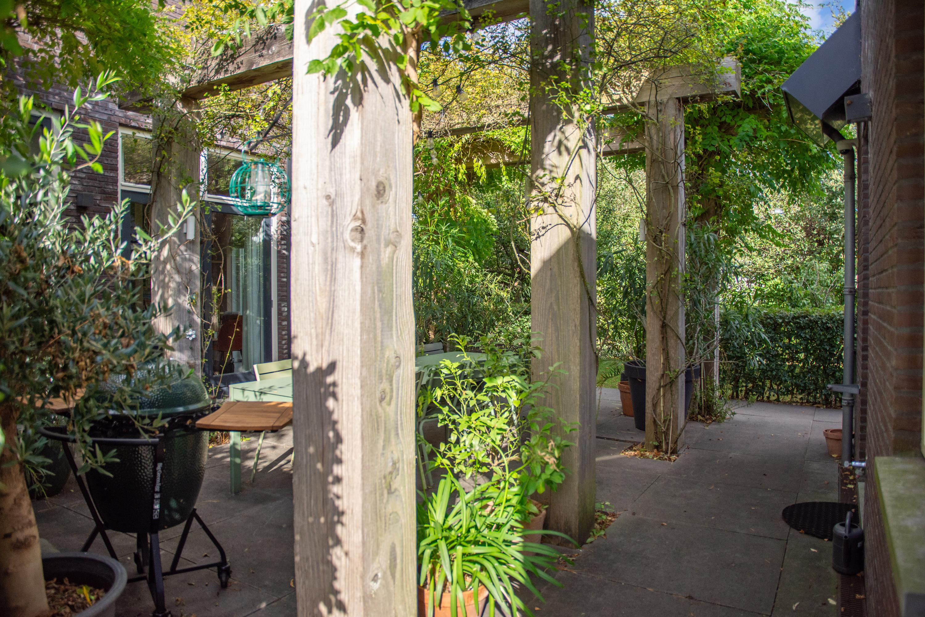 The house is surrounded by a beautifully maintained garden with a lawn, surrounded by trees and a neat hedge. Between the house and the garage is a tiled terrace with a sturdy, overgrown pergola where you can sit outside in style.
