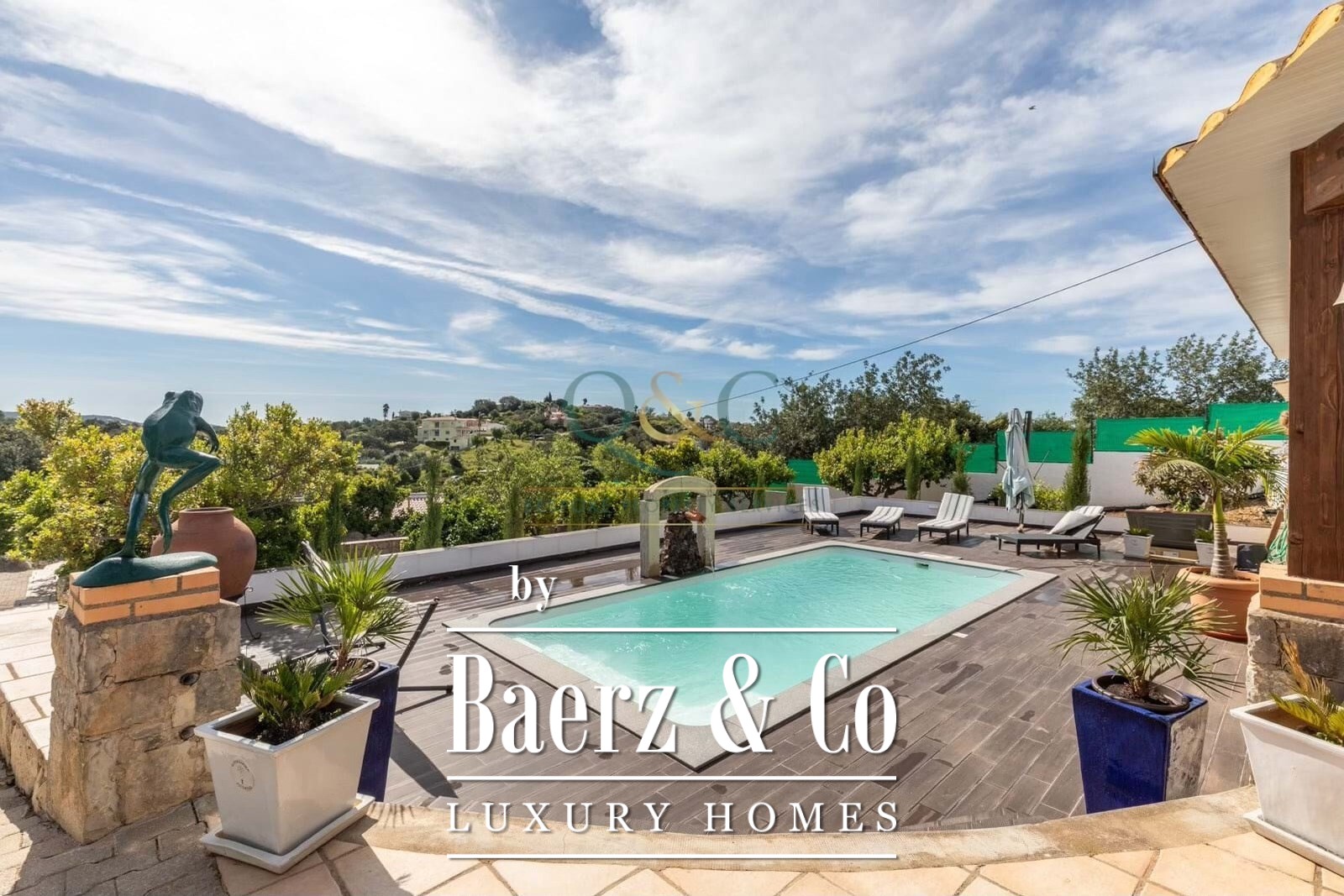 Outdoors, the scene shifts to a private pool enveloped by spacious terraces, set within a 1,950 m² plot that offers both countryside and pool views. With amenities including a garage, ample parking, mains water, and borehole, this villa effortlessly supports an elevated pace of life amidst the tranquil surroundings of Loulé São Clemente.