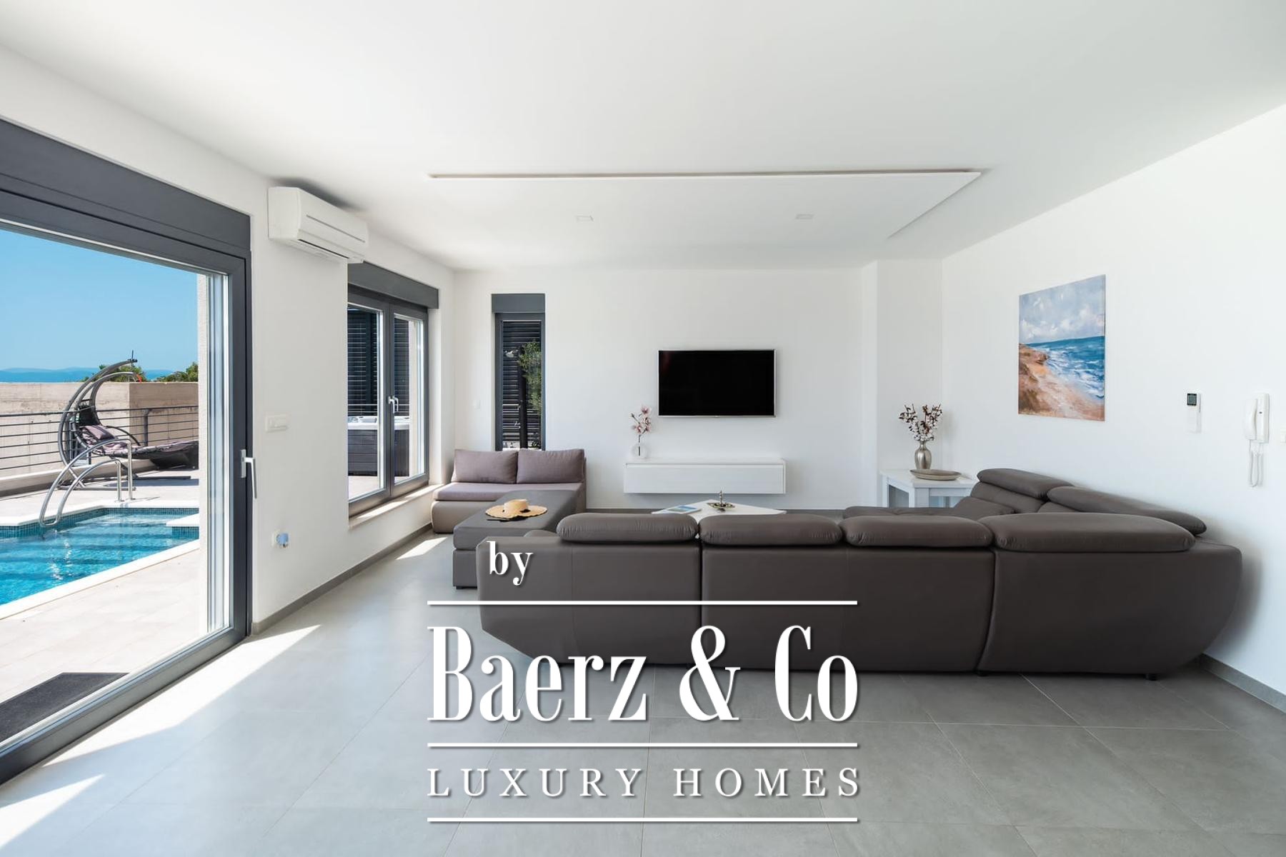 Villa Makarska occupies an elevated position, delivering panoramic views across the sea and the historic town below. This villa in Makarska stretches across 450 m² of living space, integrated into a 448 m² plot that articulates a clear connection between interior and exterior living. The south-facing orientation ensures constant natural light in every principal room, enriching daily life with views that shift from dawn to evening.