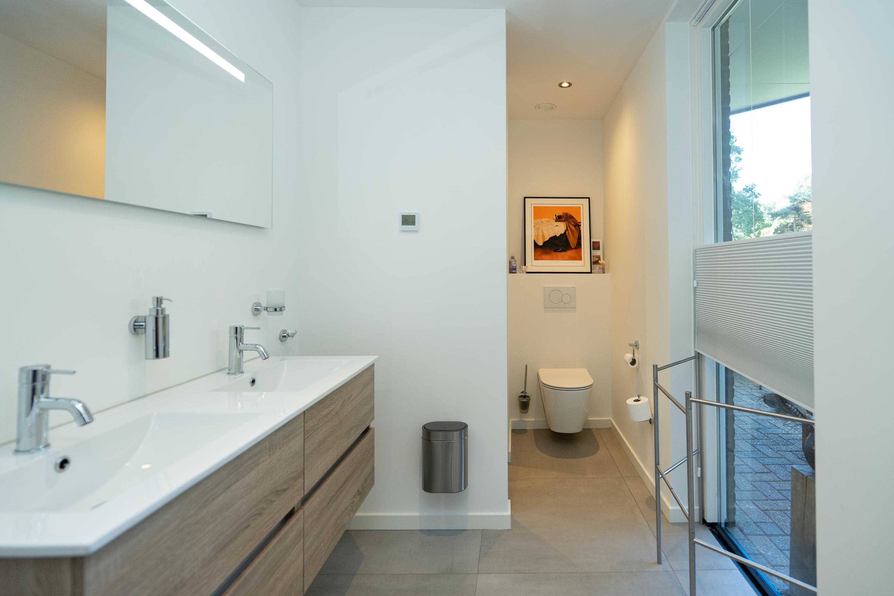 Entrance hall, spacious hall that immediately emphasises the spacious character of the house. The hall contains the meter cupboard, loft and the first toilet with washbasin. A spacious living room with high ceiling, where the many windows on all sides provide beautiful light and an open atmosphere. There are sliding doors to the front and back gardens at both the front and rear. There is also a spacious indoor storage room under the stairs and the staircase itself is beautifully concealed. Modern open kitchen with a large cooking island. The tall cabinets are beautifully concealed in the wall and the kitchen is equipped with various luxury built-in appliances. The utility room is located at the front of the house and has a kitchen unit, heat pump and boiler, and an extra outside door.