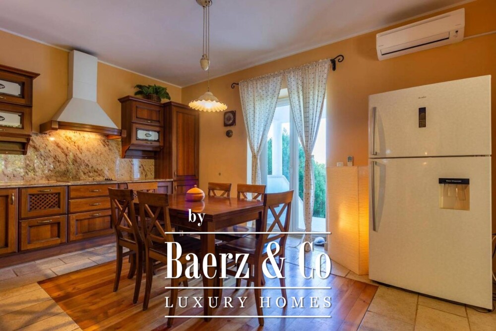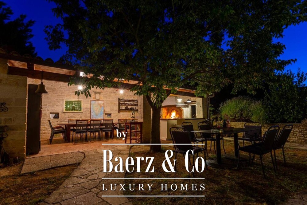 Villa Marčana with pool and wine cellar is set on 3,120 m² of land, providing a restrained sanctuary on the west coast of the bay of Raš. This property offers 452 m² of living space, balancing expansive proportions with privacy and quietude, making it an attractive destination for those who seek an escape from daily routines. The villa’s architecture unfolds across two levels, anchored by solid wood furniture, hand-forged railings, and stone-clad columns. Entering through a glass lobby, the living room is designed around a fireplace, opening to spacious terraces and the private pool. A rustic kitchen and dining area, along with two ground-floor bedrooms with private bathrooms and a guest toilet, establish the home’s ease of flow. The first floor brings three more bedrooms, two bathrooms, and a separate apartment featuring two further bedrooms, a living room, a bathroom, and independent terrace access. The apartment can be entered from the main house or externally. Amenities including a sauna, fully equipped summer kitchen, children’s playground, and a dedicated wine cellar extend the property’s comfort. Floor-to-ceiling gas central heating and air conditioning ensure seasonal balance. This villa in Marčana offers hedonistic enjoyment and opportunity for calm, inviting its next owner to experience the tranquility and easy pleasures of life in Croatia.